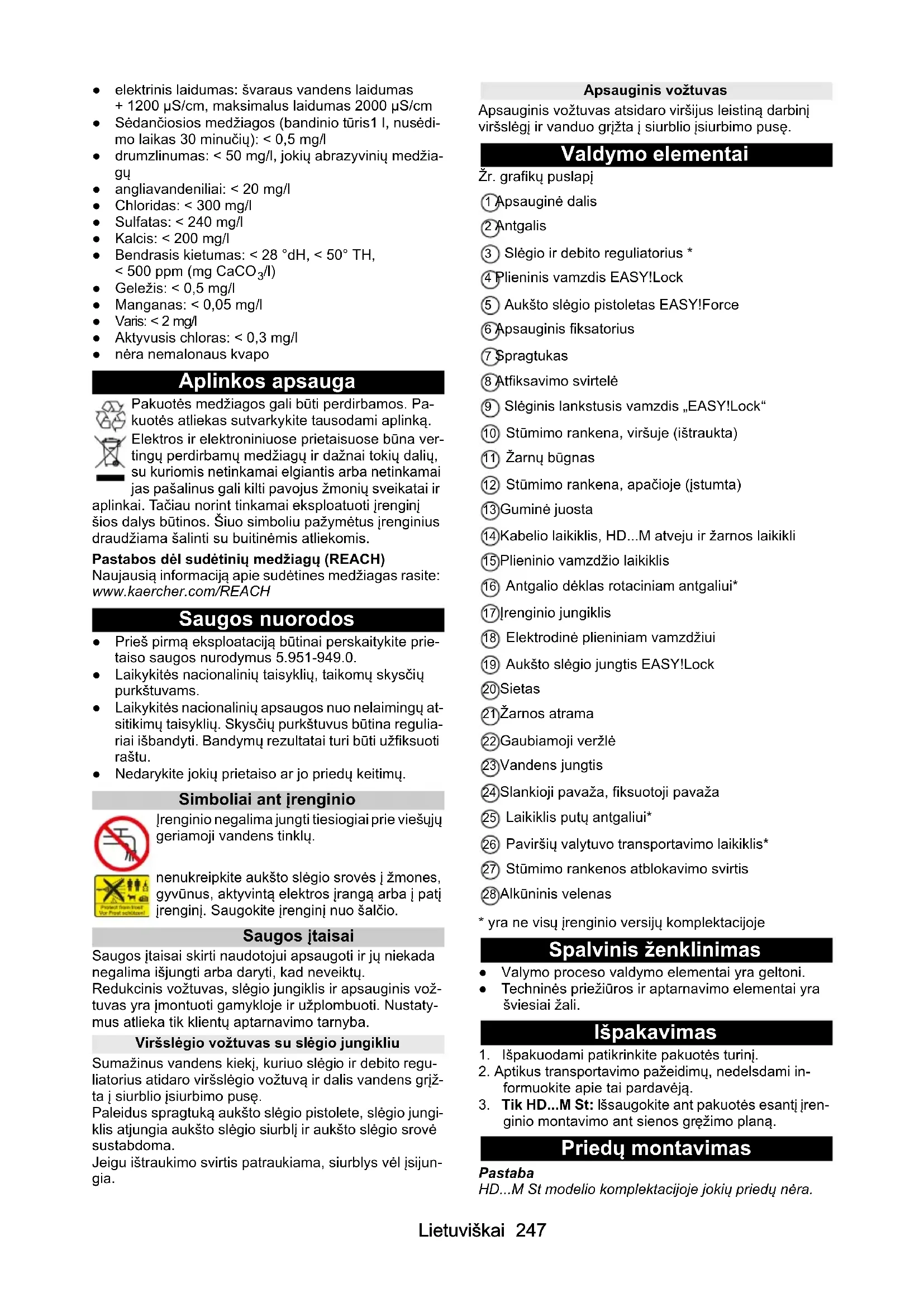 /l) ● Geležis: < 0,5 mg/l ● Manganas: < 0,05 mg/l ● Varis: < 2 mg/l ● Aktyvusis chloras: < 0,3 mg/l ● nėra nemalonaus kvapo Aplinkos apsauga Pakuotės medžiagos gali būti perdirbamos. Pa- kuotės atliekas sutvarkykite tausodami aplinką. Elektros ir elektroniniuose prietaisuose būna ver- tingų perdirbamų medžiagų ir dažnai tokių dalių, su kuriomis netinkamai elgiantis arba netinkamai jas pašalinus gali kilti pavojus žmonių sveikatai ir aplinkai. Tačiau norint tinkamai eksploatuoti įrenginį šios dalys būtinos. Šiuo simboliu pažymėtus įrenginius draudžiama šalinti su buitinėmis atliekomis. Pastabos dėl sudėtinių medžiagų (REACH) Naujausią informaciją apie sudėtines medžiagas rasite: www.kaercher.com/REACH Saugos nuorodos ● Prieš pirmą eksploataciją būtinai perskaitykite prie- taiso saugos nurodymus 5.951-949.0. ● Laikykitės nacionalinių taisyklių, taikomų skysčių purkštuvams. ● Laikykitės nacionalinių apsaugos nuo nelaimingų at- sitikimų taisyklių. Skysčių purkštuvus būtina regulia- riai išbandyti. Bandymų rezultatai turi būti užfiksuoti raštu. ● Nedarykite jokių prietaiso ar jo priedų keitimų. Simboliai ant įrenginio Įrenginio negalima jungti tiesiogiai prie viešųjų geriamoji vandens tinklų. nenukreipkite aukšto slėgio srovės į žmones, gyvūnus, aktyvintą elektros įrangą arba į patį įrenginį. Saugokite įrenginį nuo šalčio. Saugos įtaisai Saugos įtaisai skirti naudotojui apsaugoti ir jų niekada negalima išjungti arba daryti, kad neveiktų. Redukcinis vožtuvas, slėgio jungiklis ir apsauginis vož- tuvas yra įmontuoti gamykloje ir užplombuoti. Nustaty- mus atlieka tik klientų aptarnavimo tarnyba. Viršslėgio vožtuvas su slėgio jungikliu Sumažinus vandens kiekį, kuriuo slėgio ir debito regu- liatorius atidaro viršslėgio vožtuvą ir dalis vandens grįž- ta į siurblio įsiurbimo pusę. Paleidus spragtuką aukšto slėgio pistolete, slėgio jungi- klis atjungia aukšto slėgio siurblį ir aukšto slėgio srovė sustabdoma. Jeigu ištraukimo svirtis patraukiama, siurblys vėl įsijun- gia. Apsauginis vožtuvas Apsauginis vožtuvas atsidaro viršijus leistiną darbinį viršslėgį ir vanduo grįžta į siurblio įsiurbimo pusę. Valdymo elementai Žr. grafikų puslapį 1 Apsauginė dalis 2 Antgalis 3 Slėgio ir debito reguliatorius * 4 Plieninis vamzdis EASY!Lock 5 Aukšto slėgio pistoletas EASY!Force 6 Apsauginis fiksatorius 7 Spragtukas 8 Atfiksavimo svirtelė 9 Slėginis lankstusis vamzdis „EASY!Lock“ 10 Stūmimo rankena, viršuje (ištraukta) 11 Žarnų būgnas 12 Stūmimo rankena, apačioje (įstumta) 13 Guminė juosta 14 Kabelio laikiklis, HD...M atveju ir žarnos laikikli 15 Plieninio vamzdžio laikiklis 16 Antgalio dėklas rotaciniam antgaliui* 17 Įrenginio jungiklis 18 Elektrodinė plieniniam vamzdžiui 19 Aukšto slėgio jungtis EASY!Lock 20 Sietas 21 Žarnos atrama 22 Gaubiamoji veržlė 23 Vandens jungtis 24 Slankioji pavaža, fiksuotoji pavaža 25 Laikiklis putų antgaliui* 26 Paviršių valytuvo transportavimo laikiklis* 27 Stūmimo rankenos atblokavimo svirtis 28 Alkūninis velenas