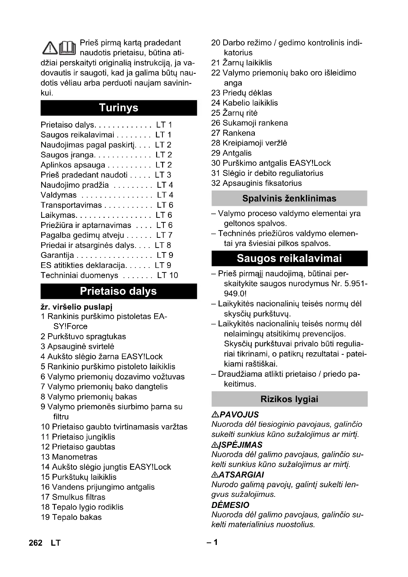 - 1.286-902.0: 75,5 kg; 1.286-903.0: 75,7 kg; 1.286-913.0: 69,1 kg; 1.286-927: 82,5 kg ** 1.286-914.0: 77,5 kg; 1.286-928.0: 86 kg 261LV– 1 Prieš pirmą kartą pradedant naudotis prietaisu, būtina ati- džiai perskaityti originalią instrukciją, ja va- dovautis ir saugoti, kad ja galima būtų nau- dotis vėliau arba perduoti naujam savinin- kui. žr. viršelio puslapį 1 Rankinis purškimo pistoletas EA- SY!Force 2 Purkštuvo spragtukas 3 Apsauginė svirtelė 4 Aukšto slėgio žarna EASY!Lock 5 Rankinio purškimo pistoleto laikiklis 6 Valymo priemonių dozavimo vožtuvas 7 Valymo priemonių bako dangtelis 8 Valymo priemonių bakas 9 Valymo priemonës siurbimo þarna su filtru 10 Prietaiso gaubto tvirtinamasis varžtas 11 Prietaiso jungiklis 12 Prietaiso gaubtas 13 Manometras 14 Aukšto slėgio jungtis EASY!Lock 15 Purkštukų laikiklis 16 Vandens prijungimo antgalis 17 Smulkus filtras 18 Tepalo lygio rodiklis 19 Tepalo bakas 20 Darbo režimo / gedimo kontrolinis indi- katorius 21 Žarnų laikiklis 22 Valymo priemonių bako oro išleidimo anga 23 Priedų dėklas 24 Kabelio laikiklis 25 Žarnų ritė 26 Sukamoji rankena 27 Rankena 28 Kreipiamoji veržlė 29 Antgalis 30 Purškimo antgalis EASY!Lock 31 Slėgio ir debito reguliatorius 32 Apsauginis fiksatorius – Valymo proceso valdymo elementai yra geltonos spalvos. – Techninės priežiūros valdymo elemen- tai yra šviesiai pilkos spalvos. – Prieš pirmąjį naudojimą, būtinai per- skaitykite saugos nurodymus Nr. 5.951- 949.0! – Laikykitės nacionalinių teisės normų dėl skysčių purkštuvų. – Laikykitės nacionalinių teisės normų dėl nelaimingų atsitikimų prevencijos. Skysčių purkštuvai privalo būti regulia- riai tikrinami, o patikrų rezultatai - patei- kiami raštiškai. – Draudžiama atlikti prietaiso / priedo pa- keitimus. PAVOJUS Nuoroda dėl tiesioginio pavojaus, galinčio sukelti sunkius kūno sužalojimus ar mirtį. 몇 ĮSPĖJIMAS Nuoroda dėl galimo pavojaus, galinčio su- kelti sunkius kūno sužalojimus ar mirtį. 몇 ATSARGIAI Nurodo galimą pavojų, galintį sukelti len- gvus sužalojimus. DĖMESIO Nuoroda dėl galimo pavojaus, galinčio su- kelti materialinius nuostolius. Turinys Prietaiso dalys. . . . . . . . . . . . . LT 1 Saugos reikalavimai . . . . . . . . LT 1 Naudojimas pagal paskirtį. . . . LT 2 Saugos įranga. . . . . . . . . . . . . LT 2 Aplinkos apsauga . . . . . . . . . . LT 2 Prieš pradedant naudoti . . . . . LT 3 Naudojimo pradžia . . . . . . . . . LT 4 Valdymas . . . . . . . . . . . . . . . . LT 4 Transportavimas . . . . . . . . . . . LT 6 Laikymas. . . . . . . . . . . . . . . . . LT 6 Priežiūra ir aptarnavimas . . . . LT 6 Pagalba gedimų atveju . . . . . . LT 7 Priedai ir atsarginės dalys. . . . LT 8 Garantija . . . . . . . . . . . . . . . . . LT 9 ES atitikties deklaracija. . . . . . LT 9 Techniniai duomenys . . . . . . . LT 10 Prietaiso dalys Spalvinis ženklinimas Saugos reikalavimai Rizikos lygiai 262 LT– 2 Netinkamai naudojama aukšto slėgio srovė kelia pavojų. Drau- džiama srovę nukreipti į asme- nis, gyvūnus, veikiančią elektros įrangą arba patį prietaisą. Jokiu būdu nenaudokite prietaiso geriamojo vandens tiekimo siste- moje be sistemos atskyriklio. Nau- dokite KÄRCHER arba alternatyvų sistemos atskyriklį, atitinkantį EN 12729 BA tipo reikalavimus. Sistemos atskyrikliu tekėjusio vandens ger- ti negalima. 몇 ATSARGIAI Atskyriklį junkite prie vandens tiekimo tinklo ir jokiu būdu ne tiesiai prie prietaiso. Šį aukšto slėgio valymo įrenginį naudokite tik – valymui aukšto slegio srove ir valymo priemonemis (pvz., irenginių, transpor- to priemonių, statiniu, irankių valymui), – valymui aukšto slegio srove be valymo priemonių (pvz., fasadų, terasų, sodo irenginių valymui). Sukietejusio purvo sluoksniui valyti reko- menduojame specialø priedà - purvo skutiklá. Reikalavimai vandens kokybei: DĖMESIO Kaip aukšto slėgio terpė gali būti naudoja- mas tik švarus vanduo. Užterštas prietai- sas greičiau susidėvi arba dėl to gali atsi- rasti nuosėdų. Jei naudojamas perdirbtas vanduo, negali būti viršytos šios ribinės reikšmės. Saugos įranga apsaugo naudotoją, todėl jos negalima keisti arba nenaudoti. Sumažinus vandens kiekį kiekį, kartu su slėgio ir debito reguliatoriumi atidaromas redukcinis vožtuvas ir dalis vandens teka atgal siurblio siurbimo pusę. Atleidus rankinio purškimo pistoleto sprag- tuką, pneumatinis jungiklis išjungia siurblį ir didelio slėgio srovė nutrūksta. Jei spragtu- kas patraukiamas, vėl įjungiamas siurblys. Redukcinis vožtuvas ir pneumatinis jungi- klis yra įmontuoti gamykloje ir užplombuoti. Juos nustato tik klientų aptarnavimo tarny- ba. Simboliai ant prietaiso Naudojimas pagal paskirtį pH vertė 6,5...9,5 elektros laidumas* Švaraus van- dens laidumas +1200 µS/cm nusėdančios medžiagos ** < 0,5 mg/l filtruojamos medžiagos *** < 50 mg/l Angliavandeniai < 20 mg/l Chloridas < 300 mg/l sulfatas < 240 mg/l Kalcis < 200 mg/l Bendrasis kietumas < 28 °dH < 50 °TH < 500 ppm (mg CaCO