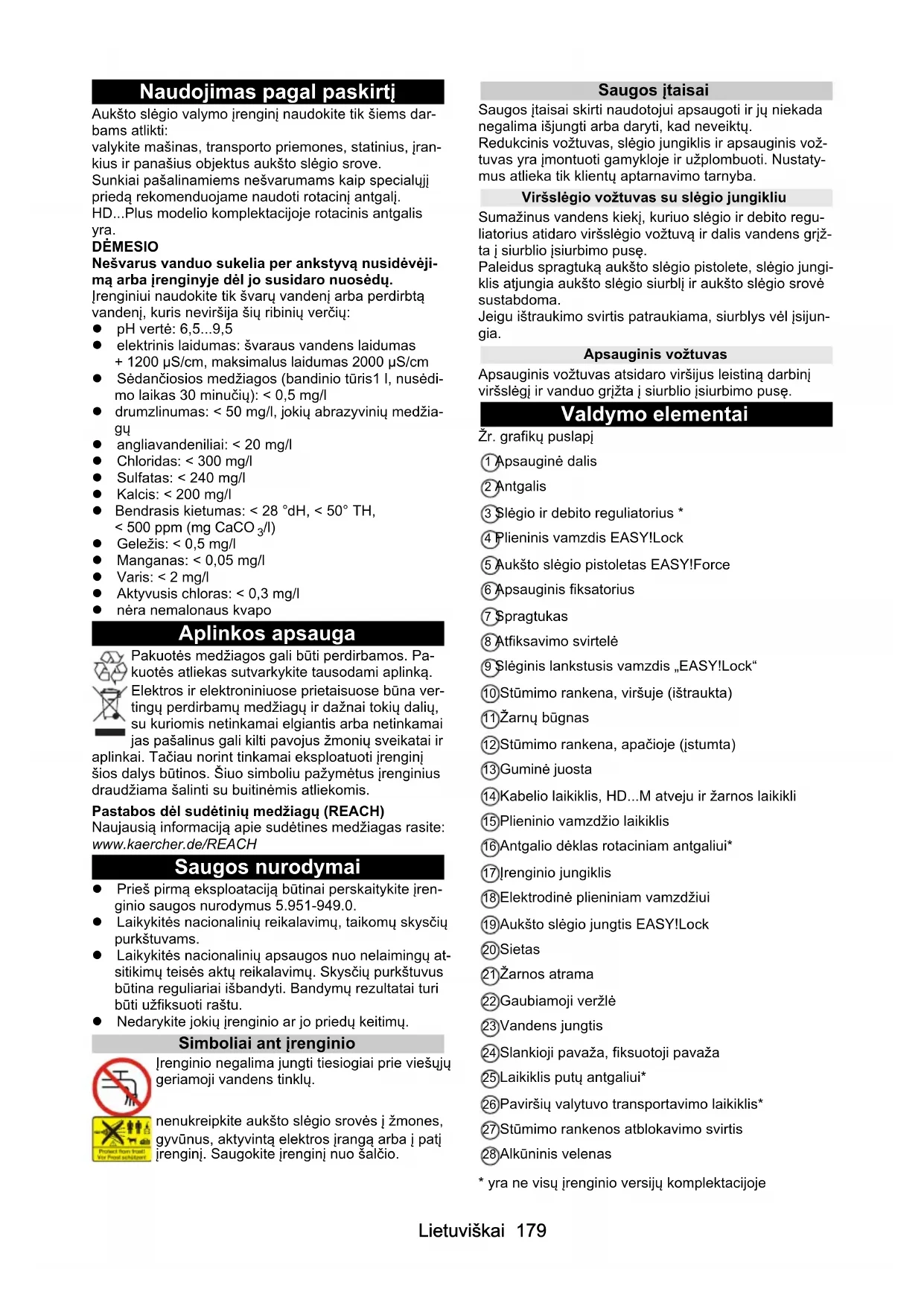 /l) Geležis: < 0,5 mg/l Manganas: < 0,05 mg/l Varis: < 2 mg/l Aktyvusis chloras: < 0,3 mg/l nėra nemalonaus kvapo Aplinkos apsauga Pakuotės medžiagos gali būti perdirbamos. Pa- kuotės atliekas sutvarkykite tausodami aplinką. Elektros ir elektroniniuose prietaisuose būna ver- tingų perdirbamų medžiagų ir dažnai tokių dalių, su kuriomis netinkamai elgiantis arba netinkamai jas pašalinus gali kilti pavojus žmonių sveikatai ir aplinkai. Tačiau norint tinkamai eksploatuoti įrenginį šios dalys būtinos. Šiuo simboliu pažymėtus įrenginius draudžiama šalinti su buitinėmis atliekomis. Pastabos dėl sudėtinių medžiagų (REACH) Naujausią informaciją apie sudėtines medžiagas rasite: www .kaercher.de/REACH Saugos nurodymai Prieš pirmą eksploataciją būtinai perskaitykite įren- ginio saugos nurodymus 5.951-949.0. Laikykitės nacionalinių reikalavimų, taikomų skysčių purkštuvams. Laikykitės nacionalinių apsaugos nuo nelaimingų at- sitikimų teisės aktų reikalavimų. Skysčių purkštuvus būtina reguliariai išbandyti. Bandymų rezultatai turi būti užfiksuoti raštu. Nedarykite jokių įrenginio ar jo priedų keitimų. Simboliai ant įrenginio Įrenginio negalima jungti tiesiogiai prie viešųjų geriamoji vandens tinklų. nenukreipkite aukšto slėgio srovės į žmones, gyvūnus, aktyvintą elektros įrangą arba į patį įrenginį. Saugokite įrenginį nuo šalčio. Saugos įtaisai Saugos įtaisai skirti naudotojui apsaugoti ir jų niekada negalima išjungti arba daryti, kad neveiktų. Redukcinis vožtuvas, slėgio jungiklis ir apsauginis vož- tuvas yra įmontuoti gamykloje ir užplombuoti. Nustaty- mus atlieka tik klientų aptarnavimo tarnyba. Viršslėgio vožtuvas su slėgio jungikliu Sumažinus vandens kiekį, kuriuo slėgio ir debito regu- liatorius atidaro viršslėgio vožtuvą ir dalis vandens grįž- ta į siurblio įsiurbimo pusę. Paleidus spragtuką aukšto slėgio pistolete, slėgio jungi- klis atjungia aukšto slėgio siurblį ir aukšto slėgio srovė sustabdoma. Jeigu ištraukimo svirtis patraukiama, siurblys vėl įsijun- gia. Apsauginis vožtuvas Apsauginis vožtuvas atsidaro viršijus leistiną darbinį viršslėgį ir vanduo grįžta į siurblio įsiurbimo pusę. Valdymo elementai Žr. grafikų puslapį 1 Apsauginė dalis 2 Antgalis 3 Slėgio ir debito reguliatorius * 4 Plieninis vamzdis EASY!Lock 5 Aukšto slėgio pistoletas EASY!Force 6 Apsauginis fiksatorius 7 Spragtukas 8 Atfiksavimo svirtelė 9 Slėginis lankstusis vamzdis „EASY!Lock“ 10 Stūmimo rankena, viršuje (ištraukta) 11 Žarnų būgnas 12 Stūmimo rankena, apačioje (įstumta) 13 Guminė juosta 14 Kabelio laikiklis, HD...M atveju ir žarnos laikikli 15 Plieninio vamzdžio laikiklis 16 Antgalio dėklas rotaciniam antgaliui* 17 Įrenginio jungiklis 18 Elektrodinė plieniniam vamzdžiui 19 Aukšto slėgio jungtis EASY!Lock 20 Sietas 21 Žarnos atrama 22 Gaubiamoji veržlė 23 Vandens jungtis 24 Slankioji pavaža, fiksuotoji pavaža 25 Laikiklis putų antgaliui* 26 Paviršių valytuvo transportavimo laikiklis* 27 Stūmimo rankenos atblokavimo svirtis 28 Alkūninis velenas