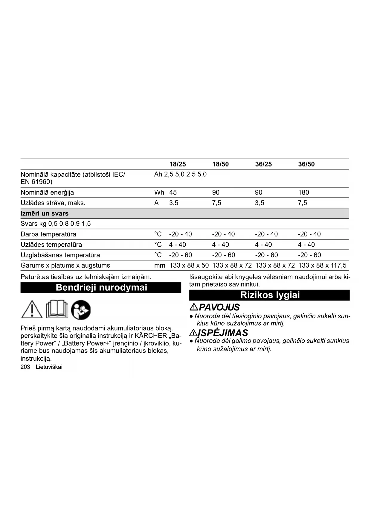 akumulatoru paku. Tehniskie dati 18/25 18/50 36/25 36/50 Strāvas pieslēgums Akumulatoru pakas nominālais spriegumsV18183636 Akumulatoru platforma Battery Power Battery Power Battery Power Battery Power Savietojams ar akumulatora platformu Battery Power + Battery Power + Battery Power + Battery Power + Akumulatoru pakas tips Li-ION Li-ION Li-ION Li-ION203 Lietuviškai Paturētas tiesības uz tehniskajām izmaiņām. Bendrieji nurodymai Prieš pirmą kartą naudodami akumuliatoriaus bloką, perskaitykite šią originalią instrukciją ir KÄRCHER „Ba- ttery Power“ / „Battery Power+“ įrenginio / įkroviklio, ku- riame bus naudojamas šis akumuliatoriaus blokas, instrukciją. Išsaugokite abi knygeles vėlesniam naudojimui arba ki- tam prietaiso savininkui. Rizikos lygiai PAVOJUS ● Nuoroda dėl tiesioginio pavojaus, galinčio sukelti sun- kius kūno sužalojimus ar mirtį. 몇 ĮSPĖJIMAS ● Nuoroda dėl galimo pavojaus, galinčio sukelti sunkius kūno sužalojimus ar mirtį. Nominālā kapacitāte (atbilstoši IEC/ EN 61960) Ah 2,5 5,0 2,5 5,0 Nominālā enerģija Wh 45 90 90 180 Uzlādes strāva, maks. A 3,5 7,5 3,5 7,5 Izmēri un svars Svars kg 0,5 0,8 0,9 1,5 Darba temperatūra °C -20 - 40 -20 - 40 -20 - 40 -20 - 40 Uzlādes temperatūra °C 4 - 40 4 - 40 4 - 40 4 - 40 Uzglabāšanas temperatūra °C -20 - 60 -20 - 60 -20 - 60 -20 - 60 Garums x platums x augstums mm 133 x 88 x 50 133 x 88 x 72 133 x 88 x 72 133 x 88 x 117,5 18/25 18/50 36/25 36/50Lietuviškai 204 몇 ATSARGIAI ● Nurodo galimą pavojų, galintį sukelti lengvus sužaloji- mus. DĖMESIO ● Nuoroda dėl galimo pavojaus, galinčio sukelti materi- alinius nuostolius. Saugos nurodymai ● Prieš kiekvieną naudojimą patikrinkite, ar nepažeis- tas akumuliatoriaus blokas. Nenaudokite pažeisto akumuliatoriaus bloko. ● Prieš atlikdami priežiūros ir valymo darbus, išimkite akumuliatoriaus bloką iš prietaiso. ● Saugokite akumuliatoriaus bloką nuo bet kokio me- chaninio poveikio. ● Užtikrinkite, kad akumuliatoriaus blokas nenukristų. ● Akumuliatoriaus bloko nenardinkite į vandenį ir ne- kiškite jo po vandens srove. ● Nenaudokite, neįkraukite ir nesandėliuokite šlapio arba nešvaraus akumuliatoriaus bloko. ● Jeigu akumuliatoriaus blokas sušlaptų, nedelsdami jį išdžiovinkite. Patikrinkite, ar kontaktai nėra drėgni. ● Akumuliatoriaus bloko nesandėliuokite arba neį- kraukite drėgnoje arba šlapioje aplinkoje. ● Akumuliatoriaus bloką įkraukite tik su patvirtintais įkrovikliais. ● Akumuliatoriaus bloko nekraukite sprogioje aplinko- je. Įkraudami reguliariai tikrinkite akumuliatoriaus bloko ir įkroviklio būklę. ● Jeigu įkraunant nustatomas gedimas, užuodžiamas neįprastas kvapas ar pajuntama besiskirianti šilu- mą, atjunkite įkroviklį nuo tinklo, o akumuliatorių blo- ką – nuo įkroviklio. Nedelsdami pašalinkite akumuliatoriaus blok ą ir įkroviklį bei laikykitės galio- jančiuose teisės aktuose nustatytų gabenimo ir šali- nimo reikalavimų. ● Nenaudokite, neįkraukite ir nesandėliuokite akumu- liatoriaus bloko potencialiai sprogioje aplinkoje ar šalia degiųjų daiktų. ● Nemeskite akumuliatoriaus bloko į ugnį. ● Saugokite akumuliatoriaus bloką nuo karščio, aštrių kampų, alyvos, tirpiklių, valiklių ir judančių objektų. ● Trumpojo jungimo pavojus. Apsaugokite akumulia- toriaus bloko kontaktus nuo metalinių dalių ir nelai- kykite jo kartu su metalinėmis dalimis. ● Neatidarykite akumuliatoriaus bloko. Taisymo dar- bus atlikti gali tik kvalifikuoti darbuotojai. ● Venkite sąlyčio su iš pažeistų baterijų ištekėjusiu skysčiu. Susilietus nedelsdami nuskalaukite skystį vandeniu o patekus į akis pasitarkite ir su gydytoju. ● Atsižvelgdami į galiojančius teisės aktus pašalinkite akumuliatoriaus blok ą pasibaigus jo eksploatavimo laikotarpiui.205 Lietuviškai Saugos nurodymai transportuojant Ličio jonų akumuliatoriui taikomi pavojingų krovinių tei- sės aktų reikalavimai. Nepažeistą ir tinkamą naudoti akumuliatoriaus bloką naudotojas be jokių papildomų reikalavimų gali gabenti viešaisiais keliais. Jeigu akumuliatoriaus bloką gabena trečiosios šalys (transporto bendrovės), turi būti laikomasi specialių pa- kuočių ir ženklinimo reikalavimų. Siųskite tik akumuliatoriaus bloką, kurio korpusas nepa- žeistas. Apklijuokite išorėje esančius kontaktus. Tvirtai ir saugiai supakuokite akumuliatoriaus bloką. Akumuliatoriaus blokas neturi galėti judėti pakuotėje. PAVOJUS ● Defektinis arba neveikiantis akumuliatoriaus blokas neturi būti siunčiamas ir vietoje šalinamas atsižvel- giant į galiojančių teisės aktų reikalavimus. Atkreipkite dėmesį į nacionalinius reikalavimus. Numatomasis naudojimas 몇 ATSARGIAI Sprogimo pavojus! Sprogęs akumuliatoriaus blokas gali sužeisti ar padaryti žalos. Įkraukite, naudokite ir sandėliuokite tik nepažeistus ir tinkamai veikiančius akumuliatorių blokus. Draudžiama modifikuoti ir atlikti pakeitimus, kurių ga- mintojas nepatvirtino. Neleidžiama naudoti bet kokiu kitokiu būdu. Už pavojus, kilusius dėl naudojimo ne pagal paskirtį, atsako naudo- tojas. Įkraukite ir naudokite akumuliatoriaus bloką tik su „KÄR- CHER 18 V / 36 V“ akumuliatoriaus / „Battery Power +“ sistemos prietaisais. DĖMESIO Akumuliatorių blokus galima naudoti tik su tos pačios įtampos vertės (18 V arba 36 V) įtaisais! Nenaudokite ir neįkraukite akumuliatorių blokų su skirtingo įtampos prietaisais. Prieš naudodami patikrinkite, ar akumuliatoriaus bloko ir prietaiso įtampos vertės (18 V / 36 V) sutampa. Informaciją apie įtampą galite rasti prietaise, akumulia- toriaus bloke ir jo identifikacinėje plokštelėje. Aplinkos apsauga Pakuotės medžiagos gali būti perdirbamos. Pra- šome neišmesti pakuotės kaip buitinių atliekų – priduokite ją, kad būtų galima naudoti pakartoti- nai.Lietuviškai 206 Senuose prietaisuose yra vertingų ir perdi