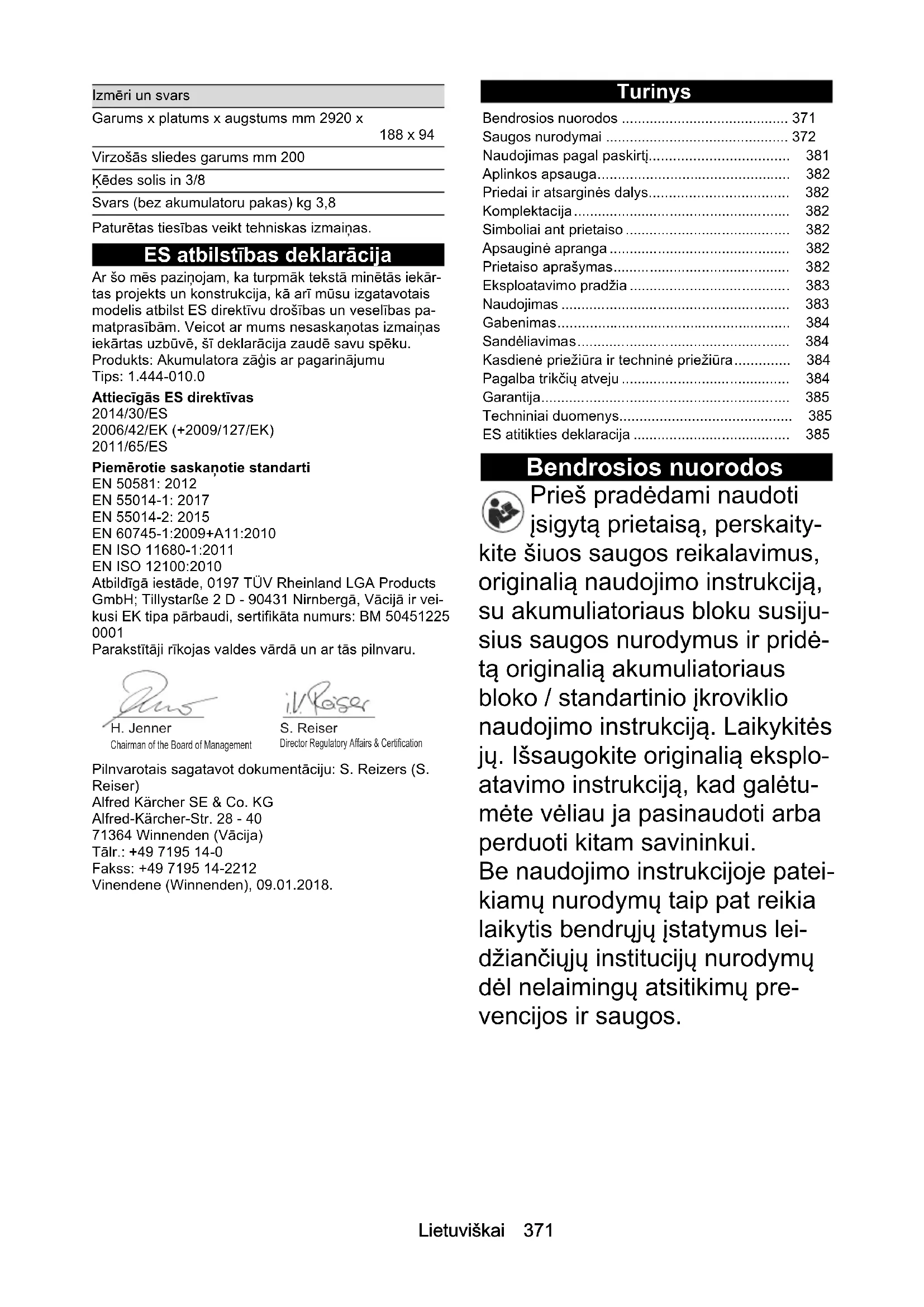 - Parakstītāji rīkojas valdes vārdā un ar tās pilnvaru. Pilnvarotais sagatavot dokumentāciju: S. Reizers (S. Reiser) Alfred Kärcher SE & Co. KG Alfred-Kärcher-Str. 28 - 40 71364 Winnenden (Vācija) Tālr.: +49 7195 14-0 Fakss: +49 7195 14-2212 Vinendene (Winnenden), 09.01.2018. Turinys Bendrosios nuorodos Prieš pradėdami naudoti įsigytą prietaisą, perskaity- kite šiuos saugos reikalavimus, originalią naudojimo instrukciją, su akumuliatoriaus bloku susiju- sius saugos nurodymus ir pridė- tą originalią akumuliatoriaus bloko / standartinio įkroviklio naudojimo instrukciją. Laikykitės jų. Išsaugokite originalią eksplo- atavimo instrukciją, kad galėtu- mėte vėliau ja pasinaudoti arba perduoti kitam savininkui. Be naudojimo instrukcijoje patei- kiamų nurodymų taip pat reikia laikytis bendrųjų įstatymus lei- džiančiųjų institucijų nurodymų dėl nelaimingų atsitikimų pre- vencijos ir saugos. Izmēri un svars Garums x platums x augstums mm 2920 x 188 x 94 Virzošās sliedes garums mm 200 Ķēdes solis in 3/8 Svars (bez akumulatoru pakas) kg 3,8 Chairman of the Board of ManagementDirector Regulatory Affairs & Certification H. Jenner S. Reiser Bendrosios nuorodos p. 371