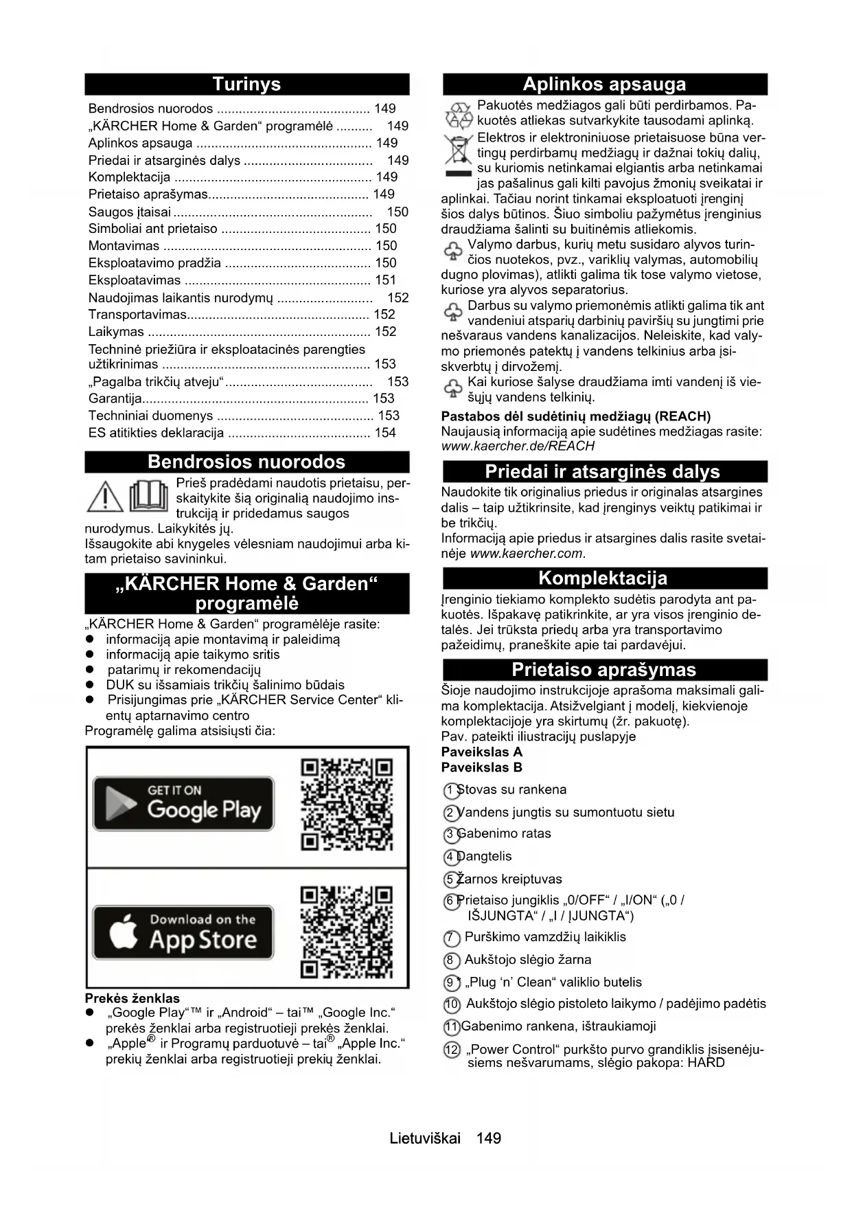 dB(A) 90 90 K 4 Premium Power Control Power Control Chairman of the Board of Management Director Regulatory Affairs & Certification H. Jenner S. ReiserLietuviškai 149 Turinys Bendrosios nuorodos Prieš pradėdami naudotis prietaisu, per- skaitykite šią originalią naudojimo ins- trukciją ir pridedamus saugos nurodymus. Laikykitės jų. Išsaugokite abi knygeles vėlesniam naudojimui arba ki- tam prietaiso savininkui. „KÄRCHER Home & Garden“ programėlė „KÄRCHER Home & Garden“ programėlėje rasite: informaciją apie montavimą ir paleidimą informaciją apie taikymo sritis patarimų ir rekomendacijų DUK su išsamiais trikčių šalinimo būdais Prisijungimas prie „KÄRCHER Service Center“ kli- entų aptarnavimo centro Programėlę galima atsisiųsti čia: Prekės ženklas „Google Play“™ ir „Android“ – tai™ „Google Inc.“ prekės ženklai arba registruotieji prekės ženklai. „Apple“