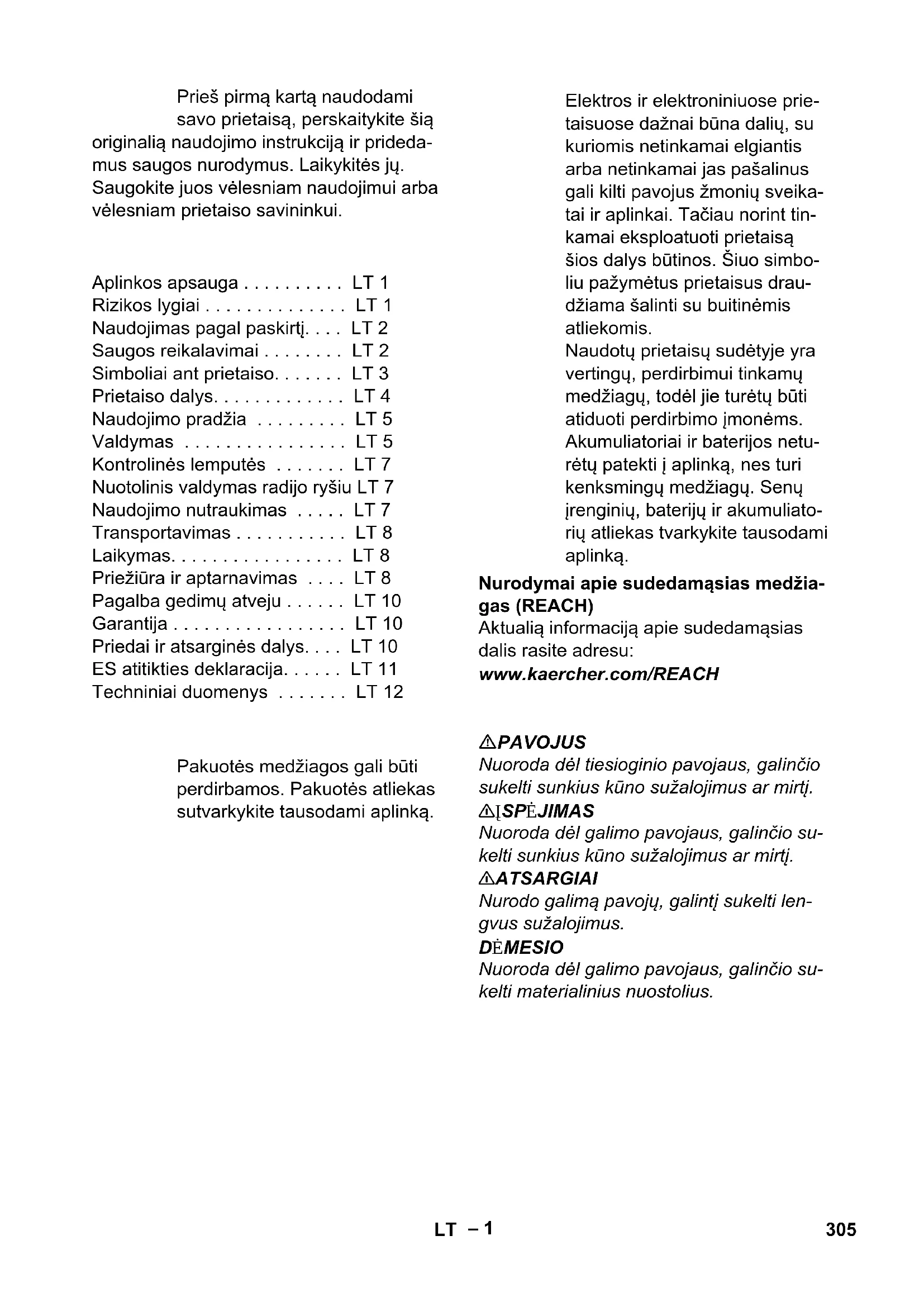 304 LV– 1 Prieš pirmą kartą naudodami savo prietaisą, perskaitykite šią originalią naudojimo instrukciją ir prideda- mus saugos nurodymus. Laikykitės jų. Saugokite juos vėlesniam naudojimui arba vėlesniam prietaiso savininkui. Nurodymai apie sudedamąsias medžia- gas (REACH) Aktualią informaciją apie sudedamąsias dalis rasite adresu: www.kaercher.com/REACH PAVOJUS Nuoroda dėl tiesioginio pavojaus, galinčio sukelti sunkius kūno sužalojimus ar mirtį. 몇 ĮSPĖJIMAS Nuoroda dėl galimo pavojaus, galinčio su- kelti sunkius kūno sužalojimus ar mirtį. 몇 ATSARGIAI Nurodo galimą pavojų, galintį sukelti len- gvus sužalojimus. DĖMESIO Nuoroda dėl galimo pavojaus, galinčio su- kelti materialinius nuostolius. Turinys Aplinkos apsauga . . . . . . . . . . LT 1 Rizikos lygiai . . . . . . . . . . . . . . LT 1 Naudojimas pagal paskirtį. . . . LT 2 Saugos reikalavimai . . . . . . . . LT 2 Simboliai ant prietaiso. . . . . . . LT 3 Prietaiso dalys. . . . . . . . . . . . . LT 4 Naudojimo pradžia . . . . . . . . . LT 5 Valdymas . . . . . . . . . . . . . . . . LT 5 Kontrolinės lemputės . . . . . . . LT 7 Nuotolinis valdymas radijo ryšiu LT 7 Naudojimo nutraukimas . . . . . LT 7 Transportavimas . . . . . . . . . . . LT 8 Laikymas. . . . . . . . . . . . . . . . . LT 8 Priežiūra ir aptarnavimas . . . . LT 8 Pagalba gedimų atveju . . . . . . LT 10 Garantija . . . . . . . . . . . . . . . . . LT 10 Priedai ir atsarginės dalys. . . . LT 10 ES atitikties deklaracija. . . . . . LT 11 Techniniai duomenys . . . . . . . LT 12 Aplinkos apsauga Pakuotės medžiagos gali būti perdirbamos. Pakuotės atliekas sutvarkykite tausodami aplinką. Elektros ir elektroniniuose prie- taisuose dažnai būna dalių, su kuriomis netinkamai elgiantis arba netinkamai jas pašalinus gali kilti pavojus žmonių sveika- tai ir aplinkai. Tačiau norint tin- kamai eksploatuoti prietaisą šios dalys būtinos. Šiuo simbo- liu pažymėtus prietaisus drau- džiama šalinti su buitinėmis atliekomis. Naudotų prietaisų sudėtyje yra vertingų, perdirbimui tinkamų medžiagų, todėl jie turėtų būti atiduoti perdirbimo įmonėms. Akumuliatoriai ir baterijos netu- rėtų patekti į aplinką, nes turi kenksmingų medžiagų. Senų įrenginių, baterijų ir akumuliato- rių atliekas tvarkykite tausodami aplinką. Rizikos lygiai 305LT– 2 – Šis siurblys skirtas grindų ir sienų pavir- šių drėgnam ir sausam valymui. – Šis prietaisas skirtas sausoms, nede- gioms dulkėms iš mašinų siurbti. – Siurblys skirtas drėgnoms ir skystoms medžiagoms siurbti. – Prietaisas skirtas sausoms, nede- gioms, sveikatai pavojingoms M klasės dulkėms pagal EN 60 335–2–69 valyti. Apribojimas: nesiurbkite kancerogeni- nių medžiagų. – Šis prietaisas skirtas pramoniniam nau- dojimui. – Komplekte priedų nėra. Atsižvelgiant į naudojimo sritį, priedus reikia užsakyti atskirai. – Nepriekaištingą šios įrangos veikimą užtikrina tik siurbimo žarnos DN42, DN52 ir DN 72 nominalioji galia. IV 100/40 M turi būti naudojamas tik su priedais DN 42 ir DN 52. – Bet koks kitoks naudojimas laikomas netinkamu. Prieš pirmąjį naudojimą, būtinai perskaity- kite pridėtus drėgno ir sauso siurblio sau- gos reikalavimus! PAVOJUS – Jei išmetamas oras grįžta į patalpą, joje turi būti pakankama oro apykaita. Nu- statytoms ribinėms vertėms išlaikyti grįžtančiosios srovės dydis gali sudaryti ne daugiau nei 50% šviežio oro srovės dydžio (patalpos oras V