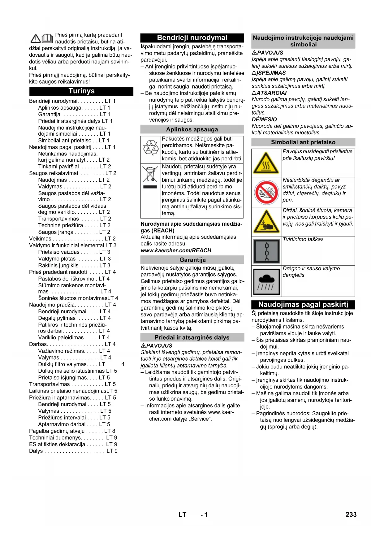 Atbilstibas novertešanas procedura: 2000/14/EK: V pielikums Skaņas intensitates līmenis dB(A) Izmērītais: 82 Garantētais: 83 Chairman of the Board of Management Director Regulatory Affairs & Certification Piederumi Sānu slota, cieta 6.905-625.0 Spēcīgi ar netīrumiem noklātu āra virsmu tīrīšanai, mitrumizturīgas. Slaucītājveltnis, mīksts 6.906-886.0 Ar dabīgām sukām speciāli sīku putekļu saslaucīšanai uz gludām grīdām iekštel- pās. Nav mitrumizturīgs, nav paredzēts abrazīvām virsmām. Slaucītājveltnis, ciets 6.906-885.0 Spēcīgi ar netīrumiem noklātu āra virsmu tīrīšanai, mitrumizturīgas. Slaucītājveltnis, anti- statisks 6.906-950.0 232 LV- 1 Prieš pirmą kartą pradedant naudotis prietaisu, būtina ati- džiai perskaityti originalią instrukciją, ja va- dovautis ir saugoti, kad ja galima būtų nau- dotis vėliau arba perduoti naujam savinin- kui. Prieš pirmąjį naudojimą, būtinai perskaity- kite saugos reikalavimus! Išpakuodami įrenginį pastebėję transporta- vimo metu padarytų pažeidimų, praneškite pardavėjui. – Ant įrenginio pritvirtintuose įspėjamuo- siuose ženkluose ir nurodymų lentelėse pateikiama svarbi informacija, reikalin- ga, norint saugiai naudoti prietaisą. – Be naudojimo instrukcijoje pateikiamų nurodymų taip pat reikia laikytis bendrų- jų įstatymus leidžiančiųjų institucijų nu- rodymų dėl nelaimingų atsitikimų pre- vencijos ir saugos. Nurodymai apie sudedamąsias medžia- gas (REACH) Aktualią informaciją apie sudedamąsias dalis rasite adresu: www.kaercher.com/REACH Kiekvienoje šalyje galioja mūsų įgaliotų pardavėjų nustatytos garantijos sąlygos. Galimus prietaiso gedimus garantijos galio- jimo laikotarpiu pašalinsime nemokamai, jei tokių gedimų priežastis buvo netinka- mos medžiagos ar gamybos defektai. Dėl garantinių gedimų šalinimo kreipkitės į savo pardavėją arba artimiausią klientų ap- tarnavimo tarnybą pateikdami pirkimą pa- tvirtinantį kasos kvitą. PAVOJUS Siekiant išvengti gedimų, prietaisą remon- tuoti ir jo atsargines detales keisti gali tik įgaliota klientų aptarnavimo tarnyba. – Leidžiama naudoti tik gamintojo patvir- tintus priedus ir atsargines dalis. Origi- nalių priedų ir atsarginių dalių naudoji- mas užtikrina saugų, be gedimų prietai- so funkcionavimą. – Informacijos apie atsargines dalis galite rasti interneto svetainės www.kaer- cher.com dalyje „Service“. PAVOJUS Įspėja apie gresiantį tiesioginį pavojų, ga- lintį sukelti sunkius sužalojimus arba mirtį. 몇 ĮSPĖJIMAS Įspėja apie galimą pavojų, galintį sukelti sunkius sužalojimus arba mirtį. 몇 ATSARGIAI Nurodo galimą pavojų, galintį sukelti len- gvus sužalojimus arba materialinius nuos- tolius. DĖMESIO Nuoroda dėl galimo pavojaus, galinčio su- kelti materialinius nuostolius. Šį prietaisą naudokite tik šioje instrukcijoje nurodytiems tikslams. – Šluojamoji mašina skirta nešvariems paviršiams viduje ir lauke valyti. – Šis prietaisas skirtas pramoniniam nau- dojimui. – Įrenginys nepritaikytas siurbti sveikatai pavojingas dulkes. – Jokiu būdu neatlikite jokių įrenginio pa- keitimų. – Įrenginys skirtas tik naudojimo instruk- cijoje nurodytoms dangoms. – Mašiną galima naudoti tik įmonės arba jos įgaliotų asmenų nurodytoje teritori- joje. – Pagrindinės nuorodos: Saugokite prie- taisą nuo lengvai užsidegančių medžia- gų (sprogių arba degių). Turinys Bendrieji nurodymai. . . . . . . . . LT 1 Aplinkos apsauga. . . . . . LT 1 Garantija . . . . . . . . . . . . LT 1 Priedai ir atsarginės dalys LT 1 Naudojimo instrukcijoje nau- dojami simboliai . . . . . . . LT 1 Simboliai ant prietaiso . . LT 1 Naudojimas pagal paskirtį . . . . LT 1 Netinkamas naudojimas, kurį galima numatyti. . . . LT 2 Tinkami paviršiai . . . . . . LT 2 Saugos reikalavimai . . . . . . . . LT 2 Naudojimas . . . . . . . . . . LT 2 Valdymas . . . . . . . . . . . . LT 2 Saugos pastabos dėl važia- vimo . . . . . . . . . . . . . . . . LT 2 Saugos pastabos dėl vidaus degimo variklio. . . . . . . . LT 2 Transportavimas . . . . . . LT 2 Techninė priežiūra . . . . . LT 2 Saugos įranga . . . . . . . . LT 2 Veikimas . . . . . . . . . . . . . . . . . LT 2 Valdymo ir funkciniai elementai LT 3 Prietaiso vaizdas . . . . . . LT 3 Valdymo plotas . . . . . . . LT 3 Raktinis jungiklis . . . . . . LT 3 Prieš pradedant naudoti . . . . . LT 4 Pastabos dėl iškrovimo . LT 4 Stūmimo rankenos montavi- mas . . . . . . . . . . . . . . . . LT 4 Šoninės šluotos montavimasLT 4 Naudojimo pradžia. . . . . . . . . . LT 4 Bendrieji nurodymai . . . . LT 4 Degalų pylimas . . . . . . . LT 4 Patikros ir techninės priežiū- ros darbai. . . . . . . . . . . . LT 4 Variklio paleidimas. . . . . LT 4 Darbas. . . . . . . . . . . . . . . . . . . LT 4 Važiavimo režimas. . . . . LT 4 Valymas . . . . . . . . . . . . . LT 4 Dulkių filtro valymas. . . . LT 4 Dulkių maišelio ištuštinimas LT 5 Prietaiso išjungimas. . . . LT 5 Transportavimas . . . . . . . . . . . LT 5 Laikinas prietaiso nenaudojimasLT 5 Priežiūra ir aptarnavimas. . . . . LT 5 Bendrieji nurodymai . . . . LT 5 Valymas . . . . . . . . . . . . . LT 5 Priežiūros intervalai . . . . LT 5 Aptarnavimo darbai . . . . LT 5 Pagalba gedimų atveju . . . . . . LT 8 Techniniai duomenys. . . . . . . . LT 9 ES atitikties deklaracija . . . . . . LT 9 Dalys . . . . . . . . . . . . . . . . . . . . LT 9 Bendrieji nurodymai Aplinkos apsauga Pakuotės medžiagos gali būti perdirbamos. Neišmeskite pa- kuočių kartu su buitinėmis atlie- komis, bet atiduokite jas perdirbti. Naudotų prietaisų sudėtyje yra vertingų, antriniam žaliavų perdir- bimui tinkamų medžiagų, todėl jie turėtų būti atiduoti perdirbimo įmonėms. Todėl naudotus senus įrenginius šalinkite pagal atitinka- mą antrinių žaliavų surinkimo sis- temą. Garantija Priedai ir atsarginės dalys Naudojimo instrukcijoje naudojami simboliai Sim