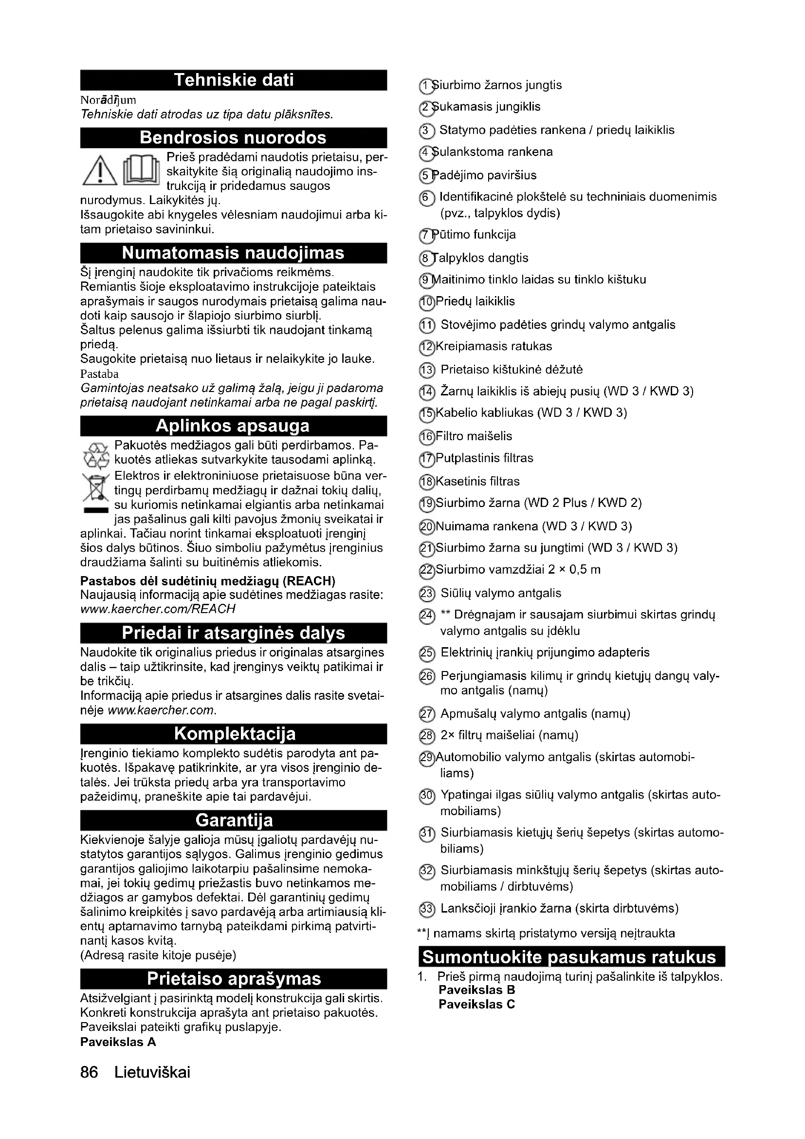 Attēls T Palīdzība traucējumu gadījumā Traucējumu cēloņi bieži vien ir vienkārši un tos ar turp- mākā pārskata palīdzību var novērst pašu spēkiem. Šaubu vai nenorādītu traucējumu gadījumā, lūdzu, vēr- sieties autorizētā klientu servisā. Sūkšanas jaudas samazināšanās Piederumi, iesūkšanas šļūtene vai iesūkšanas caurules ir nosprostotas. Atbrīvoties no nosprostojuma, izmantojot piemērotu palīglīdzekli. Filtra maisiņš ir pilns. Nomainīt filtra maisiņu. Putu filtrs/ patronfiltrs ir netīrs. Putu filtra / patronfiltra tīrīšana (skatīt nodaļu Putu filtra / patronfiltra tīrīšana). Putu filtrs / patronfiltrs ir bojāts. Noma inīt putu filtru / patronfiltru.86 Lietuviškai Tehniskie dati Norādījum Tehniskie dati atrodas uz tipa datu plāksnītes. Bendrosios nuorodos Prieš pradėdami naudotis prietaisu, per- skaitykite šią originalią naudojimo ins- trukciją ir pridedamus saugos nurodymus. Laikykitės jų. Išsaugokite abi knygeles vėlesniam naudojimui arba ki- tam prietaiso savininkui. Numatomasis naudojimas Šį įrenginį naudokite tik privačioms reikmėms. Remiantis šioje eksploatavimo instrukcijoje pateiktais aprašymais ir saugos nurodymais prietaisą galima nau- doti kaip sausojo ir šlapiojo siurbimo siurblį. Šaltus pelenus galima išsiurbti tik naudojant tinkamą priedą. Saugokite prietaisą nuo lietaus ir nelaikykite jo lauke. Pastaba Gamintojas neatsako už galimą žalą, jeigu ji padaroma prietaisą naudojant netinkamai arba ne pagal paskirtį. Aplinkos apsauga Pakuotės medžiagos gali būti perdirbamos. Pa- kuotės atliekas sutvarkykite tausodami aplinką. Elektros ir elektroniniuose prietaisuose būna ver- tingų perdirbamų medžiagų ir dažnai tokių dalių, su kuriomis netinkamai elgiantis arba netinkamai jas pašalinus gali kilti pavojus žmonių sveikatai ir aplinkai. Tačiau norint tinkamai eksploatuoti įrenginį šios dalys būtinos. Šiuo simboliu pažymėtus įrenginius draudžiama šalinti su buitinėmis atliekomis. Pastabos dėl sudėtinių medžiagų (REACH) Naujausią informaciją apie sudėtines medžiagas rasite: www.kaercher.com/REACH Priedai ir atsarginės dalys Naudokite tik originalius priedus ir originalas atsargines dalis – taip užtikrinsite, kad įrenginys veiktų patikimai ir be trikčių. Informaciją apie priedus ir atsargines dalis rasite svetai- nėje www.kaercher.com. Komplektacija Įrenginio tiekiamo komplekto sudėtis parodyta ant pa- kuotės. Išpakavę patikrinkite, ar yra visos įrenginio de- talės. Jei trūksta priedų arba yra transportavimo pažeidimų, praneškite apie tai pardavėjui. Garantija Kiekvienoje šalyje galioja mūsų įgaliotų pardavėjų nu- statytos garantijos sąlygos. Galimus įrenginio gedimus garantijos galiojimo laikotarpiu pašalinsime nemoka- mai, jei tokių gedimų priežastis buvo netinkamos me- džiagos ar gamybos defektai. Dėl garantinių gedimų šalinimo kreipkitės į savo pardavėją arba artimiausią kli- entų aptarnavimo tarnybą pateikdami pirkimą patvirti- nantį kasos kvitą. (Adresą rasite kitoje pusėje) Prietaiso aprašymas Atsižvelgiant į pasirinktą modelį konstrukcija gali skirtis. Konkreti konstrukcija aprašyta ant prietaiso pakuotės. Paveikslai pateikti grafikų puslapyje. Paveikslas A 1 Siurbimo žarnos jungtis 2 Sukamasis jungiklis 3 Statymo padėties rankena / priedų laikiklis 4 Sulankstoma rankena 5 Padėjimo paviršius 6 Identifikacinė plokštelė su techniniais duomenimis (pvz., talpyklos dydis) 7 Pūtimo funkcija 8 Talpyklos dangtis 9 Maitinimo tinklo laidas su tinklo kištuku 10 Priedų laikiklis 11 Stovėjimo padėties grindų valymo antgalis 12 Kreipiamasis ratukas 13 Prietaiso kištukinė dėžutė 14 Žarnų laikiklis iš abiejų pusių (WD 3 / KWD 3) 15 Kabelio kabliukas (WD 3 / KWD 3) 16 Filtro maišelis 17 Putplastinis filtras 18 Kasetinis filtras 19 Siurbimo žarna (WD 2 Plus / KWD 2) 20 Nuimama rankena (WD 3 / KWD 3) 21 Siurbimo žarna su jungtimi (WD 3 / KWD 3) 22 Siurbimo vamzdžiai 2 × 0,5 m 23 Siūlių valymo antgalis 24 ** Drėgnajam ir sausajam siurbimui skirtas grindų valymo antgalis su įdėklu 25 Elektrinių įrankių prijungimo adapteris 26 Perjungiamasis kilimų ir grindų kietųjų dangų valy- mo antgalis (namų) 27 Apmušalų valymo antgalis (namų) 28 2× filtrų maišeliai (namų) 29 Automobilio valymo antgalis (skirtas automobi- liams) 30 Ypatingai ilgas siūlių valymo antgalis (skirtas auto- mobiliams) 31 Siurbiamasis kietųjų šerių šepetys (skirtas automo- biliams) 32 Siurbiamasis minkštųjų šerių šepetys (skirtas auto- mobiliams / dirbtuvėms) 33 Lanksčioji įrankio žarna (skirta dirbtuvėms) **Į namams skirtą pristatymo versiją neįtraukta Sumontuokite pasukamus ratukus