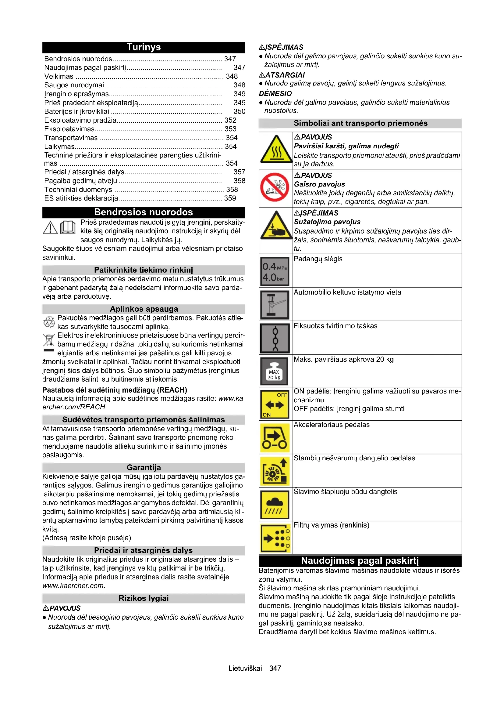 Saugos nurodymai Saugos įtaisai Saugos įtaisai skirti naudotojui apsaugoti ir jų niekada negalima išjungti arba daryti, kad neveiktų. Paisykite šiame skyriuje pateiktų saugos reikalavimų! Su valdymu susiję saugos nurodymai 몇 ĮSPĖJIMAS ● Įrenginį naudokite tik pagal paskirtį. Atsižvelki- te į konkrečios vietos sąlygas ir dirbdami su prietaisu atsižvelkite į pašalinus, pirmiausia į vaikus. ● Patikrinkite įrenginį ir darbinius įtaisus, ar jie yra tinkamos būklės ir ar saugūs naudoti. Jeigu bū- klė turi trūkumų, įrenginį naudoti draudžiama. ● Pavojingoje aplinkoje (pvz., degalinėse) vykdykite atitinkamus saugos nuro- dymus. Niekada nenaudokite įrenginio patalpose, kuriose gresia sprogimo pavojus. ● Šis remonto rinkinys nėra pritaikytas, kad juo galėtų naudotis asmenys su ribotais fiziniais, sensoriniais ar- ba protiniais gebėjimais arba nepakankama patirtimi ir (arba) ne- pakankamomis žiniomis. ● Prietaisą leidžiama naudoti tik asmenims, supažindintiems su jo naudojimu, arba įrodžiusiems savo gebėjimą jį valdyti bei nedviprasmiškai įgaliotiems jį naudo- ti.DĖMESIO ● Aptarnaujantis asmuo prieš prad ėdamas darbą tu- ri patikrinti, ar visi saugos įtaisai tinkamai pritvirtinti ir ar veikia. ● Už nelaimingus atsitikimus, įvykusius kitiems žmonėms arba jų nuosavybei atsako aptarnaujantis asmuo.ĮSPĖJIMAS ● Aptar- naujantis asmuo turi vilkėti prigludusius drabužius ir tvirtą avaly- nę. Venkite laisvų drabužių. ● Prižiūrėkite vaikus ir užtikrinkite, kad jie nežaistų su įrenginiu. ● Vaikams ir jaunuoliams neleidžia- ma dirbti su įrenginiu.DĖMESIO ● Tikrinkite artimiausią plotą, į kurį važiuojate (pvz., ar ten nėra vaikų). Pasirūpinkite pakankamu matomumu! ● Niekada nepalikite įrenginio be priežiūros, jeigu įrenginys neapsaugotas nuo netyčinio judėjimo, sustojus įrengi- niui stovėjimo stabdys įjungiamas automatiškai. ● Ištraukite už- degimo raktą arba KIK (Kärcher Intelligent Key), kad užkirstumėte kelią įrenginiu naudotis tam leidimo neturintiems žmonėms.ATSARGIAI ● Nenaudokite įrenginio tokiose zonose, kuriose yra pavojus, kad į jus pataikys krentantys daiktai. Saugos nurodymai važiuojant Pastaba ● Į apvirtimo pavojų sąrašą įtraukti ne visi atvejai.PAVO- JUS ● Virtimo pavojus didelėse įkalnėse ir nuokalnėse! Važiuo- dami įkalnėmis ir nuokalnėmis paisykite didžiausių leistinų verčių, nurodytų techniniuose duomenyse. ● Virtimo pavojus per daug pasvirus į šoną! Važiuodami skersai važiavimo krypčiai paisykite didžiausių leistinų verčių, nurodytų techniniuose duomenyse. ● Virtimo pavojus važiuojant nestabiliu pagrindu! Šį įrenginį nau- dokite tik ant tvirto pagrindo. 몇 ĮSPĖJIMAS ● Nepasirinkus tinkamo greičio gresia nelaimin- go atsitikimo pavojus. Posūkiuose važiuokite lėtai. Baterijomis varomi įrenginiai PAVOJUS ● Sprogimo pavojus! Baterijas įkraukite tik joms tinkamu įkrovikliu ● Įkraunant baterijas uždarose patalpose susi- daro itin sprogios dujos. Baterijas įkraukite tik gerai vėdinamose patalpose. ● Netoli baterijos arba baterijų krovimo patalpoje ne- galima naudoti atvirų liepsnų, sudaryti kibirkščių arba rūkyti. ● Sprogimų ir trumpųjų jungimųsi pavojus. Ant baterijos nedėkite jokių įrankių ar pan. 몇 ATSARGIAI ● Baterijos rūgštys kelia sužalojimų pavojų. Lai- kykitės atitinkamų saugos nuostatų. DĖMESIO ● Laikykitės baterijos ir įkroviklio gamintojo pateiktų naudojimo nurodymų. Laikykitės įstatymų leidėjo rekomendacijų dėl elgesio su baterijomis. ● Niekada nepalikite baterijų išsikrovu- sių, įkraukite jas kuo greičiau. ● Saugodami baterijas nuo nuotė- kio srovių, laikykite jas švariai ir sausai. Saugokite baterijas nuo užteršimo, pvz., metalo dulkėmis. ● Panaudotas baterijas šalinki- te laikydamiesi aplinkosaugos reikalavimų pagal EB direktyvą 91/ 157/EEE arba atitinkamas nacionalines nuostatas. Saugos nurodymai transportuojant 몇 ATSARGIAI ● Siekdami išvengti nelaimingų atsitikimų ir sužalojimų, transpor- tuodami įrenginį turite atsižvelgti į jo svorį, žr. skyrių Eksploata- vimo instrukcijų skyrių Techniniai duomenys. ● Prieš transportuodami išjunkite variklį. Pritvirtinkite įrenginį atsi- žvelgdami į jo svorį, žr. skyrių Techniniai duomenys. Techninė priežiūra ir eksploatacinės parengties užtikrinimas 몇 ĮSPĖJIMAS ● Prieš atlikdami elektros įrangos darbus, atjun- kite bateriją. ● Prieš valymo, techninės priežiūros, dalių keitimo darbus ir perjungimą į kitą veikimo vežimą, įrenginį turite išjungti ir ištraukti uždegimo raktą. 몇 ATSARGIAI ● Remonto darbus atlikti gali tik patvirtintos kli- entų aptarnavimo įstaigos arba šios srities specialistai, susipaži- nę su atitinkamomis saugos instrukcijomis. DĖMESIO ● Laikykitės saugos patikros nuostatų, taikomos ne- šiojamiems, komercinės paskirties naudotiems įrenginiams pagal vietoje galiojančius reikalavimus (pvz., Vokietijoje: VDE 0701). ● Trumpieji jungimai arba kiti pažeidimai. Nevalykite įrenginio žarna arba aukšto slėgio vandens srove. ● Darbus su įrenginiu vi- sada atlikite mūvėdami tinkamas pirštines.Lietuviškai 349 Įrenginio aprašymas Įrenginio paveikslas 1 Priekiniai ratai 2 Šoninė šluota dešinėje 3 Laikiklis „Hombase System“ (papildoma įranga) 4 Važiavimo pedalas 5 Šoninės šluotos nuleidimo / pakėlimo pedalas 6 Vairas 7 Rankinio filtro valymo įtaisas –dulkių filtrui valyti 8 Šviesos diodų švyturėlis (papildoma įranga) 9 Vairuotojo sėdynė (su kontaktiniu sėdynės jungikliu) 10 Įrenginio gaubtas 11 Galinis ratas 12 Šlavimo veleno nuleidimo / pakėlimo pedalas – su šlavimo veleno nusidėvėjimo rodmeniu 13 Stambių nešvarumų dangtelis 14 Šoninė šluota kairėje (papildoma įranga) 15 Šviesos diodų priekinis žibintas – Aktyvinamas įjungus įrengi