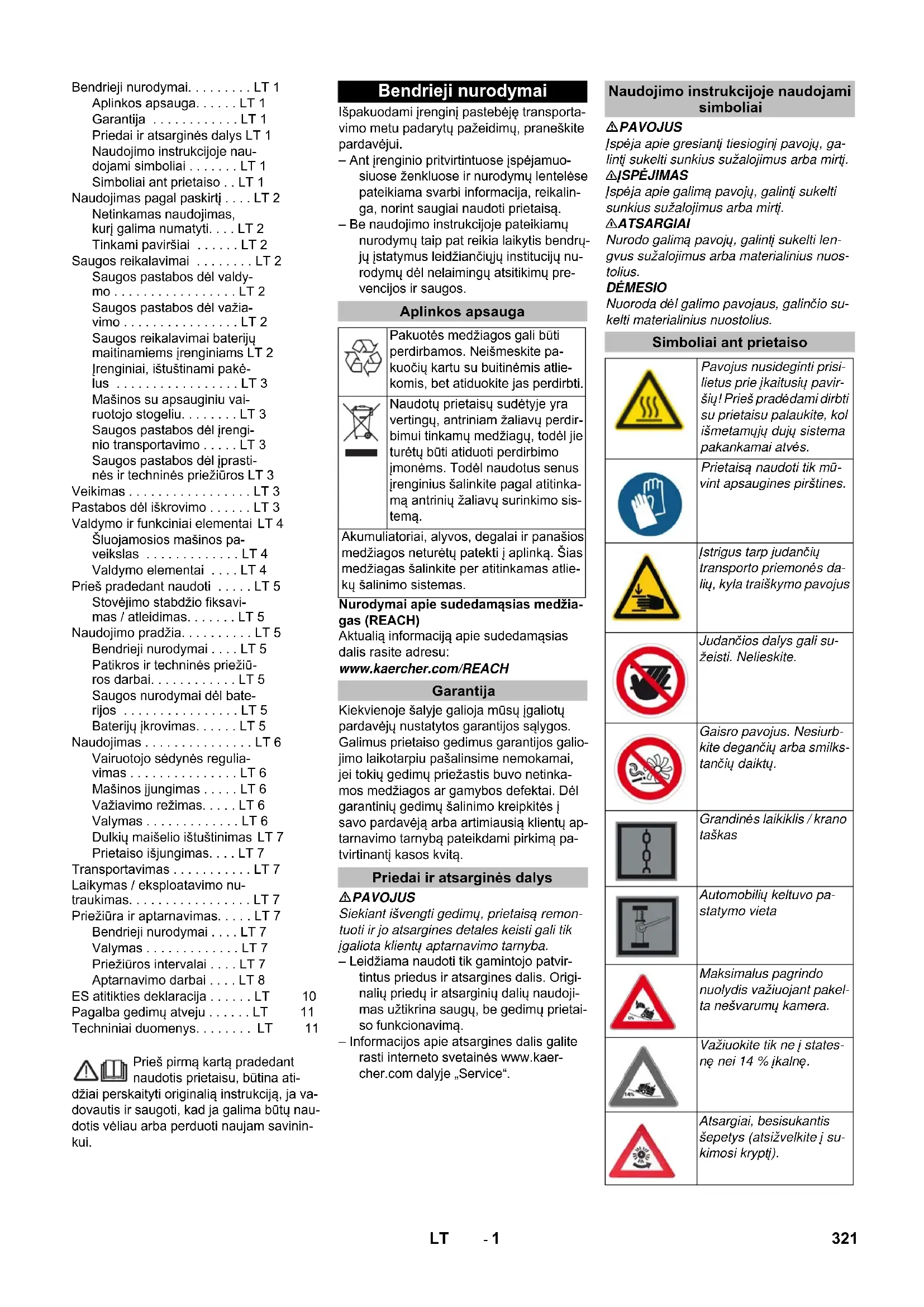 0,1 0,1 Izmēri un svars Garums x platums x augstums mm 1847 x 1065 x 1388 1847 x 1065 x 1388 Pagriešanās rādiuss pa labi mm 2470 2470 Pagriešanās rādiuss pa kreisi mm 2470 2470 Pašmasa (bez/ar akumulatoru) kg 560/860 560/860 Pieļaujamais kopējais svars kg 1224 1224 Pieļaujamā ass noslodze priekšā kg 734 734 Pieļaujamā ass noslodze aizmugurē kg 490 490 Rezervētas tiesības veikt tehniskas izmaiņas! 320 LV- 1 Prieš pirmą kartą pradedant naudotis prietaisu, būtina ati- džiai perskaityti originalią instrukciją, ja va- dovautis ir saugoti, kad ja galima būtų nau- dotis vėliau arba perduoti naujam savinin- kui. Išpakuodami įrenginį pastebėję transporta- vimo metu padarytų pažeidimų, praneškite pardavėjui. – Ant įrenginio pritvirtintuose įspėjamuo- siuose ženkluose ir nurodymų lentelėse pateikiama svarbi informacija, reikalin- ga, norint saugiai naudoti prietaisą. – Be naudojimo instrukcijoje pateikiamų nurodymų taip pat reikia laikytis bendrų- jų įstatymus leidžiančiųjų institucijų nu- rodymų dėl nelaimingų atsitikimų pre- vencijos ir saugos. Nurodymai apie sudedamąsias medžia- gas (REACH) Aktualią informaciją apie sudedamąsias dalis rasite adresu: www.kaercher.com/REACH Kiekvienoje šalyje galioja mūsų įgaliotų pardavėjų nustatytos garantijos sąlygos. Galimus prietaiso gedimus garantijos galio- jimo laikotarpiu pašalinsime nemokamai, jei tokių gedimų priežastis buvo netinka- mos medžiagos ar gamybos defektai. Dėl garantinių gedimų šalinimo kreipkitės į savo pardavėją arba artimiausią klientų ap- tarnavimo tarnybą pateikdami pirkimą pa- tvirtinantį kasos kvitą. PAVOJUS Siekiant išvengti gedimų, prietaisą remon- tuoti ir jo atsargines detales keisti gali tik įgaliota klientų aptarnavimo tarnyba. – Leidžiama naudoti tik gamintojo patvir- tintus priedus ir atsargines dalis. Origi- nalių priedų ir atsarginių dalių naudoji- mas užtikrina saugų, be gedimų prietai- so funkcionavimą. – Informacijos apie atsargines dalis galite rasti interneto svetainės www.kaer- cher.com dalyje „Service“. PAVOJUS Įspėja apie gresiantį tiesioginį pavojų, ga- lintį sukelti sunkius sužalojimus arba mirtį. 몇 ĮSPĖJIMAS Įspėja apie galimą pavojų, galintį sukelti sunkius sužalojimus arba mirtį. 몇 ATSARGIAI Nurodo galimą pavojų, galintį sukelti len- gvus sužalojimus arba materialinius nuos- tolius. DĖMESIO Nuoroda dėl galimo pavojaus, galin čio su- kelti ma terialinius nuostolius. Bendrieji nurodymai. . . . . . . . . LT 1 Aplinkos apsauga. . . . . . LT 1 Garantija . . . . . . . . . . . . LT 1 Priedai ir atsarginės dalys LT 1 Naudojimo instrukcijoje nau- dojami simboliai . . . . . . . LT 1 Simboliai ant prietaiso . . LT 1 Naudojimas pagal paskirtį . . . . LT 2 Netinkamas naudojimas, kurį galima numatyti. . . . LT 2 Tinkami paviršiai . . . . . . LT 2 Saugos reikalavimai . . . . . . . . LT 2 Saugos pastabos dėl valdy- mo . . . . . . . . . . . . . . . . . LT 2 Saugos pastabos dėl važia- vimo . . . . . . . . . . . . . . . . LT 2 Saugos reikalavimai baterijų maitinamiems įrenginiams LT 2 Įrenginiai, ištuštinami pakė- lus . . . . . . . . . . . . . . . . . LT 3 Mašinos su apsauginiu vai- ruotojo stogeliu. . . . . . . . LT 3 Saugos pastabos dėl įrengi- nio transportavimo . . . . . LT 3 Saugos pastabos dėl įprasti- nės ir techninės priežiūros LT 3 Veikimas . . . . . . . . . . . . . . . . . LT 3 Pastabos dėl iškrovimo . . . . . . LT 3 Valdymo ir funkciniai elementai LT 4 Šluojamosios mašinos pa- veikslas . . . . . . . . . . . . . LT 4 Valdymo elementai . . . . LT 4 Prieš pradedant naudoti . . . . . LT 5 Stovėjimo stabdžio fiksavi- mas / atleidimas. . . . . . . LT 5 Naudojimo pradžia. . . . . . . . . . LT 5 Bendrieji nurodymai . . . . LT 5 Patikros ir techninės priežiū- ros darbai. . . . . . . . . . . . LT 5 Saugos nurodymai dėl bate- rijos . . . . . . . . . . . . . . . . LT 5 Baterijų įkrovimas. . . . . . LT 5 Naudojimas . . . . . . . . . . . . . . . LT 6 Vairuotojo sėdynės regulia- vimas . . . . . . . . . . . . . . . LT 6 Mašinos įjungimas . . . . . LT 6 Važiavimo režimas. . . . . LT 6 Valymas . . . . . . . . . . . . . LT 6 Dulkių maišelio ištuštinimas LT 7 Prietaiso išjungimas. . . . LT 7 Transportavimas . . . . . . . . . . . LT 7 Laikymas / eksploatavimo nu- traukimas. . . . . . . . . . . . . . . . . LT 7 Priežiūra ir aptarnavimas. . . . . LT 7 Bendrieji nurodymai . . . . LT 7 Valymas . . . . . . . . . . . . . LT 7 Priežiūros intervalai . . . . LT 7 Aptarnavimo darbai . . . . LT 8 ES atitikties deklaracija . . . . . . LT 10 Pagalba gedimų atveju . . . . . . LT 11 Techniniai duomenys. . . . . . . . LT 11 Bendrieji nurodymai Aplinkos apsauga Pakuotės medžiagos gali būti perdirbamos. Neišmeskite pa- kuočių kartu su buitinėmis atlie- komis, bet atiduokite jas perdirbti. Naudotų prietaisų sudėtyje yra vertingų, antriniam žaliavų perdir- bimui tinkamų medžiagų, todėl jie turėtų būti atiduoti perdirbimo įmonėms. Todėl naudotus senus įrenginius šalinkite pagal atitinka- mą antrinių žaliavų surinkimo sis- temą. Akumuliatoriai, alyvos, degalai ir panašios medžiagos neturėtų patekti į aplinką. Šias medžiagas šalinkite per atitinkamas atlie- kų šalinimo sistemas. Garantija Priedai ir atsarginės dalys Naudojimo instrukcijoje naudojami simboliai Simboliai ant prietaiso Pavojus nusideginti prisi- lietus prie įkaitusių pavir- šių! Prieš pradėdami dirbti su prietaisu palaukite, kol išmetamųjų dujų sistema pakankamai atvės. Prietaisą naudoti tik mū- vint apsaugines pirštines. Įstrigus tarp judančių transporto priemonės da- lių, kyla traiškymo pavojus Judančios dalys gali su- žeisti. Nelieskite. Gaisro pavojus. Nesiurb- kite degančių arba smilks- tančių daiktų. Grandinės laikiklis / krano taškas Automobilių keltuvo pa- statymo vieta Maksimalus pagrindo nuolydis važiuojant pakel- ta neš