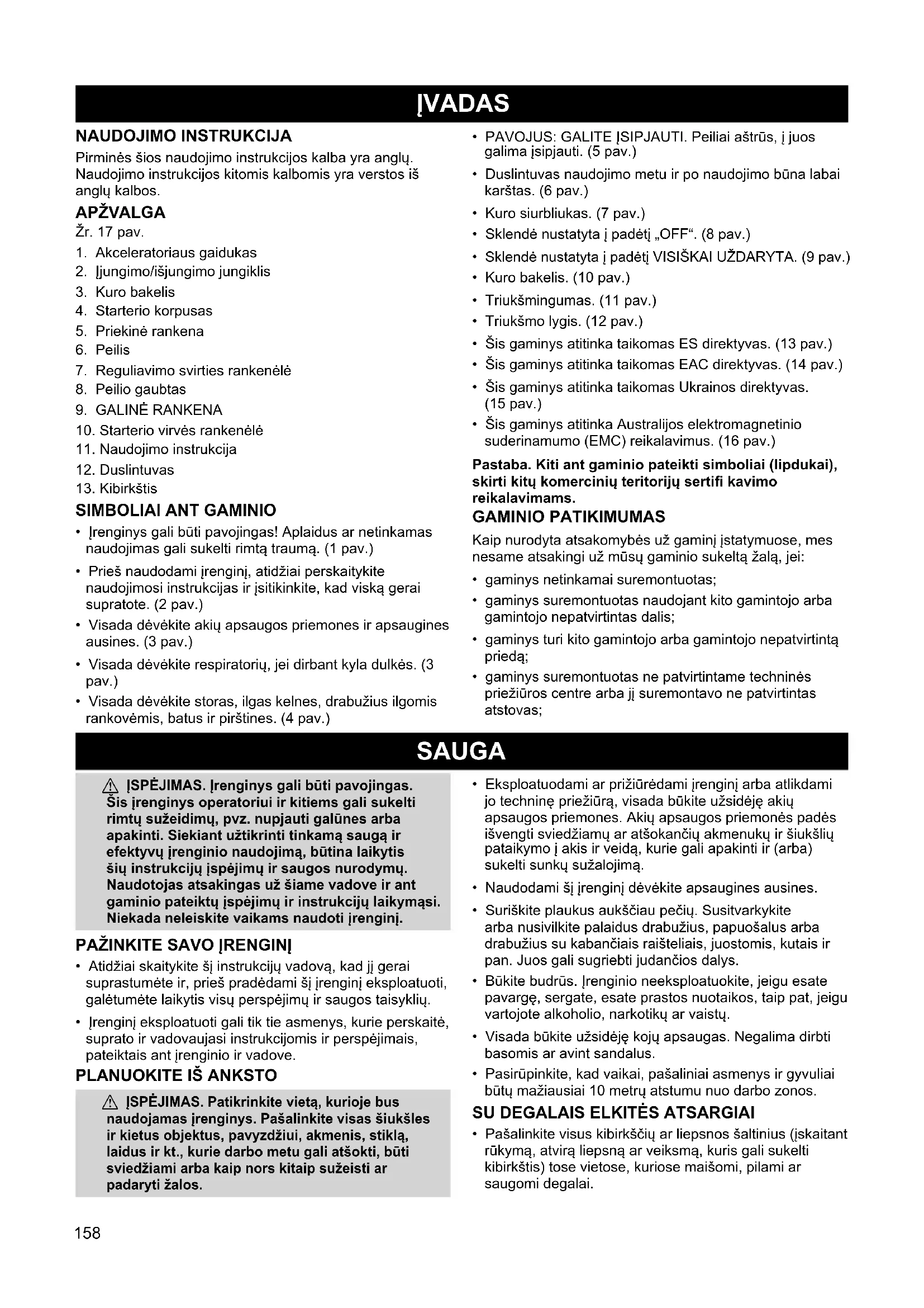 - gaminys suremontuotas ne patvirtintame techninės priežiūros centre arba jį suremontavo ne patvirtintas atstovas; SAUGA a ĮSPĖJIMAS. Įrenginys gali būti pavojingas. Šis įrenginys operatoriui ir kitiems gali sukelti rimtų sužeidimų, pvz. nupjauti galūnes arba apakinti. Siekiant užtikrinti tinkamą saugą ir efektyvų įrenginio naudojimą, būtina laikytis šių instrukcijų įspėjimų ir saugos nurodymų. Naudotojas atsakingas už šiame vadove ir ant gaminio pateiktų įspėjimų ir instrukcijų laikymąsi. Niekada neleiskite vaikams naudoti įrenginį.