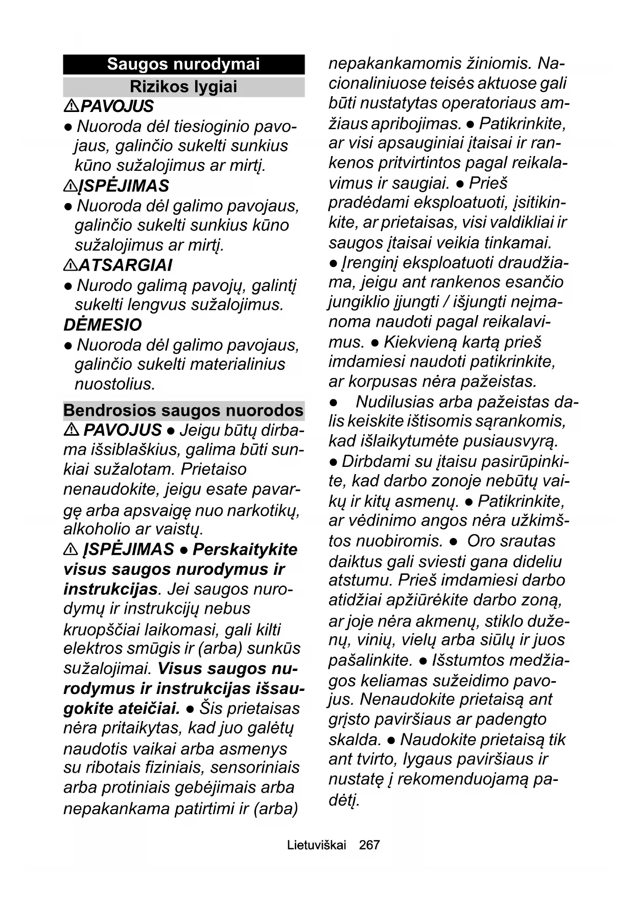 žalojimai. Visus saugos nu- rodymus ir instrukcijas išsau- gokite ateičiai. ● Šis prietaisas nėra pritaikytas, kad juo galėtų naudotis vaikai arba asmenys su ribotais fiziniais, sensoriniais arba protiniais gebėjimais arba nepakankama patirtimi ir (arba) nepakankamomis žiniomis. Na- cionaliniuose teisės aktuose gali būti nustatytas operatoriaus am- žiaus apribojimas. ● Patikrinkite, ar visi apsauginiai įtaisai ir ran- kenos pritvirtintos pagal reikala- vimus ir saugiai. ● Prieš pradėdami eksploatuoti, įsitikin- kite, ar prietaisas, visi valdikliai ir saugos įtaisai veikia tinkamai. ● Įrenginį eksploatuoti draudžia- ma, jeigu ant rankenos esančio jungiklio įjungti / išjungti neįma- noma naudoti pagal reikalavi- mus. ● Kiekvieną kartą prieš imdamiesi naudoti patikrinkite, ar korpusas nėra pažeistas. ● Nudilusias arba pažeistas da- lis keiskite ištisomis sąrankomis, kad išlaikytumėte pusiausvyrą. ● Dirbdami su įtaisu pasirūpinki- te, kad darbo zonoje nebūtų vai- kų ir kitų asmenų. ● Patikrinkite, ar vėdinimo angos nėra užkimš- tos nuobiromis. ● Oro srautas daiktus gali sviesti gana dideliu atstumu. Prieš imdamiesi darbo atidžiai apžiūrėkite darbo zoną, ar joje nėra akmenų, stiklo duže- nų, vinių, vielų arba siūlų ir juos pašalinkite. ● Išstumtos medžia- gos keliamas sužeidimo pavo- jus. Nenaudokite prietaisą ant grįsto paviršiaus ar padengto skalda. ● Naudokite prietaisą tik ant tvirto, lygaus paviršiaus ir nustatę į rekomenduojamą pa- dėtį.268 Lietuviškai 몇 ATSARGIAI ● Susipažinkite su Įrenginio valdymo elementais ir jo naudojimu pagal paskirtį. ● Naudodami prietaisą dėvėkite ausų apsaugus. Prietaisas sklei- džia stiprų garsą, todėl gali su- kelti ilgalaikį klausos pažeidimą, jeigu griežtai nesilaikysite nuro- dymų dėl poveikio, triukšmo ma- žinimo ir klausos apsaugos. ● Naudodami prietaisą dėvėkite patikimas akių apsaugos prie- mones. Gamintojas primygtinai rekomenduoja dėvėti visą veidą dengiančią kaukę arba visiškai uždaromus akinius. Įprasti aki- niai ar akiniai nuo saulės neap- saugos nuo sviedžiamų daiktų. ● Jeigu vilkėsite laisvą aprangą, nesusirišite plaukų arba mūvėsi- te papuošalus, gresia sužeidimo pavojus, nes minėtus daiktus prietaisas gali įtraukti. Susekite ilgus plaukus virš pečių lygio. ● Naudodami prietaisą vilkėkite ilgas storas kelnes, dėvėkite ap- rangą ilgomis rankovėmis ir avė- kite nuo paslydimo saugančią avalynę. Basam dirbti draudžia- ma. Nenešiokite papuošalų, ne- avėkite sandalų ir nevilkėkite trumpų kelnių. DĖMESIO ● Įrenginio operato- rius yra atsakingas už nelaimin- gus atsitikimus, įvykusius kitiems žmonėms arba pažeidu- sius jų nuosavybę. Pastaba ● Tam tikruose regio- nuose gali būti taikomos šį prie- taisą naudoti draudžiančios nuostatos. Pasitarkite su savo vietine valdžios institucija. ● Pa- sirūpinkite, kad pažeistus arba neįskaitomus įspėjamuosius lip- dukus ant prietaiso pakeistų įga- liotoji klientų aptarnavimo tarnyba. ● Prieš imdamiesi nau- doti akumuliatorinį siurblį-orpūtę šluotele arba valikliu pašalinkite purvą. Saugusis eksploatavimas PAVOJUS ● Draudžiama naudoti prietaisą sprogioje aplin- koje. 몇 ĮSPĖJIMAS ● Pasirūpinkite, kad asmenys ir gyvūnai būtų ne mažesniu kaip 15 m atstumu. Iš- junkite prietaisą, jeigu kas nors atsidurtų šioje 15 m zonoje. ● Atminkite, kad nei veido, nei kokios nors kūno dalies nelei- džiama artinti prie tiekimo an- gos. ● Prieš įjungdami prietaisą patikrinkite, ar tiekimo kamera yra tuščia. ● Rankos ar kitos kū- no dalys turi bū ti atokiai nuo tie- kimo kameros, šalinimo vamzdžio arba kitų judančiųjų dalių. ● Įrenginį naudoti drau- džiama, jeigu gali smogti žaibas. ● Turite sugebėti be jokių apribo- jimų apžvelgti darbo zoną, kad galėtumėte numatyti galimus pavojus. Prietaisą naudokite tik tuo atveju, jeigu užtikrinamas tinkamas apšvietimas. ● Dirb- dami su prietaisu nebėkite, o ei-Lietuviškai 269 kite. Neženkite atgal. Nestovėkite kaip nors neįpras- tai, stenkitės tvirtai, saugiai sto- vėti ir išlaikykite pusiausvyrą. ● Prietaisą naudoti draudžiama, jeigu apsauginiai įtaisai veikia ne pagal reikalavimus arba jeigu jų nėra, pvz., nesumontuota są- šlavų talpykla. ● Nedelsdami su- stabdykite prietaisą ir patikrinkite, ar jis nėra pažeistas arba nustatykite vibracijos prie- žastį, jeigu prietaisas nukrito, jį paveikė smūginė apkrova ar jis neįprastai vibruoja. Pasirūpinki- te, kad pažeidimą pašalintų įga- liotoji klientų aptarnavimo tarnyba arba prietaisą pasikeis- kite. ● Jeigu įvyktų nelaimingas atsitikimas arba jeigu sutriktų prietaiso veikimas, nedelsdami jį išjunkite ir išimkite akumuliato- riaus bloką. Prietaisą leidžiama vėl naudoti tik tuo atveju, jeigu jį patikrina įgaliotasis klientų ap- tarnavimo centras. ● Judamo- sios dalys kelia sužeidimo pavojų. Išjunkite variklį, išimkite akumuliatoriaus bloką ir įsitikin