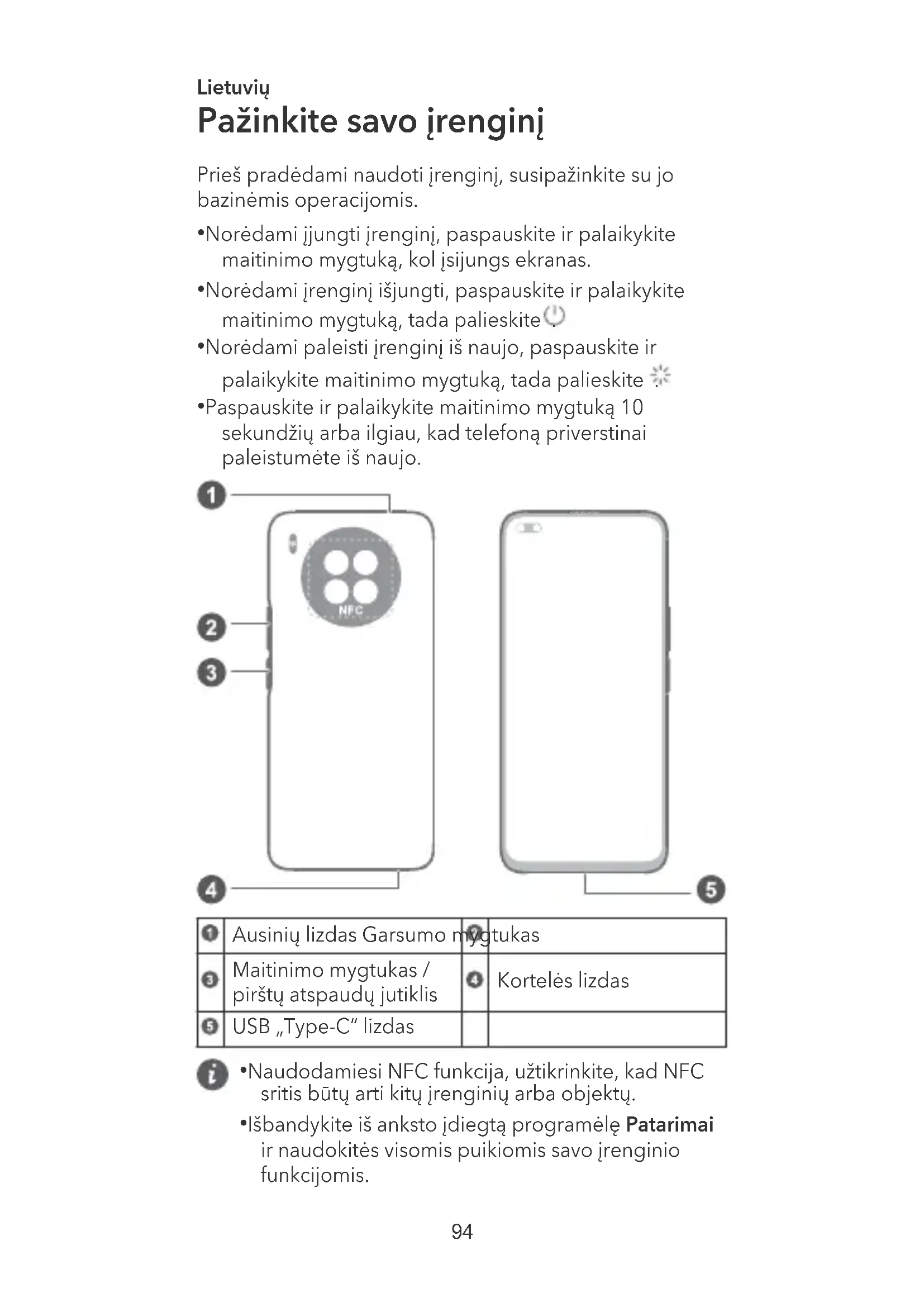 - Paspauskite ir palaikykite maitinimo mygtuką 10 sekundžių arba ilgiau, kad telefoną priverstinai paleistumėte iš naujo. Ausinių lizdas Garsumo mygtukas Maitinimo mygtukas / pirštų atspaudų jutiklis Kortelės lizdas USB „Type-C“ lizdas