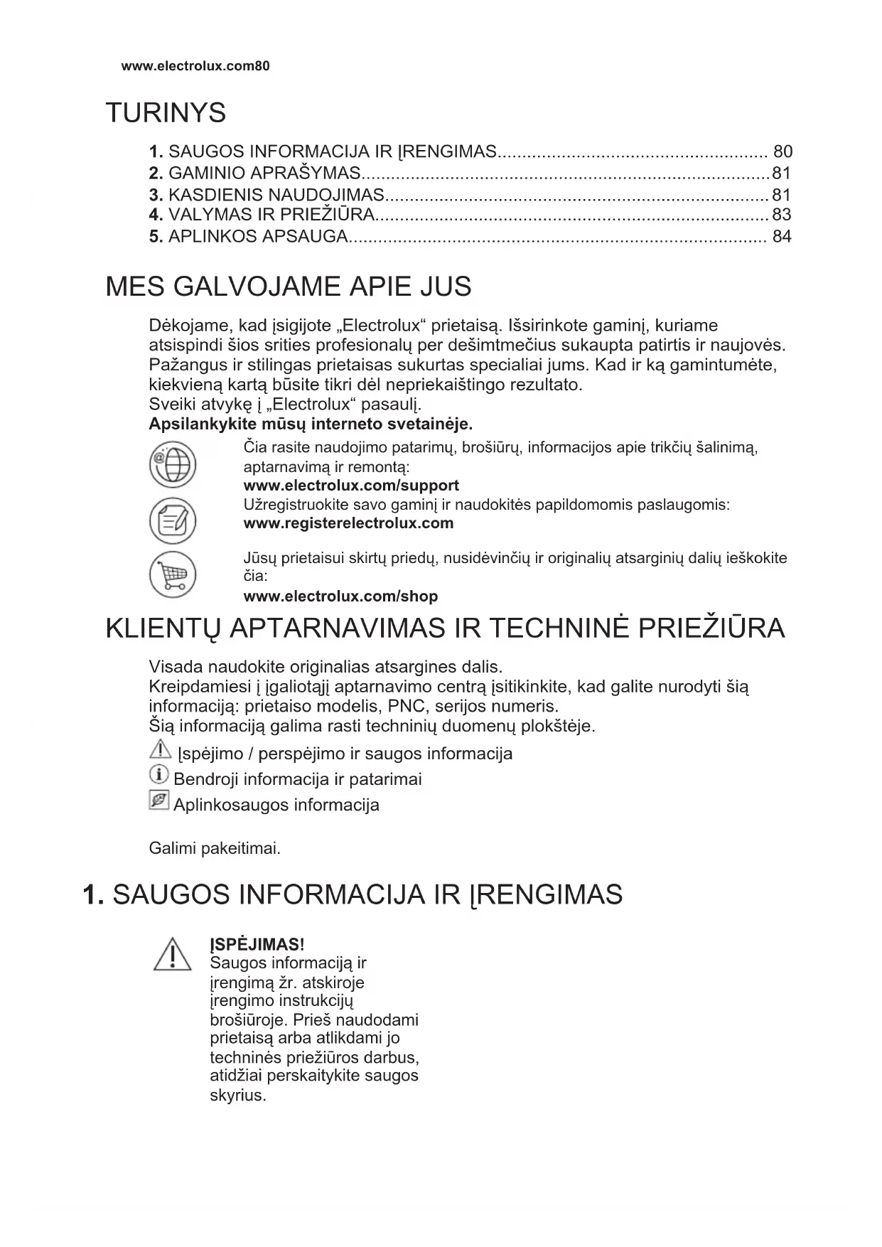 Dėkojame, kad įsigijote „Electrolux“ prietaisą. Išsirinkote gaminį, kuriame atsispindi šios srities profesionalų per dešimtmečius sukaupta patirtis ir naujovės. Pažangus ir stilingas prietaisas sukurtas specialiai jums. Kad ir ką gamintumėte, kiekvieną kartą būsite tikri dėl nepriekaištingo rezultato. Sveiki atvykę į „Electrolux“ pasaulį. Apsilankykite mūsų interneto svetainėje. Čia rasite naudojimo patarimų, brošiūrų, informacijos apie trikčių šalinimą, aptarnavimą ir remontą: www.electrolux.com/support Užregistruokite savo gaminį ir naudokitės papildomomis paslaugomis: www.registerelectrolux.com Jūsų prietaisui skirtų priedų, nusidėvinčių ir originalių atsarginių dalių ieškokite čia: www.electrolux.com/shop KLIENTŲ APTARNAVIMAS IR TECHNINĖ PRIEŽIŪRA Visada naudokite originalias atsargines dalis. Kreipdamiesi į įgaliotąjį aptarnavimo centrą įsitikinkite, kad galite nurodyti šią informaciją: prietaiso modelis, PNC, serijos numeris. Šią informaciją galima rasti techninių duomenų plokštėje. Įspėjimo / perspėjimo ir saugos informacija Bendroji informacija ir patarimai Aplinkosaugos informacija Galimi pakeitimai.