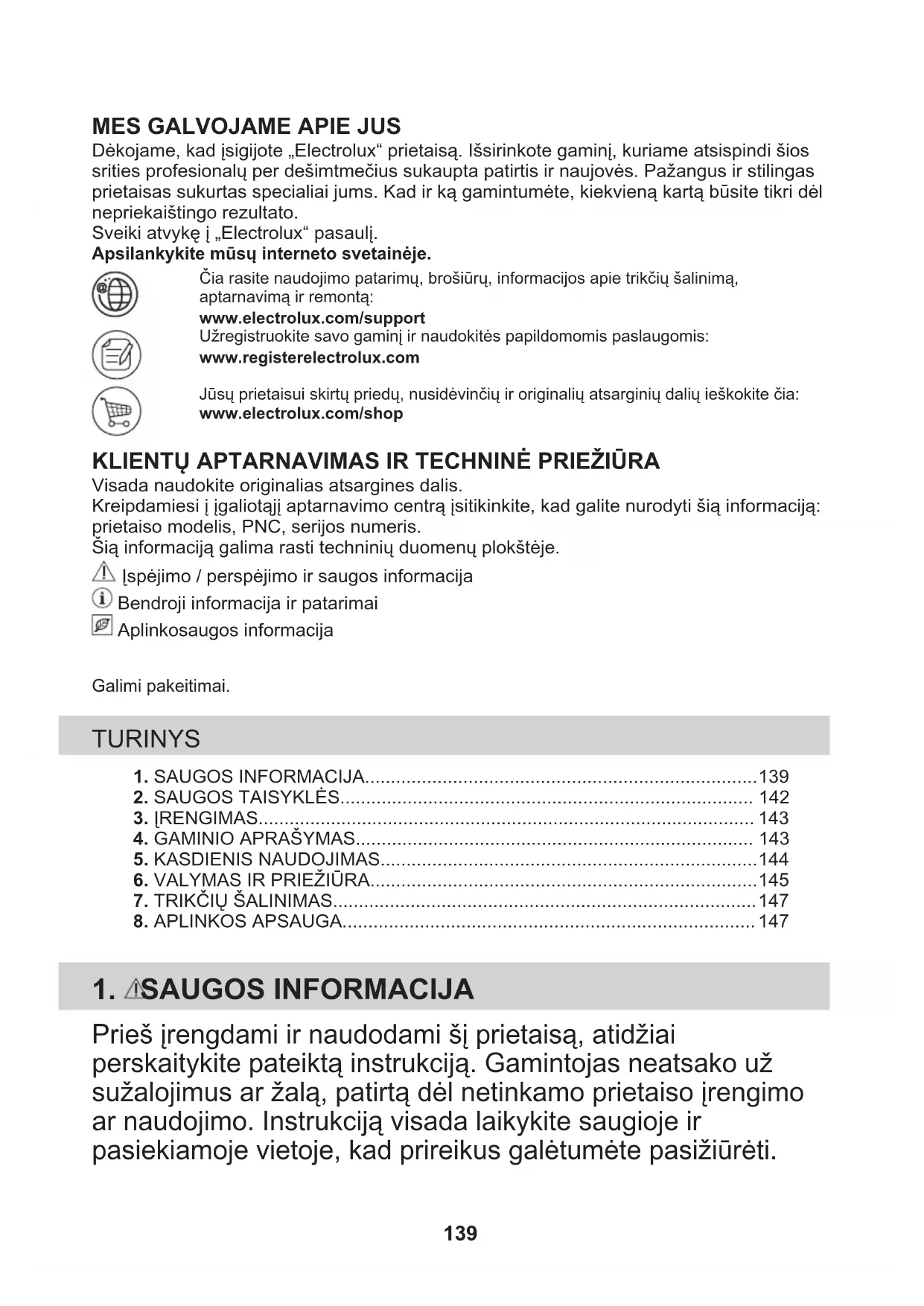 Dėkojame, kad įsigijote „Electrolux“ prietaisą. Išsirinkote gaminį, kuriame atsispindi šiossrities profesionalų per dešimtmečius sukaupta patirtis ir naujovės. Pažangus ir stilingasprietaisas sukurtas specialiai jums. Kad ir ką gamintumėte, kiekvieną kartą būsite tikri dėlnepriekaištingo rezultato.Sveiki atvykę į „Electrolux“ pasaulį.Apsilankykite mūsų interneto svetainėje.Čia rasite naudojimo patarimų, brošiūrų, informacijos apie trikčių šalinimą,aptarnavimą ir remontą:www.electrolux.com/supportUžregistruokite savo gaminį ir naudokitės papildomomis paslaugomis:www.registerelectrolux.comJūsų prietaisui skirtų priedų, nusidėvinčių ir originalių atsarginių dalių ieškokite čia:www.electrolux.com/shop KLIENTŲ APTARNAVIMAS IR TECHNINĖ PRIEŽIŪRA Visada naudokite originalias atsargines dalis.Kreipdamiesi į įgaliotąjį aptarnavimo centrą įsitikinkite, kad galite nurodyti šią informaciją:prietaiso modelis, PNC, serijos numeris.Šią informaciją galima rasti techninių duomenų plokštėje. Įspėjimo / perspėjimo ir saugos informacija Bendroji informacija ir patarimai Aplinkosaugos informacijaGalimi pakeitimai. TURINYS