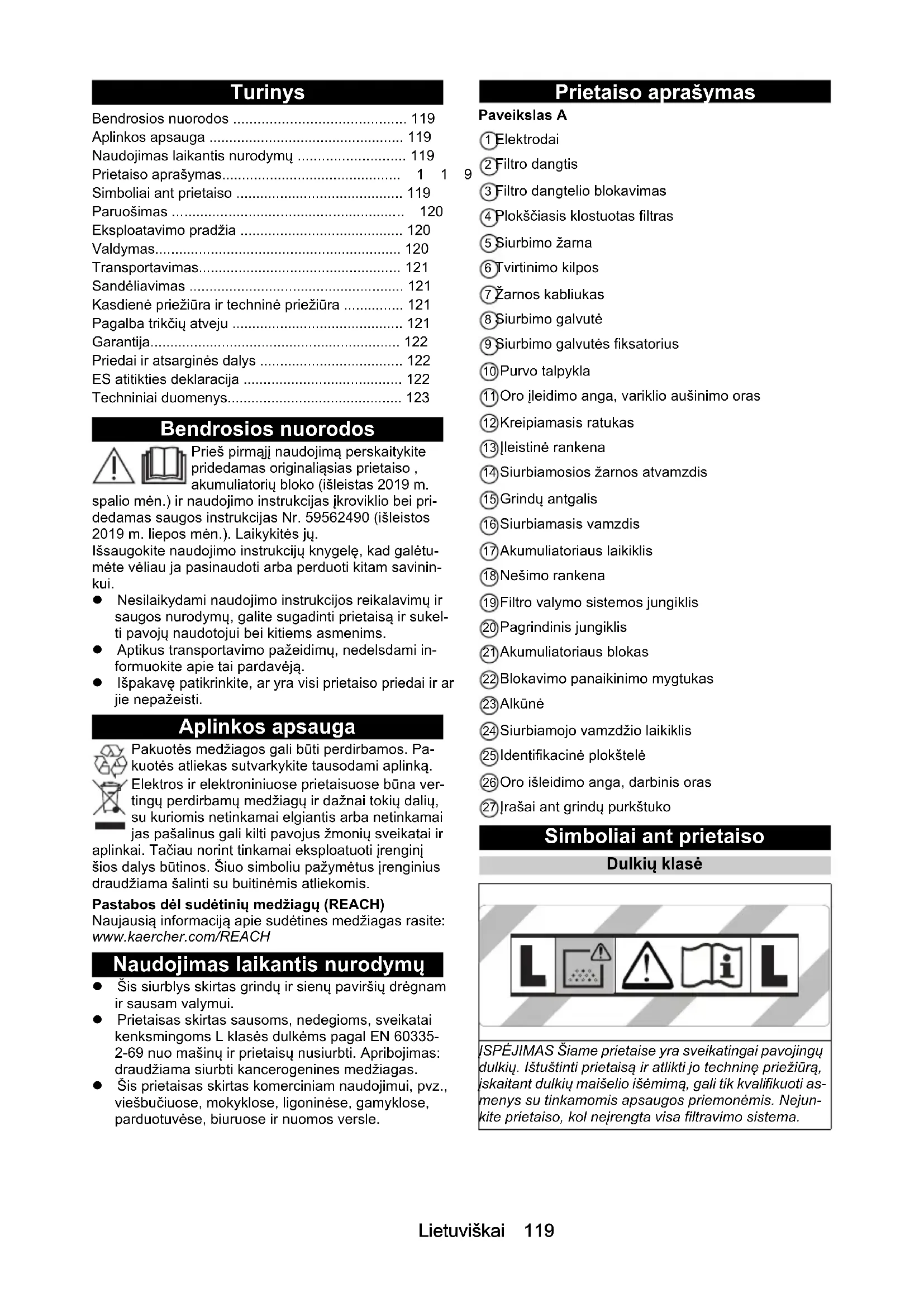 - 0,2Lietuviškai 119 Turinys Bendrosios nuorodos Prieš pirmąjį naudojimą perskaitykite pridedamas originaliąsias prietaiso , akumuliatorių bloko (išleistas 2019 m. spalio mėn.) ir naudojimo instrukcijas įkroviklio bei pri- dedamas saugos instrukcijas Nr. 59562490 (išleistos 2019 m. liepos mėn.). Laikykitės jų. Išsaugokite naudojimo instrukcijų knygelę, kad galėtu- mėte vėliau ja pasinaudoti arba perduoti kitam savinin- kui. Nesilaikydami naudojimo instrukcijos reikalavimų ir saugos nurodymų, galite sugadinti prietaisą ir sukel- ti pavojų naudotojui bei kitiems asmenims. Aptikus transportavimo pažeidimų, nedelsdami in- formuokite apie tai pardavėją. Išpakavę patikrinkite, ar yra visi prietaiso priedai ir ar jie nepažeisti. Aplinkos apsauga Pakuotės medžiagos gali būti perdirbamos. Pa- kuotės atliekas sutvarkykite tausodami aplinką. Elektros ir elektroniniuose prietaisuose būna ver- tingų perdirbamų medžiagų ir dažnai tokių dalių, su kuriomis netinkamai elgiantis arba netinkamai jas pašalinus gali kilti pavojus žmonių sveikatai ir aplinkai. Tačiau norint tinkamai eksploatuoti įrenginį šios dalys būtinos. Šiuo simboliu pažymėtus įrenginius draudžiama šalinti su buitinėmis atliekomis. Pastabos dėl sudėtinių medžiagų (REACH) Naujausią informaciją apie sudėtines medžiagas rasite: www.kaercher.com/REACH Naudojimas laikantis nurodymų Šis siurblys skirtas grindų ir sienų paviršių drėgnam ir sausam valymui. Prietaisas skirtas sausoms, nedegioms, sveikatai kenksmingoms L klasės dulkėms pagal EN 60335- 2-69 nuo mašinų ir prietaisų nusiurbti. Apribojimas: draudžiama siurbti kancerogenines medžiagas. Šis prietaisas skirtas komerciniam naudojimui, pvz., viešbučiuose, mokyklose, ligoninėse, gamyklose, parduotuvėse, biuruose ir nuomos versle. Prietaiso aprašymas Paveikslas A 1 Elektrodai 2 Filtro dangtis 3 Filtro dangtelio blokavimas 4 Plokščiasis klostuotas filtras 5 Siurbimo žarna 6 Tvirtinimo kilpos 7 Žarnos kabliukas 8 Siurbimo galvutė 9 Siurbimo galvutės fiksatorius 10 Purvo talpykla 11 Oro įleidimo anga, variklio aušinimo oras 12 Kreipiamasis ratukas 13 Įleistinė rankena 14 Siurbiamosios žarnos atvamzdis 15 Grindų antgalis 16 Siurbiamasis vamzdis 17 Akumuliatoriaus laikiklis 18 Nešimo rankena 19 Filtro valymo sistemos jungiklis 20 Pagrindinis jungiklis 21 Akumuliatoriaus blokas 22 Blokavimo panaikinimo mygtukas 23 Alkūnė 24 Siurbiamojo vamzdžio laikiklis 25 Identifikacinė plokštelė 26 Oro išleidimo anga, darbinis oras 27 Įrašai ant grindų purkštuko Simboliai ant prietaiso Dulkių klasė Bendrosios nuorodos p. 119