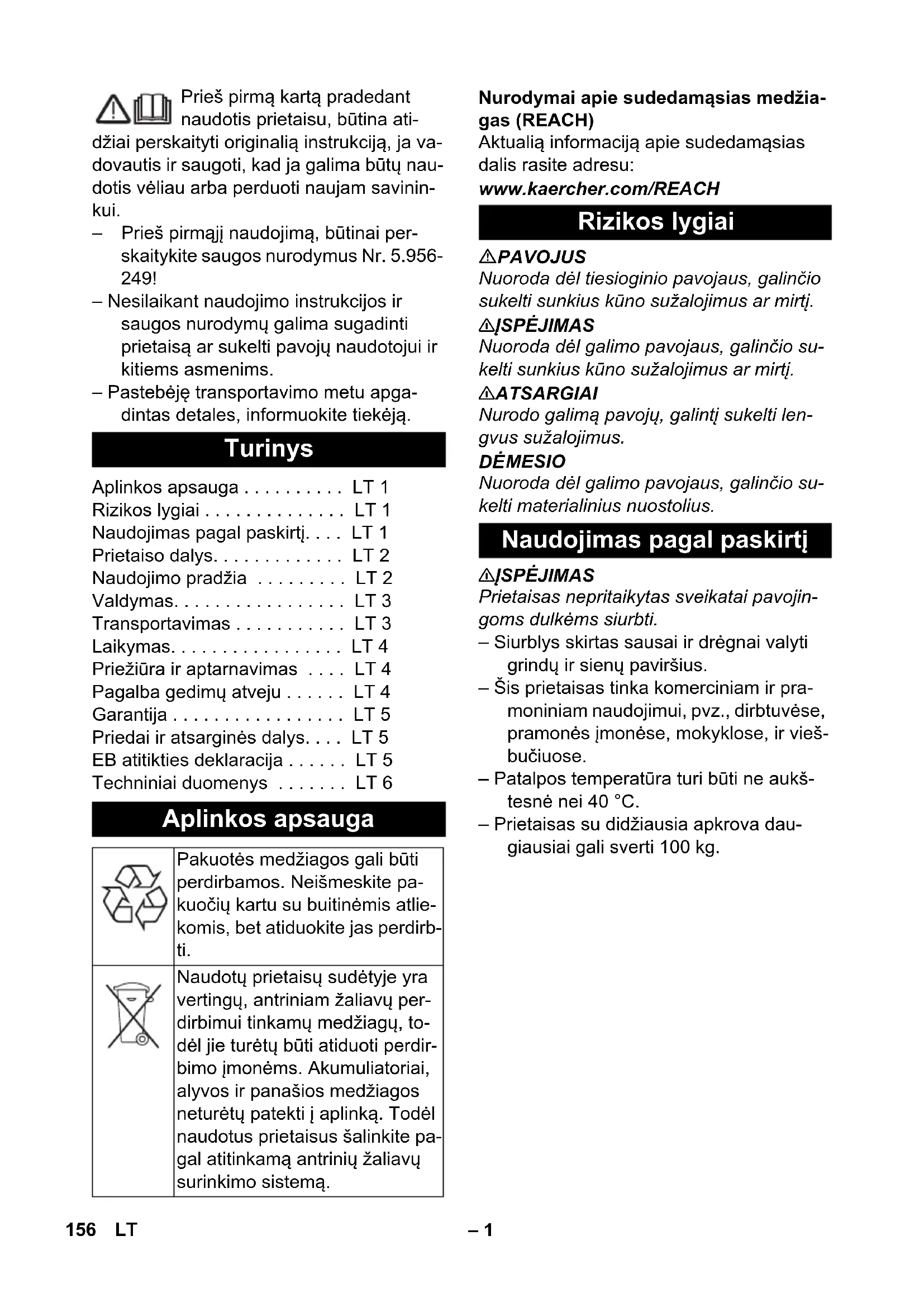 MESIO Nuoroda dėl galimo pavojaus, galinčio su- kelti materialinius nuostolius. 몇 ĮSPĖJIMAS Prietaisas nepritaikytas sveikatai pavojin- goms dulkėms siurbti. – Siurblys skirtas sausai ir drėgnai valyti grindų ir sienų paviršius. – Šis prietaisas tinka komerciniam ir pra- moniniam naudojimui, pvz., dirbtuvėse, pramonės įmonėse, mokyklose, ir vieš- bučiuose. – Patalpos temperatūra turi būti ne aukš- tesnė nei 40 °C. – Prietaisas su didžiausia apkrova dau- giausiai gali sverti 100 kg. Turinys Aplinkos apsauga . . . . . . . . . . LT 1 Rizikos lygiai . . . . . . . . . . . . . . LT 1 Naudojimas pagal paskirtį. . . . LT 1 Prietaiso dalys. . . . . . . . . . . . . LT 2 Naudojimo pradžia . . . . . . . . . LT 2 Valdymas. . . . . . . . . . . . . . . . . LT 3 Transportavimas . . . . . . . . . . . LT 3 Laikymas. . . . . . . . . . . . . . . . . LT 4 Priežiūra ir aptarnavimas . . . . LT 4 Pagalba gedimų atveju . . . . . . LT 4 Garantija . . . . . . . . . . . . . . . . . LT 5 Priedai ir atsarginės dalys. . . . LT 5 EB atitikties deklaracija . . . . . . LT 5 Techniniai duomenys . . . . . . . LT 6 Aplinkos apsauga Pakuotės medžiagos gali būti perdirbamos. Neišmeskite pa- kuočių kartu su buitinėmis atlie- komis, bet atiduokite jas perdirb- ti. Naudotų prietaisų sudėtyje yra vertingų, antriniam žaliavų per- dirbimui tinkamų medžiagų, to- dėl jie turėtų būti atiduoti perdir- bimo įmonėms. Akumuliatoriai, alyvos ir panašios medžiagos neturėtų patekti į aplinką. Todėl naudotus prietaisus šalinkite pa- gal atitinkamą antrinių žaliavų surinkimo sistemą. Rizikos lygiai Naudojimas pagal paskirtį 156 LT– 2 1 Varžtas su žvaigždės formos galvute 2 Lizdinis filtras 3 Mechaninė apsauga nuo perpildymo 4 Siurblio viršutinė dalis 5 Siurbimo žarna 6Stūmimo rankena 7 Kabelio kablys 8 Siurbimo galvutės fiksatorius 9 Purvo rezervuaras 10 Siurbimo antvamzdis 11 Vairuojamasis ratukas 12 Važiuoklė 13 Važiuoklės rankena 14 Antgalis grindims 15 Siurbimo vamzdis 16 Rankena 17 Jungė 18 2 siurbimo turbinos jungiklis 19 1 siurbimo turbinos jungiklis 20 3 siurbimo turbinos jungiklis 21 Antgalio grindims laikiklis 22 Išleidimo žarna 23 Siurbimo vamzdžių laikiklis 24 Antgalio siūlėms laikiklis 25 Elektros laidas 26 Duomenų lentelė DĖMESIO Neviršykite didžiausios leistinos elektros tinklo jungties varžos (žr. „Techniniai duo- menys“). Jei kyla neaiškumų dėl elektros tinklo jungties varžos, kreipkitės į elektros energijos tiekimo įmonę. DĖMESIO Pažeidimo pavojus! Siurbimo metu niekada negalima pašalinti lizdinio filtro. – Siurbiant labai smulkias dulkes galima papildomai naudoti popierinį filtro mai- šelį arba membraninį filtrą (specialus priedas). Paveikslas Atsklęskite ir nuimkite siurblio galvą. Uždėkite popierinį filtro maišelį arba membraninį filtrą (specialusis priedas). Uždėkite ir užsklęskite siurblio galvą. Paveikslas Išmontuokite šepetinį apvad