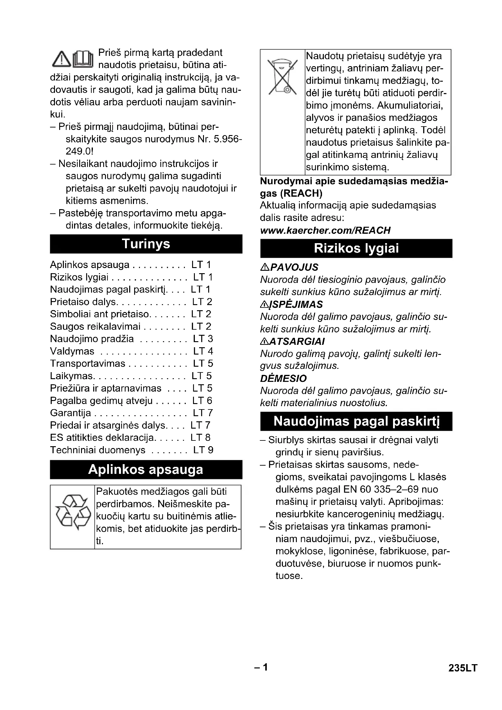 Ap Te L Daļas Nr. Kabeļa ga- rums EU 6.650-867.0 7,5 m GB 6.650-986.0 7,5 m CH 6.650-984.0 7,5 m AU 6.650-985.0 7,5 m 234 LV– 1 Prieš pirmą kartą pradedant naudotis prietaisu, būtina ati- džiai perskaityti originalią instrukciją, ja va- dovautis ir saugoti, kad ja galima būtų nau- dotis vėliau arba perduoti naujam savinin- kui. – Prieš pirmąjį naudojimą, būtinai per- skaitykite saugos nurodymus Nr. 5.956- 249.0! – Nesilaikant naudojimo instrukcijos ir saugos nurodymų galima sugadinti prietaisą ar sukelti pavojų naudotojui ir kitiems asmenims. – Pastebėję transportavimo metu apga- dintas detales, informuokite tiekėją. Nurodymai apie sudedamąsias medžia- gas (REACH) Aktualią informaciją apie sudedamąsias dalis rasite adresu: www.kaercher.com/REACH PAVOJUS Nuoroda dėl tiesioginio pavojaus, galinčio sukelti sunkius kūno sužalojimus ar mirtį. 몇 ĮSPĖJIMAS Nuoroda dėl galimo pavojaus, galinčio su- kelti sunkius kūno sužalojimus ar mirtį. 몇 ATSARGIAI Nurodo galimą pavojų, galintį sukelti len- gvus sužalojimus. DĖMESIO Nuoroda dėl galimo pavojaus, galinčio su- kelti materialinius nuostolius. – Siurblys skirtas sausai ir drėgnai valyti grindų ir sienų paviršius. – Prietaisas skirtas sausoms, nede- gioms, sveikatai pavojingoms L klasės dulkėms pagal EN 60 335–2–69 nuo mašinų ir prietaisų valyti. Apribojimas: nesiurbkite kancerogeninių medžiagų. – Šis prietaisas yra tinkamas pramoni- niam naudojimui, pvz., viešbučiuose, mokyklose, ligoninėse, fabrikuose, par- duotuvėse, biuruose ir nuomos punk- tuose. Turinys Aplinkos apsauga . . . . . . . . . . LT 1 Rizikos lygiai . . . . . . . . . . . . . . LT 1 Naudojimas pagal paskirtį. . . . LT 1 Prietaiso dalys. . . . . . . . . . . . . LT 2 Simboliai ant prietaiso. . . . . . . LT 2 Saugos reikalavimai . . . . . . . . LT 2 Naudojimo pradžia . . . . . . . . . LT 3 Valdymas . . . . . . . . . . . . . . . . LT 4 Transportavimas . . . . . . . . . . . LT 5 Laikymas. . . . . . . . . . . . . . . . . LT 5 Priežiūra ir aptarnavimas . . . . LT 5 Pagalba gedimų atveju . . . . . . LT 6 Garantija . . . . . . . . . . . . . . . . . LT 7 Priedai ir atsarginės dalys. . . . LT 7 ES atitikties deklaracija. . . . . . LT 8 Techniniai duomenys . . . . . . . LT 9 Aplinkos apsauga Pakuotės medžiagos gali būti perdirbamos. Neišmeskite pa- kuočių kartu su buitinėmis atlie- komis, bet atiduokite jas perdirb- ti. Naudotų prietaisų sudėtyje yra vertingų, antriniam žaliavų per- dirbimui tinkamų medžiagų, to- dėl jie turėtų būti atiduoti perdir- bimo įmonėms. Akumuliatoriai, alyvos ir panašios medžiagos neturėtų patekti į aplinką. Todėl naudotus prietaisus šalinkite pa- gal atitinkamą antrinių žaliavų surinkimo sistemą. Rizikos lygiai Naudojimas pagal paskirtį 235LT– 2 1 Elektrodai 2 Siurbimo antvamzdis 3 Siurbimo žarna 4 Žarnos kablys 5 Stūmimo rankenos fiksatorius (tik NT 50/1) 6 Antgalis plyšiams 7 Oro išėjimo anga, darbinis oras 8 Siurblio viršutinė dalis 9 Siurbimo galvutės fiksatorius 10 Rankenos įduba 11 Purvo rezervuaras 12 Vairuojamasis ratukas 13 Rankena (tik NT 50/1) 14 Oro įėjimo anga, variklio aušinimo oras 15 Antgalis grindims 16 Siurbimo vamzdis 17 Įrankių lagamino atrama 18 Guminė mova, prisukama 19 Tvirtinimo kilpos 20 Filtro dangtelis 21 Rankena 22 Siurbimo galios reguliatorius (be pakopų) 23 Įrankio adapteris (tik „Ap Te L“) 24 Stūmimo rankena (tik NT 50/1) 25 Filtro valymo mygtukas 26 Sukamasis jungiklis 27 Kištukinė dėžutė (tik „Ap Te L“) 28 Antgalio grindims laikiklis 29 Išleidimo žarna (tik NT 50/1) 30 Siurbimo vamzdžio laikiklis 31 Kabelio kabliai (tik NT 50/1) 32 Jungė 33 Elektros laidas 34 Antvamzdžio laikiklis (tik NT 30/1, NT 40/1) 35 Filtro korpusas 36 Plokščiasis klostuotas filtras (PES) 37 Filtro valymas 38 Duomenų lentelė PAVOJUS – Jei išmetamas oras grįžta į patalpą, joje turi būti pakankama oro apykaita. Nu- statytoms ribinėms vertėms išlaikyti grįžtančiosios srovės dydis gali sudaryti ne daugiau nei 50% šviežio oro srovės dydžio (patalpos oras V