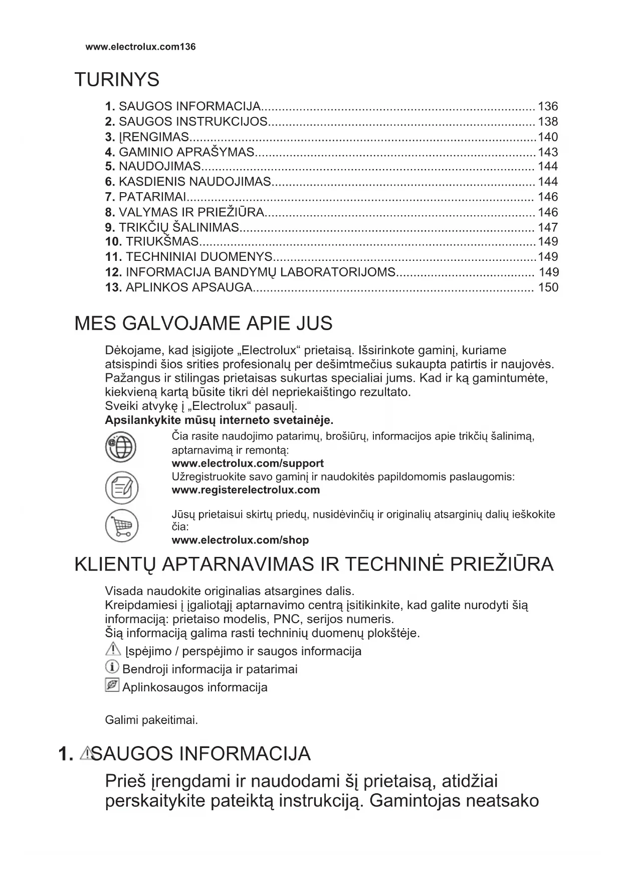 Prieš įrengdami ir naudodami šį prietaisą, atidžiai perskaitykite pateiktą instrukciją. Gamintojas neatsako www.electrolux.com136už sužalojimus ar žalą, patirtą dėl netinkamo prietaiso įrengimo ar naudojimo. Instrukciją visada laikykite saugioje ir pasiekiamoje vietoje, kad prireikus galėtumėte pasižiūrėti.