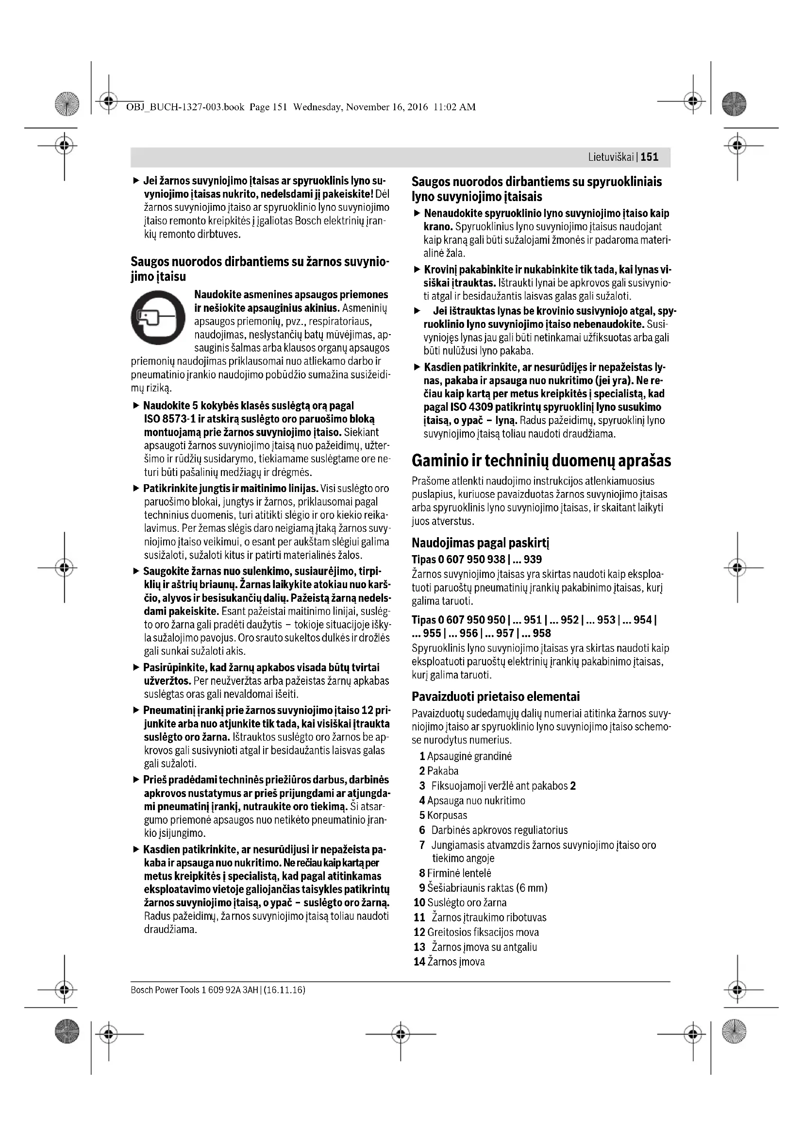 - Kai nustatote darbinę apkrovą, mūvėkite apsauginė- mis pirštinėmis ir tvirtai laikykite šešiabriaunį raktą. Nustačius maksimalią darbinę apkrovą, darbinės apkr ovos reguliatoriaus spyruoklę veikia didelė įtempimo jėga, kuri įspaudus šešiabriaunį raktą gali su smūgiu sumažėti. Šešiabriaunį raktą 9 įstatykite į reguliavimo varžtą 29. Regu- liavimo varžtas daro įtaką darbinės apkrovos reguliatoriaus 6 spyruoklės fiksatoriui. Norėdami traukimo jėgą sumažinti, sukite šešiabriaunį raktą 9 prieš laikrodžio rodyklę. Norėdami traukimo jėgą padidinti, sukite šešiabriaunį raktą 9 pagal laikrodžio rodyklę. – 0 607 950 954 tipo įtaise – maks. 11½ sūkių. – 0 607 950 955 tipo įtaise – maks. 10 sūkių. – 0 607 950 956 tipo įtaise – maks. 4¼ sūkius. Tipas 0 607 950 957 | Kai nustatote darbinę apkrovą, mūvėkite apsauginė- mis pirštinėmis ir tvirtai laikykite šešiabriaunį raktą. Nustačius maksimalią darbinę apkrovą, darbinės apkrovos reguliatoriaus spyruoklę veikia didelė įtempim o jėga, kuri įspaudus šešiabriaunį raktą gali su smūgiu sumažėti. Šešiabriaunį raktą 9 įstatykite į darbinės apkrovos reguliato- riaus 6 spyruoklės fiksatorių. Norėdami traukimo jėgą sumažinti, paspauskite spyruoklės fiksatorių į vidų ir sukite šešiabriaunį raktą 9 prieš laikrodžio rodyklę. Norėdami traukimo jėgą padidinti, paspauskite spyruoklės fiksatorių į vidų ir sukite šešiabriaunį raktą 9 pagal laikrodžio rodyklę. – 0 607 950 957 tipo įtaise – maks. 11 sūkių. – 0 607 950 958 tipo įtaise – maks. 5 sūkius. Priežiūra ir servisas Priežiūra ir valymas Žarnos suvyniojimo įtaisai Prieš pradėdami techninės priežiūros darbus, darbinės apkrovos nustatymus ar prieš prijungdami ar atjungda- mi pneumatinį įrankį, nutraukite oro tiekimą. Ši atsar- gumo priemonė apsaugos nuo netikėto pneumatinio įran- kio įsijungimo. Kasdien patikrinkite, ar nesurūdijusi ir nepažeista pa- kaba ir apsauga nuo nukritimo. Ne rečiau kaip kartą per metus kreipkitės į specialistą, kad pagal atitinkamas eksploatavimo vietoje galiojančias taisykles patikrintų žarnos suvyniojimo įtaisą, o ypač – suslėgto oro žarną. Radus pažeidimų, žarnos suvyniojimo įtaisą toliau naudoti draudžiama. Patepkite visas išorines judančias dalis, pvz., pakabos 2 ir ap- saugos nuo nukritimo 4 trinties vietas. Reguliariai valykite žarnos suvyniojimo įtaiso oro įleidimo an- goje esantį tinklelį. Tuo tikslu išsukite žarnos įmovą 14 ir nuo tinklelio pašalinkite dulkes ir nešvarumus. Po to žarnos įmovą vėl tvirtai įsukite. Siekiant išvengti žarnos suvynioji įtaiso viduje esančių vožtu- vų pažeidimo, įsukant ar išsukant žarnos įmovą 14, oro įleidi- mo angoje 7 esantį jungiamąjį atvamzdį re ikia prilaikyti verž- liarakčiu (rakto plotis 17 mm). Laikykitės alyvos įmaišymo į suslėgtą orą reko- mendacijų, pateiktų pneumatinio įrankio, nau- dojamo su žarnos suvyniojimo įtaisu, naudojimo instrukcijoje! Spyruokliniai lyno suvyniojimo įtaisai Kasdien patikrinkite, ar nesurūdijęs ir nepažeistas ly- nas, pakaba ir apsauga nuo nukritimo (jei yra). Ne re- čiau kaip kartą per metus kreipkitės į specialistą, kad pagal ISO 4309 patikrintų spyruoklinį lyno susukimo įtaisą, o ypač – lyną. Radus pažeidimų, spyruoklinį lyno suvyniojimo įtaisą toliau naudoti draudžiama. Patepkite visas išorines judančias dalis, pvz., pakabos 2 ir ap- saugos nuo nukritimo 4 trinties vietas. Lyną tepant tepalu, kurio sudėtyje nėra rūgščių (vazelinu), pa- ilgėja jo eksploatavimo trukmė. Papildoma įranga Informaciją apie visą kokybiškos papildomos įrangos pro- gramą galite gauti interneto svetainėse www.bosch-pt.com ir www.boschproductiontools.com, arba prekybos įmonėje. Klientų aptarnavimo skyrius ir naudotojų konsultavimo tarnyba Klientų aptarnavimo skyriuje gausite atsakymus į klausimus, susijusius su jūsų gaminio remontu, technine priežiūra bei at- sarginėmis dalimis. Detalius brėžinius ir informaciją apie at- sargines dalis rasite čia: www.bosch-pt.com Bosch naudotojų konsultavimo tarnybos specialistai mielai at- sakys į klausimus apie mūsų gaminius ir papildomą įrangą. Ieškant informacijos ir užsakant atsargines dalis prašome bū- tinai nurodyti dešimtženklį gaminio numerį, esantį firminėje lentelėje. Lietuva Bosch įrankių servisas Informacijos tarnyba: (037) 713350 ļrankių remontas: (037) 713352 Faksas: (037) 713354 El. paštas: service-pt@lv.bosch.com OBJ_BUCH-1327-003.book Page 155 Wednesday, November 16, 2016 11:02 AM156 | 日本語 1 609 92A 3AH | (16.11.16) Bosch Power Tools Šalinimas Žarnos suvyniojimo įtaisas ir spyruoklinis lyno suvyniojimo įtai- sas, papildoma įranga ir pakuotė turi ekologiškai utilizuojami. Tepimo ir valymo medžiagas šalinkite aplinkai ne- kenksmingu būdu. Vykdykite įstatymų reikalavimus. Jei jūsų žarnos suvyniojimo įtaisas ar spyruoklinis lyno suvy- niojimo įtaisas yra nebetinkamas naudoti, prašome atiduoti antriniam perdirbimui arba grąžinti į prekybos vietą, t.y. į įga- liotą Bosch klientų aptarnavimo skyrių. Galimi pakeitimai. p. 958