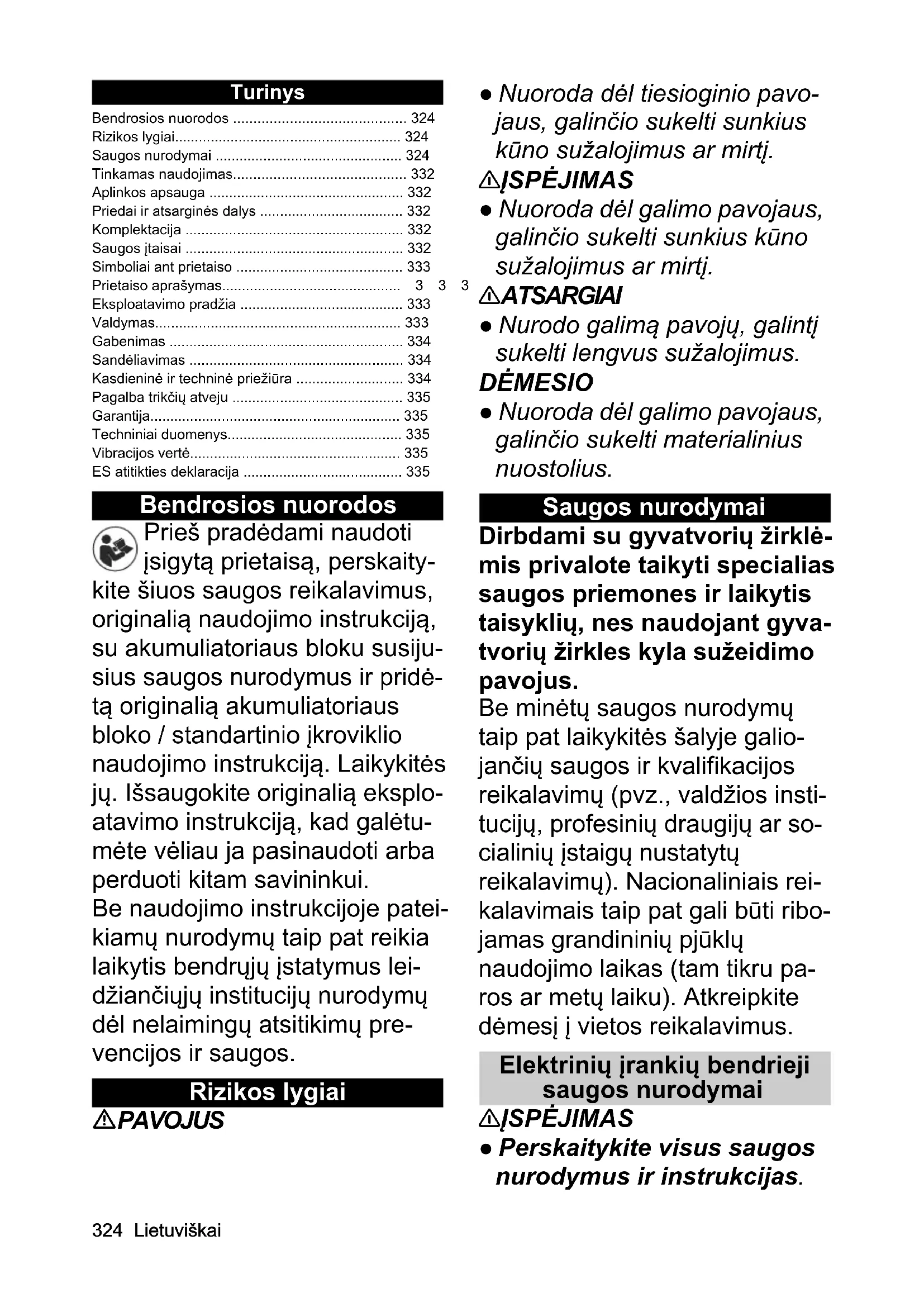 - 1,5 Izmēri un svars Griezuma garums mm 600 Svars (bez akumulatoru pakas) kg 3,45 Chairman of the Board of ManagementDirector Regulatory Affairs & Certification H. Jenner S. Reiser324 Lietuviškai Turinys Bendrosios nuorodos Prieš pradėdami naudoti įsigytą prietaisą, perskaity- kite šiuos saugos reikalavimus, originalią naudojimo instrukciją, su akumuliatoriaus bloku susiju- sius saugos nurodymus ir pridė- tą originalią akumuliatoriaus bloko / standartinio įkroviklio naudojimo instrukciją. Laikykitės jų. Išsaugokite originalią eksplo- atavimo instrukciją, kad galėtu- mėte vėliau ja pasinaudoti arba perduoti kitam savininkui. Be naudojimo instrukcijoje patei- kiamų nurodymų taip pat reikia laikytis bendrųjų įstatymus lei- džiančiųjų institucijų nurodymų dėl nelaimingų atsitikimų pre- vencijos ir saugos. Rizikos lygiai PAVOJUS ● Nuoroda dėl tiesioginio pavo- jaus, galinčio sukelti sunkius kūno sužalojimus ar mirtį. 몇 ĮSPĖJIMAS ● Nuoroda dėl galimo pavojaus, galinčio sukelti sunkius kūno sužalojimus ar mirtį. 몇 ATSARGIAI ● Nurodo galimą pavojų, galintį sukelti lengvus sužalojimus. DĖMESIO ● Nuoroda dėl galimo pavojaus, galinčio sukelti materialinius nuostolius. Saugos nurodymai Dirbdami su gyvatvorių žirklė- mis privalote taikyti specialias saugos priemones ir laikytis taisyklių, nes naudojant gyva- tvorių žirkles kyla sužeidimo pavojus. Be minėtų saugos nurodymų taip pat laikykitės šalyje galio- jančių saugos ir kvalifikacijos reikalavimų (pvz., valdžios insti- tucijų, profesinių draugijų ar so- cialinių įstaigų nustatytų reikalavimų). Nacionaliniais rei- kalavimais taip pat gali būti ribo- jamas grandininių pjūklų naudojimo laikas (tam tikru pa- ros ar metų laiku). Atkreipkite dėmesį į vietos reikalavimus. Elektrinių įrankių bendrieji saugos nurodymai 몇 ĮSPĖJIMAS ● Perskaitykite visus saugos nurodymus ir instrukcijas. Bendrosios nuorodos p. 324