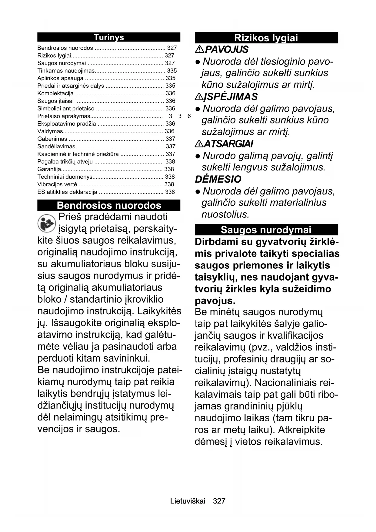 - Saugos nurodymai p. 327