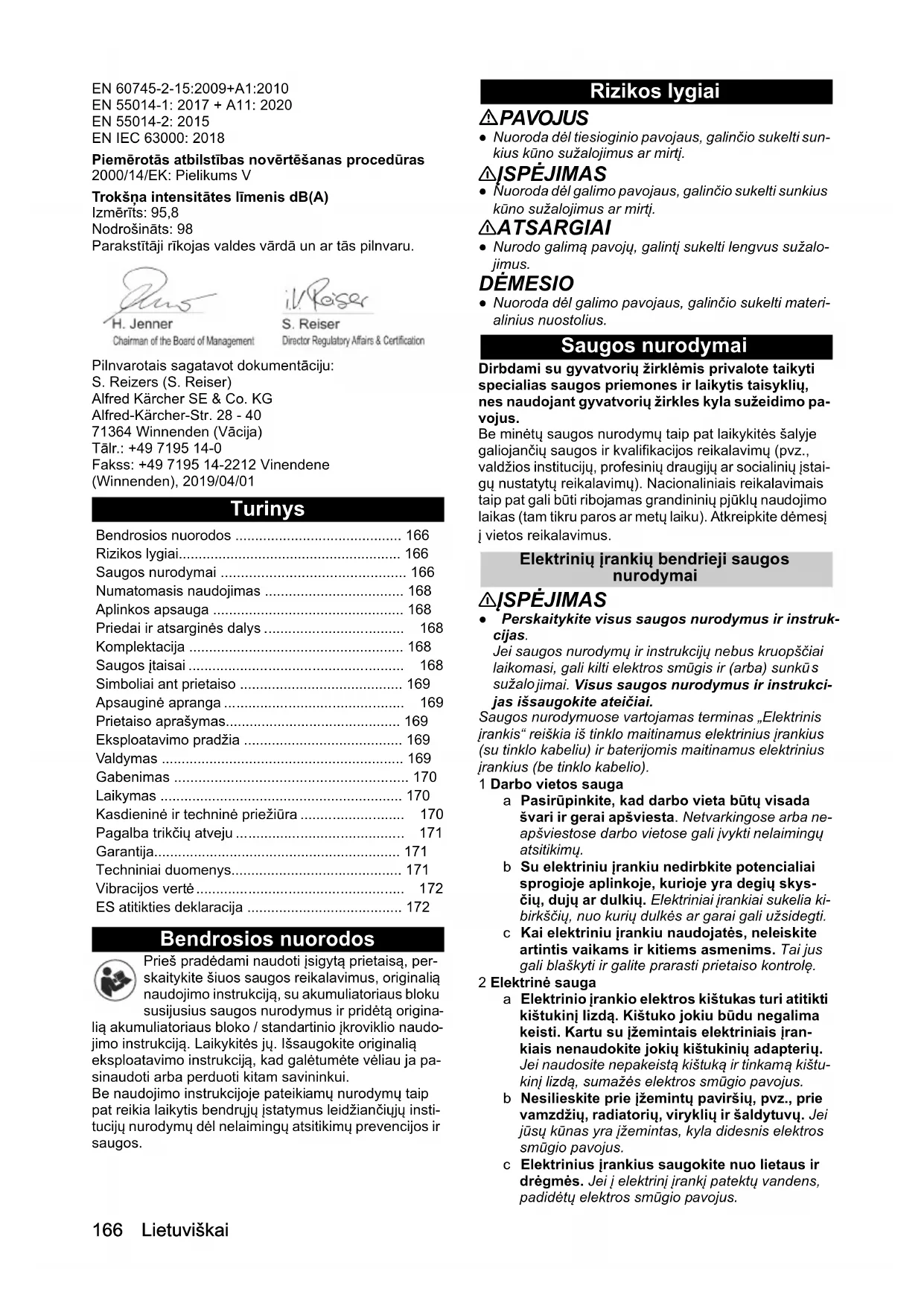 Griezuma garums mm 638 Svars (bez akumulatoru pakas) kg 4,5 HT 650/ 36 Bp166 Lietuviškai EN 60745-2-15:2009+A1:2010 EN 55014-1: 2017 + A11: 2020 EN 55014-2: 2015 EN IEC 63000: 2018 Piemērotās atbilstības novērtēšanas procedūras 2000/14/EK: Pielikums V Trokšņa intensitātes līmenis dB(A) Izmērīts: 95,8 Nodrošināts: 98 Parakstītāji rīkojas valdes vārdā un ar tās pilnvaru. Pilnvarotais sagatavot dokumentāciju: S. Reizers (S. Reiser) Alfred Kärcher SE & Co. KG Alfred-Kärcher-Str. 28 - 40 71364 Winnenden (Vācija) Tālr.: +49 7195 14-0 Fakss: +49 7195 14-2212 Vinendene (Winnenden), 2019/04/01 Turinys Bendrosios nuorodos Prieš pradėdami naudoti įsigytą prietaisą, per- skaitykite šiuos saugos reikalavimus, originalią naudojimo instrukciją, su akumuliatoriaus bloku susijusius saugos nurodymus ir pridėtą origina- lią akumuliatoriaus bloko / standartinio įkroviklio naudo- jimo instrukciją. Laikykitės jų. Išsaugokite originalią eksploatavimo instrukciją, kad galėtumėte vėliau ja pa- sinaudoti arba perduoti kitam savininkui. Be naudojimo instrukcijoje pateikiamų nurodymų taip pat reikia laikytis bendrųjų įstatymus leidžiančiųjų insti- tucijų nurodymų dėl nelaimingų atsitikimų prevencijos ir saugos. Rizikos lygiai PAVOJUS ● Nuoroda dėl tiesioginio pavojaus, galinčio sukelti sun- kius kūno sužalojimus ar mirtį. 몇 ĮSPĖJIMAS ● Nuoroda dėl galimo pavojaus, galinčio sukelti sunkius kūno sužalojimus ar mirtį. 몇 ATSARGIAI ● Nurodo galimą pavojų, galintį sukelti lengvus sužalo- jimus. DĖMESIO ● Nuoroda dėl galimo pavojaus, galinčio sukelti materi- alinius nuostolius. Saugos nurodymai Dirbdami su gyvatvorių žirklėmis privalote taikyti specialias saugos priemones ir laikytis taisyklių, nes naudojant gyvatvorių žirkles kyla sužeidimo pa- vojus. Be minėtų saugos nurodymų taip pat laikykitės šalyje galiojančių saugos ir kvalifikacijos reikalavimų (pvz., valdžios institucijų, profesinių draugijų ar socialinių įstai- gų nustatytų reikalavimų). Nacionaliniais reikalavimais taip pat gali būti ribojamas grandininių pjūklų naudojimo laikas (tam tikru paros ar metų laiku). Atkreipkite dėmesį į vietos reikalavimus. Elektrinių įrankių bendrieji saugos nurodymai 몇 ĮSPĖJIMAS ● Perskaitykite visus saugos nurodymus ir instruk- cijas. Jei saugos nurodymų ir instrukcijų nebus kruopščiai laikomasi, gali kilti elektros smūgis ir (arba) sunkū