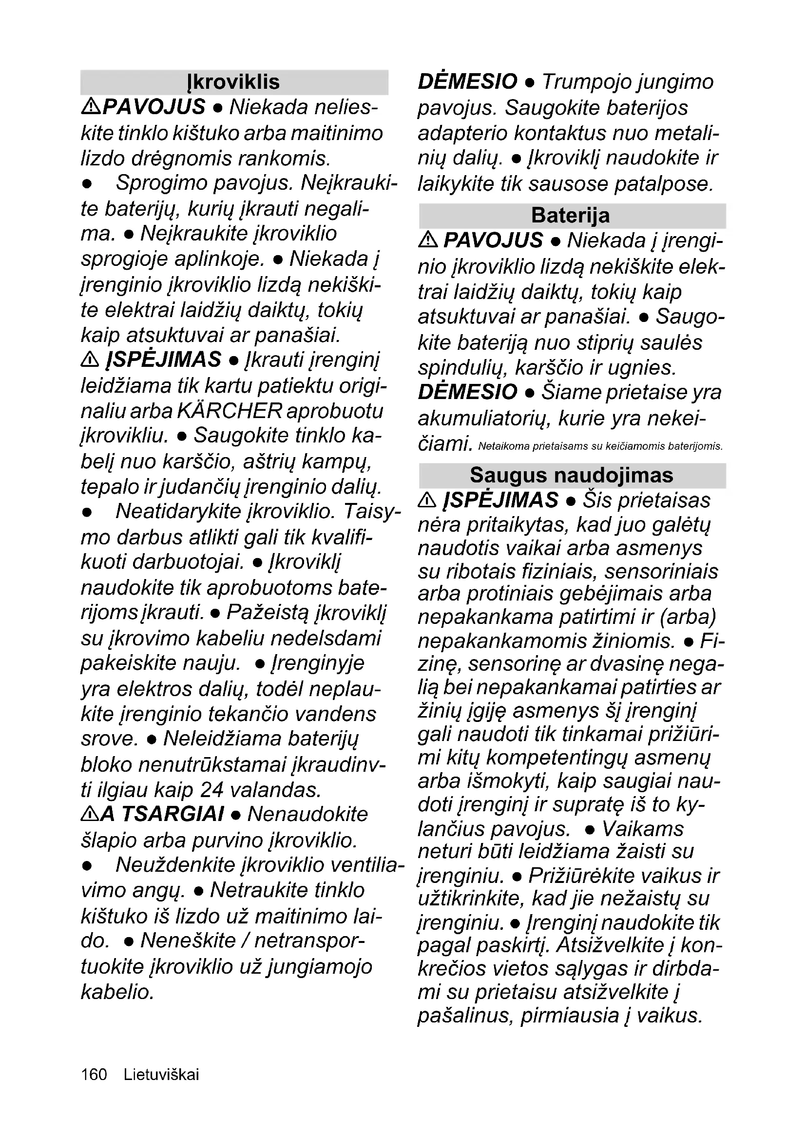 - ES atitikties deklaracija /LHWXYLģNDL Įkroviklis PAVOJUS ● Niekada nelies- kite tinklo kištuko arba maitinimo lizdo drėgnomis rankomis. ● Sprogimo pavojus. Neįkrauki- te baterijų, kurių įkrauti negali- ma. ● Neįkraukite įkroviklio sprogioje aplinkoje. ● Niekada į įrenginio įkroviklio lizdą nekiški- te elektrai laidžių daiktų, tokių kaip atsuktuvai ar panašiai. 몇 ĮSPĖJIMAS ● Įkrauti įrenginį leidžiama tik kartu patiektu origi- naliu arba KÄRCHER aprobuotu įkrovikliu. ● Saugokite tinklo ka- belį nuo karščio, aštrių kampų, tepalo ir judančių įrenginio dalių. ● Neatidarykite įkroviklio. Taisy- mo darbus atlikti gali tik kvalifi- kuoti darbuotojai. ● Įkroviklį naudokite tik aprobuotoms bate- rijoms įkrauti. ● Pažeistą įkroviklį su įkrovimo kabeliu nedelsdami pakeiskite nauju. ● Įrenginyje yra elektros dalių, todėl neplau- kite įrenginio tekančio vandens srove. ● Neleidžiama baterijų bloko nenutrūkstamai įkraudinv- ti ilgiau kaip 24 valandas. 몇 A TSARGIAI ● Nenaudokite šlapio arba purvino įkroviklio. ● Neuždenkite įkroviklio ventilia- vimo angų. ● Netraukite tinklo kištuko iš lizdo už maitinimo lai- do. ● Neneškite / netranspor- tuokite įkroviklio už jungiamojo kabelio. DĖMESIO ● Trumpojo jungimo pavojus. Saugokite baterijos adapterio kontaktus nuo metali- nių dalių. ● Įkroviklį naudokite ir laikykite tik sausose patalpose. Baterija PAVOJUS ● Niekada į įrengi- nio įkroviklio lizdą nekiškite elek- trai laidžių daiktų, tokių kaip atsuktuvai ar panašiai. ● Saugo- kite bateriją nuo stiprių saulės spindulių, karščio ir ugnies. DĖMESIO ● Šiame prietaise yra akumuliatorių, kurie yra nekei- čiami. Netaikoma prietaisams su keičiamomis baterijomis. Saugus naudojimas 몇 ĮSPĖJIMAS ● Šis prietaisas nėra pritaikytas, kad juo galėtų naudotis vaikai arba asmenys su ribotais fiziniais, sensoriniais arba protiniais gebėjimais arba nepakankama patirtimi ir (arba) nepakankamomis žiniomis. ● Fi- zinę, sensorinę ar dvasinę nega- lią bei nepakankamai patirties ar žinių įgiję asmenys šį įrenginį gali naudoti tik tinkamai prižiūri- mi kitų kompetentingų asmenų arba išmokyti, kaip saugiai nau- doti įrenginį ir supratę iš to ky- lančius pavojus. ● Vaikams neturi būti leidžiama žaisti su įrenginiu. ● Prižiūrėkite vaikus ir užtikrinkite, kad jie nežaistų su įrenginiu. ● Įrenginį naudokite tik pagal paskirtį. Atsižvelkite į kon- krečios vietos sąlygas ir dirbda- mi su prietaisu atsižvelkite į pašalinus, pirmiausia į vaikus./LHWXYLģNDL ● Pavojingoje aplinkoje (pvz., degalinėse) vykdykite atitinka- mus saugos nurodymus. Nieka- da nenaudokite įrenginio patalpose, kuriose gresia spro- gimo pavojus. ● Nepurkškite jo- kių objektų, kurių sudėtyje yra sveikatai pavojingų medžiagų (pvz., asbesto). ● Sužalojimų ri- zika. Nenukreipkite skysčio sro- vės į akis. 몇 ATSARGIAI ● Nenaudokite įrenginio, jei jis prieš tai buvo nu- kritęs, yra pastebimai pažeistas arba nesandarus. ● Aparatą eksploatuokite ar sandėliuokite pagal atitinkamą aprašymą ar paveikslą. ● Jokiu būdu nepali- kite veikiančio prietaiso be prie- žiūros. ● Kad aparatas būtų stovus, statykite jį tik ant tvirto, lygaus paviršiaus. ● Prietaisui apvirtus kyla pavojus susižeisti arba sugadinti prietaisą. Prieš imdamiesi bet kokios veiklos su prietaisu ar jo tvarkymo veiksmų turite užtikrinti stovumą. DĖMESIO ● Nepilkite jokių valy- mo priemonių ar kitų priedų. ● Aparato pažeidimai. Į vandens talpyklą nepilkite tirpiklio, skys- čių, kurių sudėtyje yra tirpiklių ar neskiestos rūgšties (pvz., vali- klio, benzino, dažų skiediklio ar acetono). ● Įrenginio pažeidimai dėl sausos eigos. Prietaisą įjun- kite tik tada, kai vandens bake yra vandens. ● Neeksploatuoki- te prietaiso žemesnėje tempera- tūroje kaip 0 °C. Naudojimas laikantis nurodymų Žemo slėgio valymo įrenginį naudokite tik privačioms reikmėms. Žemo slėgio valymo įrenginys skirtas valyti mašinas, automobilius, įrankius, fasadus, terasas, sodo prietai- sus, naminius gyvūnus ir pan., žemo slėgio vandens srove, nenaudojant jokių valymo priemonių. Aplinkos apsauga Pakuotės medžiagos gali būti perdirbamos. Pa- kuotės atliekas sutvarkykite tausodami aplinką. Elektros ir elektroniniuose prietaisuose būna ver- tingų perdirbamų medžiagų ir dažnai tokių dalių, pvz., baterijų, akumuliatorių arba alyvos,su kurio- mis netinkamai elgiantis arba netinkamai jas pa- šalinus gali kilti pavojus žmonių sveikatai ir aplinkai. Tačiau norint tinkamai eksploatuoti įrenginį šios sudeda- mosios dalys būtinos. Šiuo simboliu pažymėtus įrengi- nius draudžiama šalinti su buitinėmis atliekomis. Valymo darbus, kurių metu susidaro alyvos turin- čios nuotekos, pvz., variklių valymas, automobilių dugno plovimas), atlikti galima tik tose valymo vietose, kuriose yra alyvos separatorius. Darbus su valymo priemonėmis atlikti galima tik ant vandeniui atsparių darbinių paviršių su jungtimi prie nešvaraus vandens kanalizacijos. Neleiskite, kad valy- mo priemonės patektų į vandens telkinius arba įsi- skverbtų į dirvožemį. Kai kuriose šalyse draudžiama imti vandenį iš vie- šųjų vandens telkinių. Nuorodos dėl sudėtinių medžiagų (REACH) Naujausią informaciją apie sudėtines medžiagas rasite: www.kaercher.de/REACH Priedai ir atsarginės dalys Naudokite tik originalius priedus ir originalas atsargines dalis – taip užtikrinsite, kad įrenginys veiktų patikimai ir be trikčių. Informaciją apie priedus ir atsargines dalis rasite svetai- nėje www.kaercher.com. Komplektacija Įrenginio tiekiamo komplekto sudėtis parodyta ant pa- kuotės. Išpakavę patikrinkite, ar yra visos įrenginio de- talės. Jei trūksta priedų arba yra transportavimo pažeidimų, praneškite apie tai pardavėjui. Saugos įtais