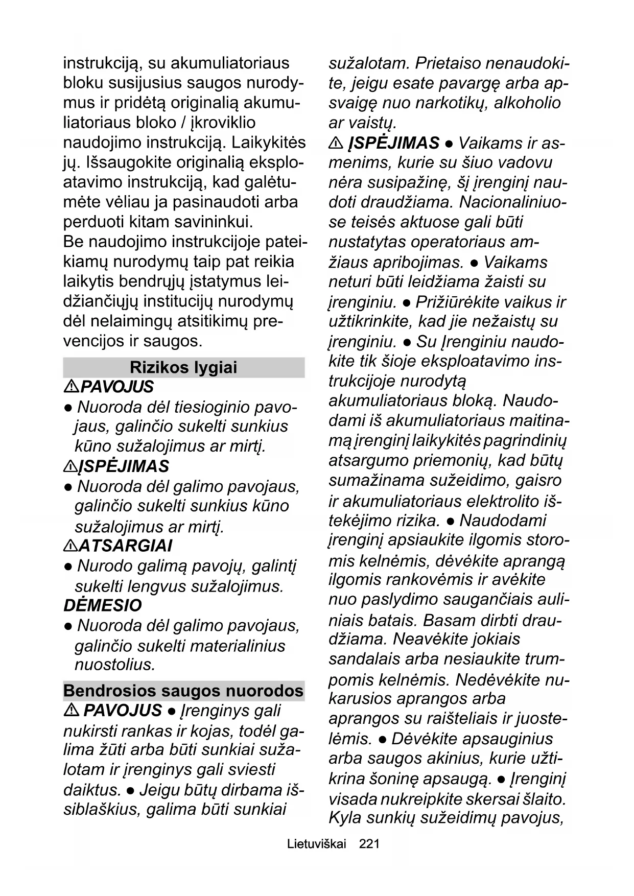 - ES atitikties deklaracija Chairman of the Board of ManagementDirector Regulatory Affairs & Certification H. Jenner S. ReiserLietuviškai 221 instrukciją, su akumuliatoriaus bloku susijusius saugos nurody- mus ir pridėtą originalią akumu- liatoriaus bloko / įkroviklio naudojimo instrukciją. Laikykitės jų. Išsaugokite originalią eksplo- atavimo instrukciją, kad galėtu- mėte vėliau ja pasinaudoti arba perduoti kitam savininkui. Be naudojimo instrukcijoje patei- kiamų nurodymų taip pat reikia laikytis bendrųjų įstatymus lei- džiančiųjų institucijų nurodymų dėl nelaimingų atsitikimų pre- vencijos ir saugos. Rizikos lygiai PAVOJUS ● Nuoroda dėl tiesioginio pavo- jaus, galinčio sukelti sunkius kūno sužalojimus ar mirtį. 몇 ĮSPĖJIMAS ● Nuoroda dėl galimo pavojaus, galinčio sukelti sunkius kūno sužalojimus ar mirtį. 몇 ATSARGIAI ● Nurodo galimą pavojų, galintį sukelti lengvus sužalojimus. DĖMESIO ● Nuoroda dėl galimo pavojaus, galinčio sukelti materialinius nuostolius. Bendrosios saugos nuorodos PAVOJUS ● Įrenginys gali nukirsti rankas ir kojas, todėl ga- lima žūti arba būti sunkiai suža- lotam ir įrenginys gali sviesti daiktus. ● Jeigu būtų dirbama iš- siblaškius, galima būti sunkiai sužalotam. Prietaiso nenaudoki- te, jeigu esate pavargę arba ap- svaigę nuo narkotikų , alkoholio ar vaistų. 몇 ĮSPĖJIMAS ● Vaikams ir as- menims, kurie su šiuo vadovu nėra susipažinę, šį įrenginį nau- doti draudžiama. Nacionaliniuo- se teisės aktuose gali būti nustatytas operatoriaus am- žiaus apribojimas. ● Vaikams neturi būti leidžiama žaisti su įrenginiu. ● Prižiūrėkite vaikus ir užtikrinkite, kad jie nežaistų su įrenginiu. ● Su Įrenginiu naudo- kite tik šioje eksploatavimo ins- trukcijoje nurodytą akumuliatoriaus bloką. Naudo- dami iš akumuliatoriaus maitina- mą įrenginį laikykitės pagrindinių atsargumo priemonių, kad būtų sumažinama sužeidimo, gaisro ir akumuliatoriaus elektrolito iš- tekėjimo rizika. ● Naudodami įrenginį apsiaukite ilgomis storo- mis kelnėmis, dėvėkite aprangą ilgomis rankovėmis ir avėkite nuo paslydimo saugančiais auli- niais batais. Basam dirbti drau- džiama. Neavėkite jokiais sandalais arba nesiaukite trum- pomis kelnėmis. Nedėvėkite nu- karusios aprangos arba aprangos su raišteliais ir juoste- lėmis. ● Dėvėkite apsauginius arba saugos akinius, kurie užti- krina šoninę apsaugą. ● Įrenginį visada nukreipkite skersai šlaito. Kyla sunkių sužeidimų pavojus,222 Lietuviškai jeigu dirbdami ant šlaitų įrenginį nukreipsite į viršų arba į apačią. ● Naudodami įrenginį nebėkite, o eikite. Stenkitės tvirtai stovėti ir visą laiką išlaikykite pusiausvy- rą, visų pirma tuo atveju, jeigu dirbate ant šlaitų. ● Pavojingo įvykio pavojus paslydus. Nedirb- kite su įrenginiu ant stačių šlaitų, duobių krašto ir ant pernelyg staigių įkalnių arba atkalnių. 몇 ATSARGIAI ● Susipažinkite su Įrenginio valdymo elementais ir jo naudojimu pagal paskirtį. Darbo vietos sauga PAVOJUS ● Gresia sunkūs sužeidimai, jeigu peilis sviestų kokius nors daiktus arba jeigu pjovimo įrankis įsuktų vielą ar virvę. Prieš imdamiesi darbo ati- džiai apžiūrėkite darbo zoną, ar joje nėra akmenų, lazdų, metalo, vielų, kaulų arba žaislų ir juos pašalinkite. ● Įrenginį naudoti draudžiama, jeigu žmonės, visų pirma vaikai arba gyvūnai, stovi arčiau kaip 15 metrų, nes kyla pavojus, kad pjovimo peilis gali sviesti daiktus. ● Sprogimo pa- vojus. Įrenginys kibirkščiuoja, todėl dulkės, dujos arba garai gali užsiliepsnoti. Su įrenginiu nedirbkite potencialiai sprogioje aplinkoje, kurioje yra degiųjų skysčių, dujų ar dulkių. ● Vai- kams gresiantys pavojingi nelai- mingi atsitikimai. Vaikai gali susidomėti įrenginiu ir jo naudo- jimu. Neišleiskite vaikų iš akių, nes jie ne visada lieka toje vieto- je, kurioje juos matėte paskutinį kartą. 몇 ĮSPĖJIMAS ● Įrenginį naudo- ti draudžiama, jeigu gali smogti žaibas. ● Pjaukite visada švie- siuoju paros metu arba užsitikri- nę pakankamą dirbtinį apšvietimą. ● Pasirūpinkite, kad vaikai būtų atokiai nuo pjovimo zonos ir kad juos prižiūrėtų su- augusysis, kuris nėra operato- rius; būkite budrus ir jeigu vaikas įžengia į pjovimo zoną, tada įrenginį išjunkite. ● Būkite ati- dūs, kai artėjate prie aklinų kam- pų, krūmynų, medžių arba tų objektų, kurie jums apriboja ap- žvelgiamum p. 228