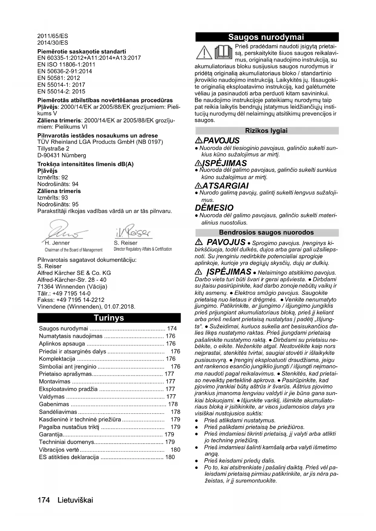 EN 50636-2-91:2014 EN 50581: 2012 EN 55014-1: 2017 EN 55014-2: 2015 Taikoma atitikties įvertinimo procedūra Krūmapjovė: 2000/14/EB ir pakeista 2005/88/EB: V priedas Vejapjovė: 2000/14/EB ir pakeista 2005/88/EB: VI prie- das Registruotosios institucijos pavadinimas ir adresas „TÜV Rheinland LGA Products GmbH“ (NB 0197) Tillystraße 2 D-90431 Niurnbergas Svertinis garso galios lygis dB(A) Krūmapjovė Išmatuotas: 92 Garantuojamas: 94 Vejapjovė Išmatuotas: 93 Garantuojamas: 95 Pasirašantys asmenys veikia pagal bendrovės vadovų įgaliojimus. Dokumentacijos tvarkytojas: S. Reiser Alfred Kärcher SE & Co. KG Alfred-Kärcher-Str. 28 - 40 71364 Vinendenas, Vokietija Tel.: +49 7195 14-0 Faks.: +49 7195 14-2212 Vinendenas, 2018-07-01