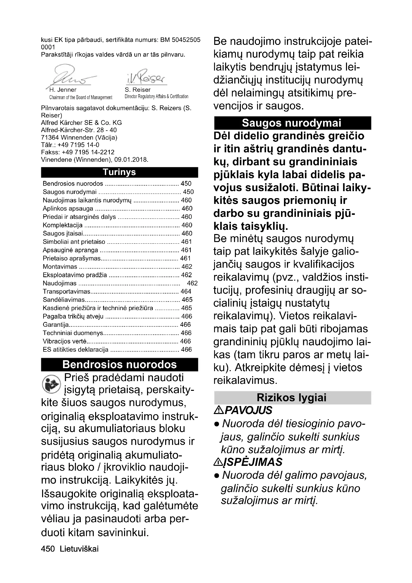 - Parakstītāji rīkojas valdes vārdā un ar tās pilnvaru. Pilnvarotais sagatavot dokumentāciju: S. Reizers (S. Reiser) Alfred Kärcher SE & Co. KG Alfred-Kärcher-Str. 28 - 40 71364 Winnenden (Vācija) Tālr.: +49 7195 14-0 Fakss: +49 7195 14-2212 Vinendene (Winnenden), 09.01.2018. Turinys Bendrosios nuorodos Prieš pradėdami naudoti įsigytą prietaisą, perskaity- kite šiuos saugos nurodymus, originalią eksploatavimo instruk- ciją, su akumuliatoriaus bloku susijusius saugos nurodymus ir pridėtą originalią akumuliato- riaus bloko / įkroviklio naudoji- mo instrukciją. Laikykitės jų. Išsaugokite originalią eksploata- vimo instrukciją, kad galėtumėte vėliau ja pasinaudoti arba per- duoti kitam savininkui. Be naudojimo instrukcijoje patei- kiamų nurodymų taip pat reikia laikytis bendrųjų įstatymus lei- džiančiųjų institucijų nurodymų dėl nelaimingų atsitikimų pre- vencijos ir saugos. Saugos nurodymai Dėl didelio grandinės greičio ir itin aštrių grandinės dantu- kų, dirbant su grandininiais pjūklais kyla labai didelis pa- vojus susižaloti. Būtinai laiky- kitės saugos priemonių ir darbo su grandininiais pjū- klais taisyklių. Be minėtų saugos nurodymų taip pat laikykitės šalyje galio- jančių saugos ir kvalifikacijos reikalavimų (pvz., valdžios insti- tucijų, profesinių draugijų ar so- cialinių įstaigų nustatytų reikalavimų). Vietos reikalavi- mais taip pat gali būti ribojamas grandininių pjūklų naudojimo lai- kas (tam tikru paros ar metų lai- ku). Atkreipkite dėmesį į vietos reikalavimus. Rizikos lygiai PAVOJUS ● Nuoroda dėl tiesioginio pavo- jaus, galinčio sukelti sunkius kūno sužalojimus ar mirtį. 몇 ĮSPĖJIMAS ● Nuoroda dėl galimo pavojaus, galinčio sukelti sunkius kūno sužalojimus ar mirtį. Bendrosios nuorodos p. 450