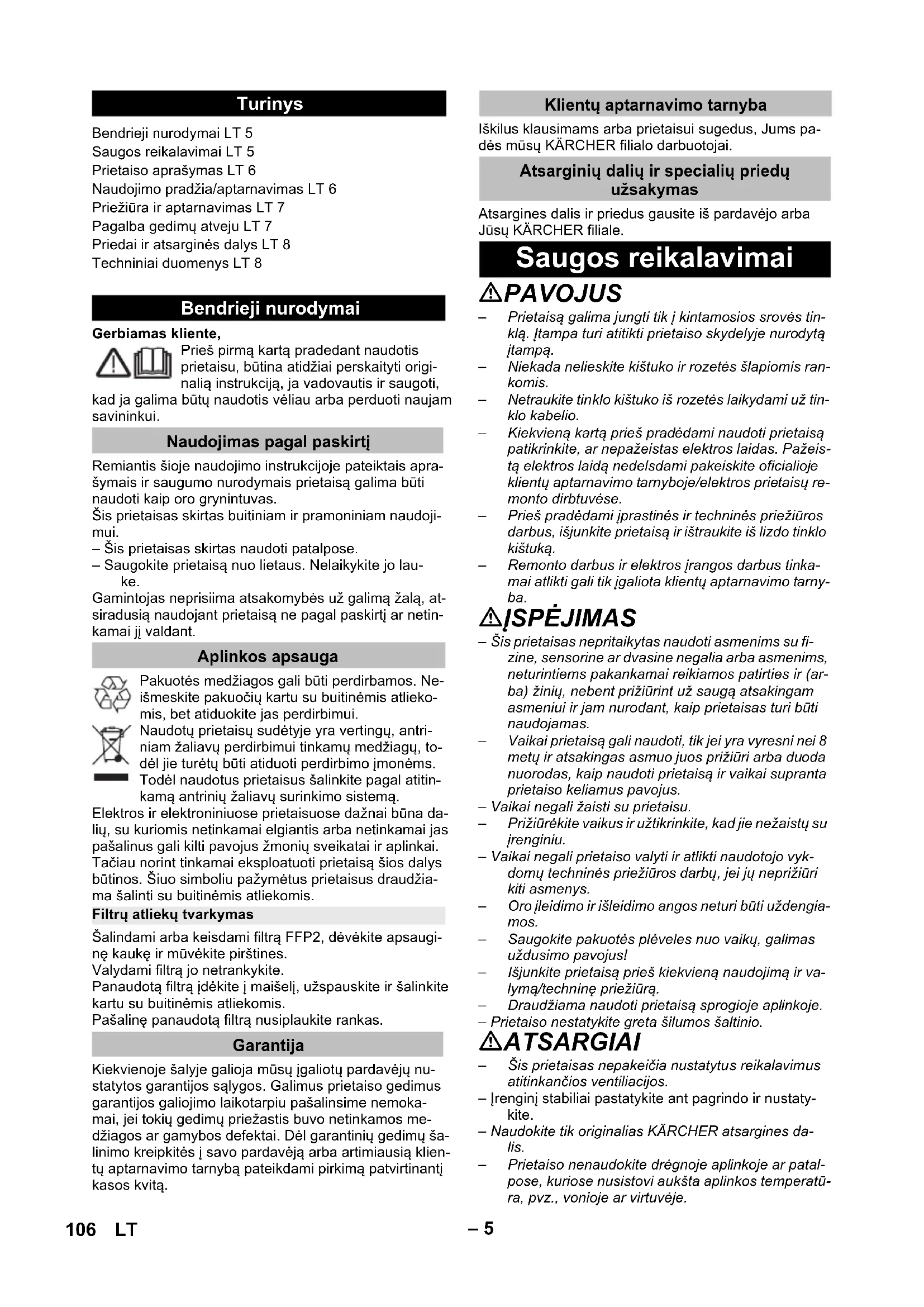 dB(A) dB(A) dB(A) 105LV– 5 Gerbiamas kliente, Prieš pirmą kartą pradedant naudotis prietaisu, būtina atidžiai perskaityti origi- nalią instrukciją, ja vadovautis ir saugoti, kad ja galima būtų naudotis vėliau arba perduoti naujam savininkui. Remiantis šioje naudojimo instrukcijoje pateiktais apra- šymais ir saugumo nurodymais prietaisą galima būti naudoti kaip oro grynintuvas. Šis prietaisas skirtas buitiniam ir pramoniniam naudoji- mui. – Šis prietaisas skirtas naudoti patalpose. – Saugokite prietaisą nuo lietaus. Nelaikykite jo lau- ke. Gamintojas neprisiima atsakomybės už galimą žalą, at- siradusią naudojant prietaisą ne pagal paskirtį ar netin- kamai jį valdant. Pakuotės medžiagos gali būti perdirbamos. Ne- išmeskite pakuočių kartu su buitinėmis atlieko- mis, bet atiduokite jas perdirbimui. Naudotų prietaisų sudėtyje yra vertingų, antri- niam žaliavų perdirbimui tinkamų medžiagų, to- dėl jie turėtų būti atiduoti perdirbimo įmonėms. Todėl naudotus prietaisus šalinkite pagal atitin- kamą antrinių žaliavų surinkimo sistemą. Elektros ir elektroniniuose prietaisuose dažnai būna da- lių, su kuriomis netinkamai elgiantis arba netinkamai jas pašalinus gali kilti pavojus žmonių sveikatai ir aplinkai. Tačiau norint tinkamai eksploatuoti prietaisą šios dalys būtinos. Šiuo simboliu pažymėtus prietaisus draudžia- ma šalinti su buitinėmis atliekomis. Šalindami arba keisdami filtrą FFP2, dėvėkite apsaugi- nę kaukę ir mūvėkite pirštines. Valydami filtrą jo netrankykite. Panaudotą filtrą įdėkite į maišelį, užspauskite ir šalinkite kartu su buitinėmis atliekomis. Pašalinę panaudotą filtrą nusiplaukite rankas. Kiekvienoje šalyje galioja mūsų įgaliotų pardavėjų nu- statytos garantijos sąlygos. Galimus prietaiso gedimus garantijos galiojimo laikotarpiu pašalinsime nemoka- mai, jei tokių gedimų priežastis buvo netinkamos me- džiagos ar gamybos defektai. Dėl garantinių gedimų ša- linimo kreipkitės į savo pardavėją arba artimiausią klien- tų aptarnavimo tarnybą pateikdami pirkimą patvirtinantį kasos kvitą. Iškilus klausimams arba prietaisui sugedus, Jums pa- dės mūsų KÄRCHER filialo darbuotojai. Atsargines dalis ir priedus gausite iš pardavėjo arba Jūsų KÄRCHER filiale. PAVOJUS – Prietaisą galima jungti tik į kintamosios srovės tin- klą. Įtampa turi atitikti prietaiso skydelyje nurodytą įtampą. – Niekada nelieskite kištuko ir rozetės šlapiomis ran- komis. – Netraukite tinklo kištuko iš rozetės laikydami už tin- klo kabelio. – Kiekvieną kartą prieš pradėdami naudoti prietaisą patikrinkite, ar nepažeistas elektros laidas. Pažeis- tą elektros laidą nedelsdami pakeiskite oficialioje klientų aptarnavimo tarnyboje/elektros prietaisų re- monto dirbtuvėse. – Prieš pradėdami įprastinės ir techninės priežiūros darbus, išjunkite prietaisą ir ištraukite iš lizdo tinklo kištuką. – Remonto darbus ir elektros įrangos darbus tinka- mai atlikti gali tik įgaliota klientų aptarnavimo tarny- ba. ĮSPĖJIMAS – Šis prietaisas nepritaikytas naudoti asmenims su fi- zine, sensorine ar dvasine negalia arba asmenims, neturintiems pakankamai reikiamos patirties ir (ar- ba) žinių, nebent prižiūrint už saugą atsakingam asmeniui ir jam nurodant, kaip prietaisas turi būti naudojamas. – Vaikai prietaisą gali naudoti, tik jei yra vyresni nei 8 metų ir atsakingas asmuo juos prižiūri arba duoda nuorodas, kaip naudoti prietaisą ir vaikai supranta prietaiso keliamus pavojus. – Vaikai negali žaisti su prietaisu. – Prižiūrėkite vaikus ir užtikrinkite, kad jie nežaistų su įrenginiu. – Vaikai negali prietaiso valyti ir atlikti naudotojo vyk- domų techninės priežiūros darbų, jei jų neprižiūri kiti asmenys. – Oro įleidimo ir išleidimo angos neturi būti uždengia- mos. – Saugokite pakuotės plėveles nuo vaikų, galimas uždusimo pavojus! – Išjunkite prietaisą prieš kiekvieną naudojimą ir va- lymą/techninę priežiūrą. – Draudžiama naudoti prietaisą sprogioje aplinkoje. – Prietaiso nestatykite greta šilumos šaltinio. ATSARGIAI – Šis prietaisas nepakeičia nustatytus reikalavimus atitinkančios ventiliacijos. – Įrenginį stabiliai pastatykite ant pagrindo ir nustaty- kite. – Naudokite tik originalias KÄRCHER atsargines da- lis. – Prietaiso nenaudokite drėgnoje aplinkoje ar patal- pose, kuriose nusistovi aukšta aplinkos temperatū- ra, pvz., vonioje ar virtuvėje. Turinys Bendrieji nurodymai LT 5 Saugos reikalavimai LT 5 Prietaiso aprašymas LT 6 Naudojimo pradžia/aptarnavimas LT 6 Priežiūra ir aptarnavimas LT 7 Pagalba gedimų atveju LT 7 Priedai ir atsarginės dalys LT 8 Techniniai duomenys LT 8 Bendrieji nurodymai Naudojimas pagal paskirtį Aplinkos apsauga Filtrų atliekų tvarkymas Garantija Klientų aptarnavimo tarnyba Atsarginių dalių ir specialių priedų užsakymas Saugos reikalavimai 106 LT– 6 PAVOJUS Nuoroda dėl tiesioginio pavojaus, galinčio sukelti sun- kius kūno sužalojimus ar mirtį. 몇 ĮSPĖJIMAS Nuoroda dėl galimo pavojaus, galinčio sukelti sunkius kūno sužalojimus ar mirtį. 몇 ATSARGIAI Nurodo galimą pavojų, galintį sukelti lengvus sužaloji- mus. DĖMESIO Nuoroda dėl galimo pavojaus, galinčio sukelti materiali- nius nuostolius. Išpakuodami prietaisą patikrinkite, ar netrūksta priedų ir ar nėra pažeidimų. Jei prietaisas pažeistas gabenimo metu, praneškite apie tai pardavėjui. Paveikslus rasite išlankstomame pus- lapyje! 1 Filtro gaubtas (iš priekio) 2 Pirminis filtras 3 Pagrindinis filtras 4 Filtro gaubtas (iš galo) 5 Oro išleidimo anga 6 Skaitmeninis rodytuvas 7 Valdymo plotas 8 Oro kokybės rodytuvas 9 Filtro gaubto rankenėlė 10 Oro kokybės jutiklio gaubtas 11 Elektros tinklo duomenys 12 Valdymo mygtukas (įjungimo / išjungimo) 13 Valdymo mygtukas „Rankinis režimas“ 14 Valdymo mygtukas „Automatinis režimas“ 15 Valdymo