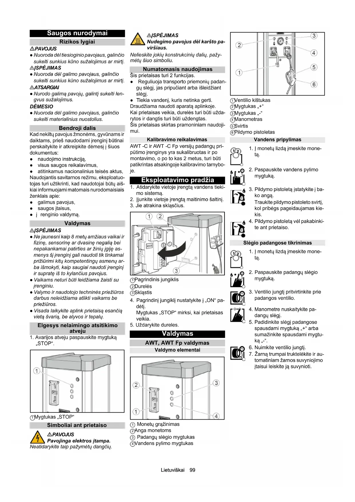 „STOP“. 1 Mygtukas „STOP“ Simboliai ant prietaiso PAVOJUS Pavojinga elektros įtampa. Neatidarykite taip pažymėtų dangčių. 몇ĮSPĖJIMAS Nudegimo pavojus dėl karšto pa- viršiaus. Nelieskite jokių konstrukcinių dalių, pažy- mėtų šiuo simboliu. Numatomasis naudojimas Šis prietaisas turi 2 funkcijas. ● Reguliuoja transporto priemonių padan- gų slėgį, jas pripučiant arba išleidžiant slėgį. ● Tiekia vandenį, kuris netinka gerti. Draudžiama naudoti aparatą aplinkoje. Kai prietaisas veikia, durelės turi būti užda- rytos ir dangtis turi būti uždengtas. Šis prietaisas skirtas pramoniniam naudoji- mui. Kalibravimo reikalavimas AWT -C ir AWT -C Fp versijų padangų pri- pūtimo įrenginys yra sukalibruotas ir po montavimo, o po to kas 2 metus, turi būti patikrintas atsakingoje kalibravimo tarnybo- je. Eksploatavimo pradžia