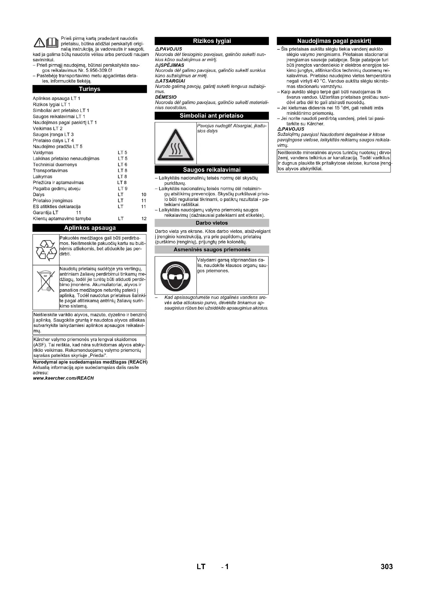 Ūdens padeve pH vērtība 6,5...9,5elektrovadītspēja < 2000 µS/cmizvadāmās vielas < 0,5 mg/l *filtrējamās vielas (daļiņu lielums mazāks par 0,025 mm)< 20 mg/logļūdeņraži < 20 mg/lhlorīdi < 300 mg/lkalcijs < 85 mg/l **kopējā ūdens cietība < 15 °dH **dzelzs < 0,5 mg/lmangāns < 0,05 mg/lvarš < 0,02 mg/lbez nepatīkamas smakas Elektropadeve ES Atbilstības deklarācija Produkts: Augstspiediena tīrīšanas aparātsPadomi: 2.509-xxxAttiecīgās ES direktīvas:2006/42/EK (+2009/127/EK)2009/125/EK2011/65/ES2014/30/ESPiemērotās harmonizētās normas:EN IEC 63000: 2018EN 55014–1: 2017 + A11: 2020EN 55014–2: 2015EN 60335–1EN 60335–2–79EN 61000–3–2: 2014EN 61000–3–3: 2013EN 61000–3–12: 2011EN 61000–6–2: 2005EN 61000–6–4: 2007EN 62233: 2008piemērotie noteikumi(EU) 2019/1781 Garantija Chairman of the Board of ManagementDirector Regulatory Affairs & Certification 301LV- 12 Klientu apkalpošanas dienests Iekārtas tips: Ražotāja Nr.: Ekspluatācija uzsākta: Pārbaude veikta: Pārbaudes rezultāts: Paraksts Pārbaude veikta: Pārbaudes rezultāts: Paraksts Pārbaude veikta: Pārbaudes rezultāts: Paraksts Pārbaude veikta: Pārbaudes rezultāts: Paraksts 302 LV- 1 Prieš pirmą kartą pradedant naudotis prietaisu, būtina atidžiai perskaityti origi- nalią instrukciją, ja vadovautis ir saugoti, kad ja galima būtų naudotis vėliau arba perduoti naujam savininkui. – Prieš pirmąjį naudojimą, būtinai perskaitykite sau- gos reikalavimus Nr. 5.956-309.0! – Pastebėję transportavimo metu apgadintas deta- les, informuokite tiekėją. Nurodymai apie sudedamąsias medžiagas (REACH) Aktualią informaciją apie sudedamąsias dalis rasite adresu: www.kaercher.com/REACH PAVOJUS Nuoroda dėl tiesioginio pavojaus, galinčio sukelti sun- kius kūno sužalojimus ar mirtį. 몇 ĮSPĖJIMAS Nuoroda dėl galimo pavojaus, galinčio sukelti sunkius kūno sužalojimus ar mirtį. 몇 ATSARGIAI Nurodo galimą pavojų, galintį sukelti lengvus sužaloji- mus. DĖMESIO Nuoroda dėl galimo pavojaus, galinčio sukelti materiali- nius nuostolius. – Laikykitės nacionalinių teisės normų dėl skysčių purkštuvų. – Laikykitės nacionalinių teisės normų dėl nelaimin- gų atsitikimų prevencijos. Skysčių purkštuvai priva- lo būti reguliariai tikrinami, o patikrų rezultatai - pa- teikiami raštiškai. – Laikykitės naudojamų valymo priemonių saugos reikalavimų (dažniausiai pateikiami ant etiketės). Darbo vieta yra ekrane. Kitos darbo vietos, atsižvelgiant į įrenginio konstrukciją, yra prie papildomų prietaisų (purškimo įrenginių), prijungtų prie kolonėlių. – Kad apsisaugotumėte nuo atgalinės vandens sro- vės arba atšokusio purvo, dėvėkite tinkamus ap- sauginius rūbus bei užsidėkite apsauginius akinius. – Šis prietaisas aukštu slėgiu tiekia vandenį aukšto slėgio valymo įrenginiams. Prietaisas stacionariai įrengiamas sausoje patalpoje. Šioje patalpoje turi būti įrengtos vandentiekio ir elektros energijos tei- kimo jungtys, atitinkančios techninių duomenų rei- kalavimus. Prietaiso naudojimo vietos temperatūra negali viršyti 40 °C. Vanduo aukštu slėgiu skirsto- mas stacionariu vamzdynu. – Kaip aukšto slėgio terpė gali būti naudojamas tik švarus vanduo. Užterštas prietaisas greičiau susi- dėvi arba dėl to gali atsirasti nuosėdų. – Jei kietumas didesnis nei 15 °dH, gali reikėti imtis minkštinimo priemonių. – Jei norite naudoti perdirbtą vandenį, prieš tai pasi- tarkite su Kärcher. PAVOJUS Sužalojim ų pavojus! Naudodami degalinėse ir kitose pavojingose vietose, laikykitės reikiamų saugos reikala- vimų. Turinys Aplinkos apsauga LT 1 Rizikos lygiai LT 1 Simboliai ant prietaiso LT 1 Saugos reikalavimai LT 1 Naudojimas pagal paskirtį LT 1 Veikimas LT 2 Saugos įranga LT 3 Prietaiso dalys LT 4 Naudojimo pradžia LT 5 Valdymas LT 5 Laikinas prietaiso nenaudojimas LT 5 Techniniai duomenys LT 6 Transportavimas LT 8 Laikymas LT 8 Priežiūra ir aptarnavimas LT 8 Pagalba gedimų atveju LT 9 Dalys LT 10 Prietaiso įrengimas LT 11 ES atitikties deklaracija LT 11 Garantija LT 11 Klientų aptarnavimo tarnyba LT 12 Aplinkos apsauga Pakuotės medžiagos gali būti perdirba- mos. Neišmeskite pakuočių kartu su buiti- nėmis atliekomis, bet atiduokite jas per- dirbti. Naudotų prietaisų sudėtyje yra vertingų, antriniam žaliavų perdirbimui tinkamų me- džiagų, todėl jie turėtų būti atiduoti perdir- bimo įmonėms. Akumuliatoriai, alyvos ir panašios medžiagos neturėtų patekti į aplinką. Todėl naudotus prietaisus šalinki- te pagal atitinkamą antrinių žaliavų surin- kimo sistemą. Neišleiskite variklio alyvos, mazuto, dyzelino ir benzino į aplinką. Saugokite gruntą ir naudotos alyvos atliekas sutvarkykite laikydamiesi aplinkos apsaugos reikalavi- mų. Kärcher valymo priemonės yra lengvai skaidomos (ASF). Tai reiškia, kad nėra sutrikdomas alyvos atsky- riklio veikimas. Rekomenduojamų valymo priemonių sąrašas pateiktas skyriuje „Priedai“. Rizikos lygiai Simboliai ant prietaiso Pavojus nudegti! Atsargiai, įkaitu- sios dalys Saugos reikalavimai Darbo vietos Asmeninės saugos priemonės Valydami garsą stiprinančias da- lis, naudokite klausos organų sau- gos priemones. Naudojimas pagal paskirtį Neišleiskite mineralinės alyvos turinčių nuotekų į dirvo- žemį, vandens telkinius ar kanalizaciją. Todėl variklius ir dugnus plaukite tik pritaikytose vietose, kuriose įreng- tos alyvos atskyrikliai. 303LT- 2 1 Nešvarumų filtras (darbo vietoje)2 Temperatūros jutiklis3 Vandens trūkumo saugiklis4 Plūdės talpykla5 Pirminis siurblys(pasirenkamas priedas)6 Alkūninio veleno siurblys7 Apsauginis vožtuvas8 Elektros variklis 9 Atbulinis vožtuvas10 Aukšto slėgio žarna11 Aukšto slėgio daviklis12 Redukcinis vožtuvas13 Debito matuoklis14 Plūdės vožtuvas15 Blokuojamasis vožtuvas (darbo vietoje)16 Blokuojamasis vožtuvas (darbo vietoje)A Vamzdžiai /