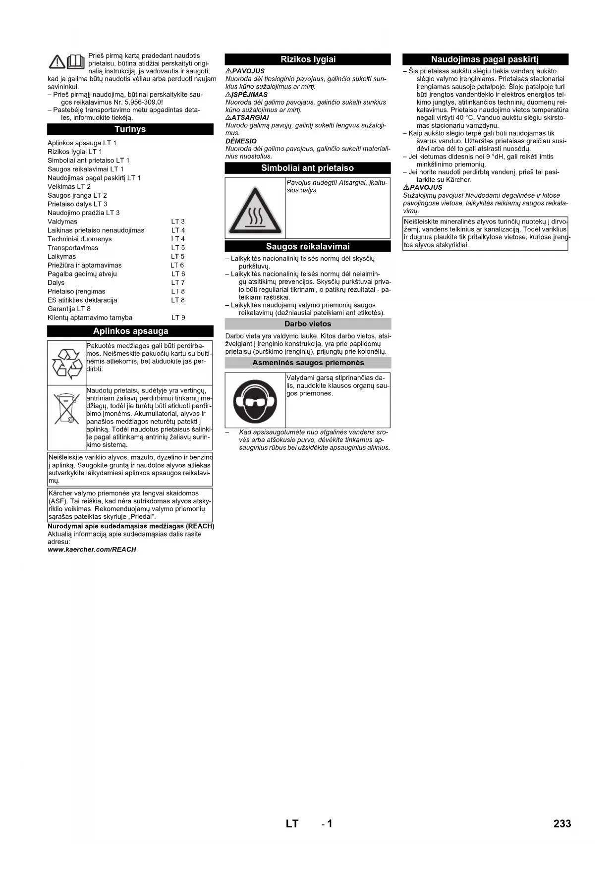 Kontroliniai indikatoriai Naudojimo pradžia Valdymas Saugos reikalavimai 235LT- 4 PAVOJUS Pavojus gyvybei dėl srovės smūgio! Nenukreipkite van- dens srovės į šiuos įrenginius: – elektros prietaisus ir įrangą; – į patį įrenginį; – bet kokias dalis darbo srityje, kuriomis teka elek-tros srovė.Iš purškimo vamzdžio išsiveržianti vandens srovė suke-lia atatranką. Purškimo vamzdžio sukeliama jėga nu-kreipta į viršų. PAVOJUS – Sužalojimų pavojus! Purškimo vamzdžio atatranka gali išmušti Jus iš pusiausvyros. Galite pargriūti, o purškimo vamzdis gali imti nevaldomai judėti ir su- žeisti žmones. Parinkite stabilią vietą ir tvirtai laiky- kite purškimo pistoletą. Jokiu būdu neužblokuokite rankinio purškimo pistoleto sverto. – Jokiu būdu negalima nukreipti srovės į kitus asme- nis arba save, norint nuvalyti rūbus arba avalynę. – Išlekiančios dalys gali sužeisti. Išlekiantys daiktai ir atplaišos gali sužeisti žmones ir gyvūnus. Jokiu būdu nenukreipkite vandens srovės į trapius ir neį- tvirtintus daiktus. – Tai gali sukelti nelaimingą atsitikimą! Padangas ir vožtuvus valykite iš ne mažesnio nei 30 cm atstu- mo.