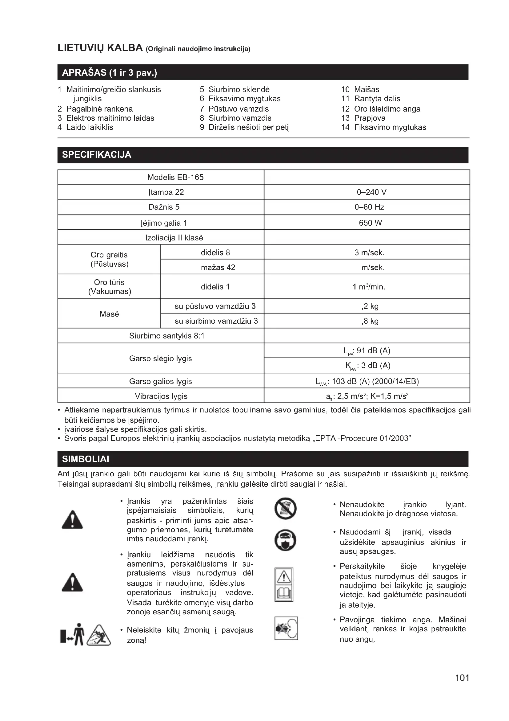 1 Rantyta dalis 12 Oro išleidimo anga 13 Prapjova 14 Fiksavimo mygtukas SPECIFIKACIJA Modelis EB-165 Įtampa 22 0–240 V Dažnis 5 0–60 Hz Įėjimo galia 1 650 W Izoliacija II klasė Oro greitis (Pūstuvas) didelis 8 3 m/sek. mažas 42 m/sek. Oro tūris (Vakuumas) didelis 1 1 m