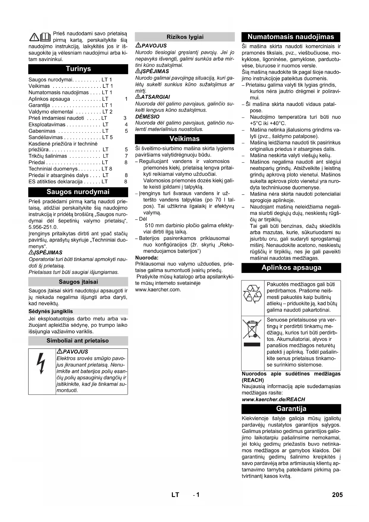 Chairman of the Board of Management Director Regulatory Affairs & Certification 204 LV- 1 Prieš naudodami savo prietaisą pirmą kartą, perskaitykite šią naudojimo instrukciją, laikykitės jos ir iš- saugokite ją vėlesniam naudojimui arba ki- tam savininkui. Prieš pradėdami pirmą kartą naudoti prie- taisą, atidžiai perskaitykite šią naudojimo instrukciją ir pridėtą brošiūrą „Saugos nuro- dymai dėl šepetinių valymo prietaisų“, 5.956-251.0. Įrenginys pritaikytas dirbti ant ypač stačių paviršių, aprašytų skyriuje „Techniniai duo- menys“. 몇 ĮSPĖJIMAS Operatoriai turi būti tinkamai apmokyti nau- doti šį prietaisą. Prietaisas turi būti saugiai išjungiamas. Saugos įtaisai skirti naudotojui apsaugoti ir jų niekada negalima išjungti arba daryti, kad neveiktų. Jei eksploatuotojas darbo metu arba va- žiuojant apleidžia sėdynę, po trumpo laiko išsijungia važiavimo variklis. PAVOJUS Nurodo tiesiogiai gręsiantį pavojų. Jei jo nepavyks išvengti, galimi sunkūs arba mir- tini kūno sužalojimai. 몇 ĮSPĖJIMAS Nurodo galimai pavojingą situaciją, kuri ga- lėtų sukelti sunkius kūno sužalojimus ar mirtį. 몇 ATSARGIAI Nuoroda dėl galimo pavojaus, galinčio su- kelti lengvus kūno sužalojimus. DĖMESIO Nuoroda dėl galimo pavojaus, galinčio nu- lemti materialinius nuostolius. Ši šveitimo-siurbimo mašina skirta lygiems paviršiams valytidrėgnuoju būdu. – Reguliuojant vandens ir valomosios priemonės kiekį, prietaisą lengva pritai- kyti reikiamai valymo užduočiai. Valomosios priemonės dozės kiekį gali- te keisti įpildami į talpyklą. – Įrenginys turi švaraus vandens ir už- teršto vandens talpyklas (po 70 l tal- pos). Tai užtikrina ilgalaikį ir efektyvų valymą. – Dėl 510 mm darbinio pločio galima efekty- viai dirbti ilgą laiką. – Baterijos pasirenkamos priklausomai nuo konfigūracijos (žr. skyrių „Reko- menduojamos baterijos“) Nuoroda: Priklausomai nuo valymo užduoties, prie- taise galima sumontuoti įvairių priedų. Prašykite mūsų katalogo arba apsilankyki- te mūsų interneto svetainėje www.kaercher.com. Ši mašina skirta naudoti komerciniais ir pramonės tikslais, pvz., viešbučiuose, mo- kyklose, ligoninėse, gamyklose, parduotu- vėse, biuruose ir nuomos versle. Šią mašiną naudokite tik pagal šioje naudo- jimo instrukcijoje pateiktus duomenis. – Prietaisu galima valyti tik lygias grindis, kurios nėra jautrio drėgmei ir poliravi- mui. – Ši mašina skirta naudoti vidaus patal- pose. – Naudojimo temperatūra turi būti nuo +5°C iki +40°C. – Mašina netinka įšalusioms grindims va- lyti (pvz., šaldymo patalpose). – Mašiną leidžiama naudoti tik pasirinkus originalius priedus ir atsargines dalis. – Mašina neskirta valyti viešųjų kelių. – Mašinos negalima naudoti ant slėgiui neatsparių grindų. Atsižvelkite į leistiną grindų apkrovą ploto vienetui. Mašinos sukelta apkrova ploto vienetui yra nuro- dyta techniniuose duomenyse. – Mašina nėra skirta naudoti potencialiai sprogioje aplinkoje. – Naudojant mašiną neleidžiama negali- ma siurbti degiųjų dujų, neskiestų rūgš- čių ar tirpiklių. Tai gali būti benzinas, dažų skiediklis arba mazutas, kurie, sūkuriuodami su įsiurbtu oru, gali sudaryti sprogstamąjį mišinį. Nenaudokite acetono, neskiestų rūgščių ir tirpiklių, nes jie gali paveikti mašinai naudotas medžiagas. Nuorodos apie sudėtines medžiagas (REACH) Naujausią informaciją apie sudedamąsias medžiagas rasite: www.kaercher.de/REACH Kiekvienoje šalyje galioja mūsų įgaliotų pardavėjų nustatytos garantijos sąlygos. Galimus prietaiso gedimus garantijos galio- jimo laikotarpiu pašalinsime nemokamai, jei tokių gedimų priežastis buvo netinka- mos medžiagos ar gamybos klaidos. Dėl garantinių gedimų šalinimo kreipkitės į savo pardavėją arba artimiausią klientų ap- tarnavimo tarnybą pateikdami pirkimą pa- tvirtinantį kasos kvitą. Turinys Saugos nurodymai. . . . . . . . . . LT 1 Veikimas . . . . . . . . . . . . . . . . . LT 1 Numatomasis naudojimas . . . . LT 1 Aplinkos apsauga . . . . . . . . . . LT 1 Garantija . . . . . . . . . . . . . . . . . LT 1 Valdymo elementai . . . . . . . . . LT 2 Prieš imdamiesi naudoti . . . . . LT 3 Eksploatavimas . . . . . . . . . . . . LT 4 Gabenimas . . . . . . . . . . . . . . . LT 5 Sandėliavimas . . . . . . . . . . . . . LT 5 Kasdienė priežiūra ir techninė priežiūra. . . . . . . . . . . . . . . . . . LT 5 Trikčių šalinimas . . . . . . . . . . . LT 7 Priedai . . . . . . . . . . . . . . . . . . . LT 8 Techniniai duomenys. . . . . . . . LT 8 Priedai ir atsarginės dalys . . . . LT 8 ES atitikties deklaracija . . . . . . LT 8 Saugos nurodymai Saugos įtaisai Sėdynės jungiklis Simboliai ant prietaiso PAVOJUS Elektros srovės smūgio pavo- jus įkraunant prietaisą. Nenu- imkite ant baterijos polių esan- čių polių apsauginių dangčių ir įsitikinkite, kad jie tinkamai su- montuoti. Rizikos lygiai Veikimas Numatomasis naudojimas Aplinkos apsauga Pakuotės medžiagos gali būti perdirbamos. Prašome neiš- mesti pakuotės kaip buitinių atliekų – priduokite ją, kad būtų galima naudoti pakartotinai. Senuose prietaisuose yra ver- tingų ir perdirbti tinkamų me- džiagų, kurios turi būti perdirb- tos. Akumuliatoriai, alyvos ir panašios medžiagos neturėtų patekti į aplinką. Todėl pašalin- kite senus prietaisus tinkamo- se surinkimo sistemose. Garantija 205LT- 2 1Sėdynė 2 Nešvaraus vandens talpyklos dangtis 3 Užteršto vandens dozatorius 4Vairaratis 5 Signalo jungiklis 6Priekinės / atbulinės eigos jungiklis 7 Darbo spartos reguliatorius 8 Raktinis jungiklis 9 Ekranas 10 Siurbimo sijos svirtis 11 Vandens kiekio reguliavimo rankenėlė 12 Akceleratoriaus pedalas 13 Šepečių keitimo pedalas 14 Diskinis šepetys 15 Valymo galvutė 16 Švaraus vandens pripildymo lygio indi- katorius 17 Siurbimo sija * 18 Nešvaraus vandens talpykla 19 N