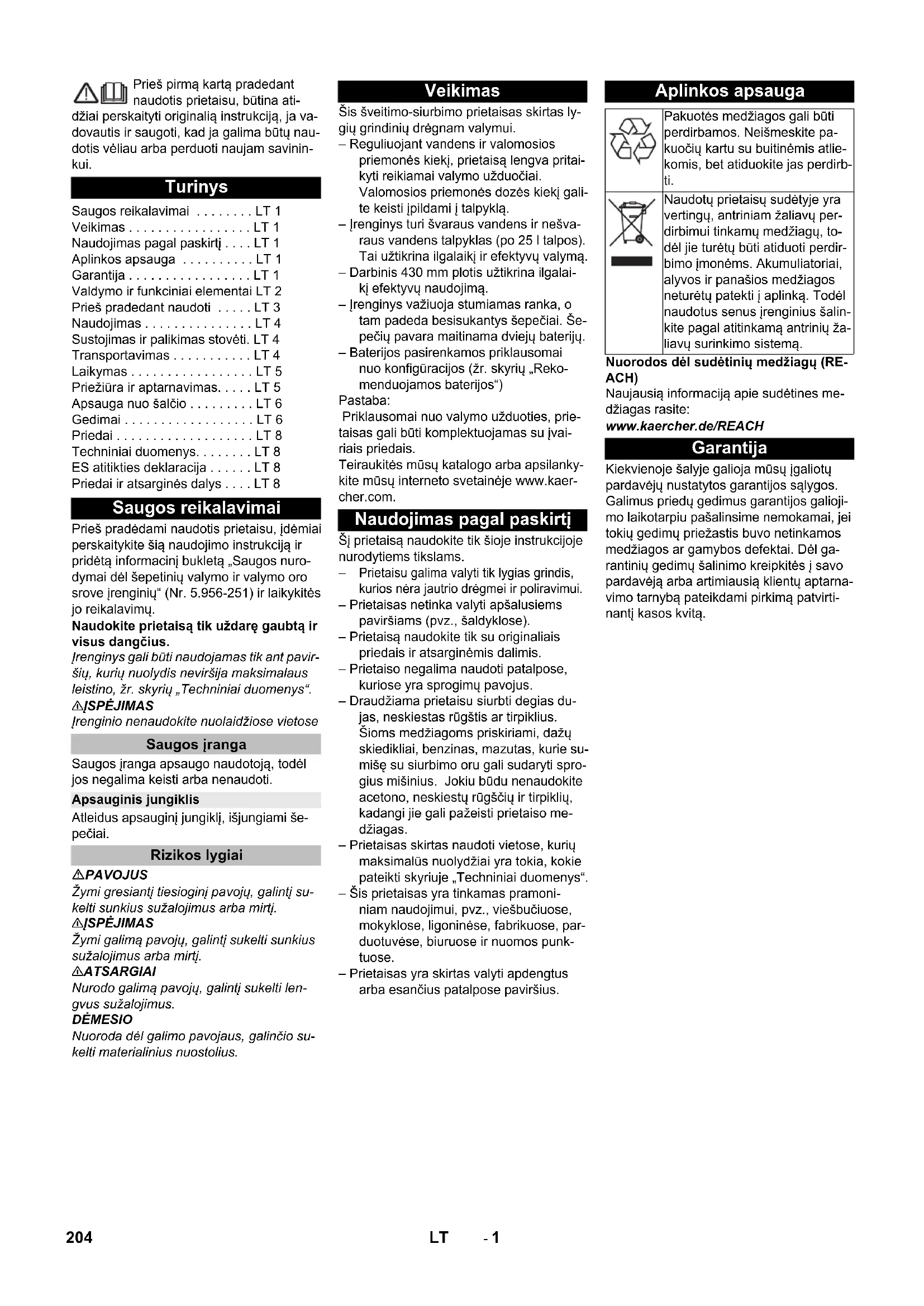 Piederumi un rezerves daļas Chairman of the Board of Management Director Regulatory Affairs & Certification 203LV- 1 Prieš pirmą kartą pradedant naudotis prietaisu, būtina ati- džiai perskaityti originalią instrukciją, ja va- dovautis ir saugoti, kad ja galima būtų nau- dotis vėliau arba perduoti naujam savinin- kui. Prieš pradėdami naudotis prietaisu, įdėmiai perskaitykite šią naudojimo instrukciją ir pridėtą informacinį bukletą „Saugos nuro- dymai dėl šepetinių valymo ir valymo oro srove įrenginių“ (Nr. 5.956-251) ir laikykitės jo reikalavimų. Naudokite prietaisą tik uždarę gaubtą ir visus dangčius. Įrenginys gali būti naudojamas tik ant pavir- šių, kurių nuolydis neviršija maksimalaus leistino, žr. skyrių „Techniniai duomenys“. 몇 ĮSPĖJIMAS Įrenginio nenaudokite nuolaidžiose vietose Saugos įranga apsaugo naudotoją, todėl jos negalima keisti arba nenaudoti. Atleidus apsauginį jungiklį, išjungiami še- pečiai. PAVOJUS Žymi gresiantį tiesioginį pavojų, galintį su- kelti sunkius sužalojimus arba mirtį. 몇 ĮSPĖJIMAS Žymi galimą pavojų, galintį sukelti sunkius sužalojimus arba mirtį. 몇 ATSARGIAI Nurodo galimą pavojų, galintį sukelti len- gvus sužalojimus. DĖMESIO Nuoroda dėl galimo pavojaus, galinčio su- kelti materialinius nuostolius. Šis šveitimo-siurbimo prietaisas skirtas ly- gių grindinių drėgnam valymui. – Reguliuojant vandens ir valomosios priemonės kiekį, prietaisą lengva pritai- kyti reikiamai valymo užduočiai. Valomosios priemonės dozės kiekį gali- te keisti įpildami į talpyklą. – Įrenginys turi švaraus vandens ir nešva- raus vandens talpyklas (po 25 l talpos). Tai užtikrina ilgalaikį ir efektyvų valymą. – Darbinis 430 mm plotis užtikrina ilgalai- kį efektyvų naudojimą. – Įrenginys važiuoja stumiamas ranka, o tam padeda besisukantys šepečiai. Še- pečių pavara maitinama dviejų baterijų. – Baterijos pasirenkamos priklausomai nuo konfigūracijos (žr. skyrių „Reko- menduojamos baterijos“) Pastaba: Priklausomai nuo valymo užduoties, prie- taisas gali būti komplektuojamas su įvai- riais priedais. Teiraukitės mūsų katalogo arba apsilanky- kite mūsų interneto svetainėje www.kaer- cher.com. Šį prietaisą naudokite tik šioje instrukcijoje nurodytiems tikslams.