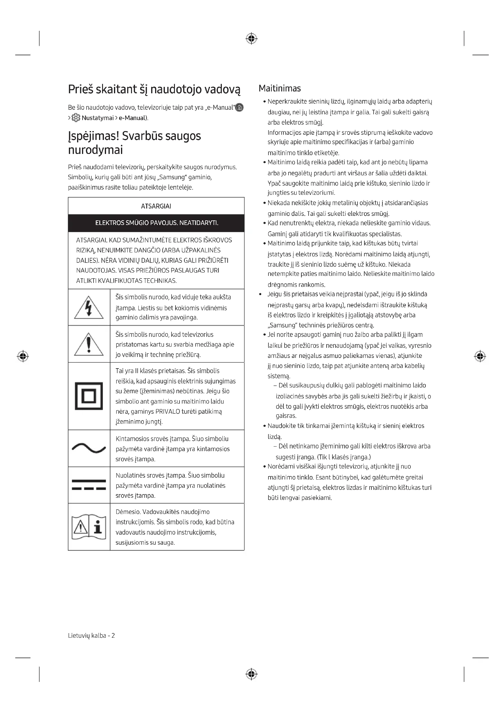 - Paveikslėliai ir iliustracijos šioje naudotojo instrukcijoje pateikiami tik kaip pavyzdžiai ir gali skirtis nuo tikrosios gaminio išvaizdos. Gaminio konstrukcija ir techniniai parametrai gali būti keičiami iš anksto apie tai neįspėjus. Jeigu gaminio taisymą atliko neįgaliotas paslaugų teikėjas, gaminys buvo taisomas savarankiškai arba neprofesionaliai, „Samsung“ neprisiima atsakomybės už bet kokius gaminio gedimus, pažeidimus ar kitus gaminio saugos pažeidimus, atsiradusius dėl bet kokio bandymo taisyti gaminį, kai yra atidžiai nesilaikoma taisymo ir priežiūros instrukcijų. Garantija nėra taikoma jokiems gaminio gedimams, atsiradusiems dėl bet kurio asmens, jei tai ne „Samsung“ sertifikuotas paslaugų teikėjas, bet kokio bandymo taisyti gaminį. Apsilankykite samsung.com/pagalba ir gaukite daugiau informacijos apie išorinį maitinimo adapterį ir nuotolinio valdymo pultą, susijusius su ES Ekologinio projektavimo direktyva - ekologinio projektavimo reikalavimais Lietuvių kalba - 8Kaip tinkamai utilizuoti šį gaminį (elektros & ir elektroninės įrangos atliekas)? (Taikoma šalyse, kuriose įdiegtos atskiros surinkimo sistemos.) Šis ant gaminio, priedų ar literatūroje pateikiamas žymuo nurodo, kad pasibaigus gaminio ir elektroninių jo priedų (pvz., kroviklio, ausinių, USB laido) tinkamumo naudoti laikui nederėtų jų išmesti su kitomis buitinėmis atliekomis. Siekdami išvengti dėl nekontroliuojamo atliekų šalinimo galimos žalos aplinkai arba žmonių sveikatai ir skatindami antrinių žaliavų panaudojimą aplinkai tausoti, atskirkite juos nuo kitų rūšių atliekų ir atiduokite perdirbti. Informacijos, kur ir kaip pristatyti šį gaminį, kad jis, tausojant aplinką, būtų perdirbtas, buitiniai vartotojai turėtų kreiptis į parduotuvę, kurioje jį įsigijo, arba į vietos valdžios įstaigą. Komerciniai naudotojai turėtų kreiptis į savo tiekėją ir peržiūrėti bendrąsias pirkimo sutarties sąlygas. Šio gaminio ir elektroninių jo priedų negalima dėti su išmestomis šalinti komercinėmis atliekomis. Kaip tinkamai utilizuoti šio gaminio baterijas (Taikoma šalyse, kuriose įdiegtos atskiros surinkimo sistemos.) Šis žymuo, pateikiamas ant baterijos, instrukcijoje arba ant pakuotės, nurodo, kad pasibaigus baterijų tinkamumo naudoti laikui nederėtų jų išmesti su kitomis buitinėmis atliekomis. Jei pažymėta, cheminių medžiagų simboliai Hg, Cd ar Pb reiškia, kad baterijoje esantis gyvsidabrio, kadmio ar švino kiekis viršija lygį, nurodytą EB direktyvoje 2006/66. Jei baterija pašalinama netinkamai, šios medžiagos gali pakenkti žmonių sveikatai ar aplinkai. Siekdami apsaugoti gamtinius išteklius ir skatinti pakartotinį medžiagų panaudojimą, atskirkite maitinimo elementus nuo kitų rūšių atliekų ir atiduokite juos perdirbti į vietinį nemokamo maitinimo elementų surinkimo punktą. Lietuvių kalba - 9 Lietuvių kalbaFør du leser denne brukerhåndboken Denne TV-en kommer med denne brukerhåndboken og en innebygd e-håndbok ( > Innstillinger > e-Manual). Advarsel! Viktige sikkerhetsinstruksjoner Les sikkerhetsinstruksjonene før du bruker TV-en. Se tabellen nedenfor for en forklaring på symboler som kan finnes på Samsung-produktet. FORSIKTIG FARE FOR ELEKTRISK STØT. MÅ IKKE ÅPNES.