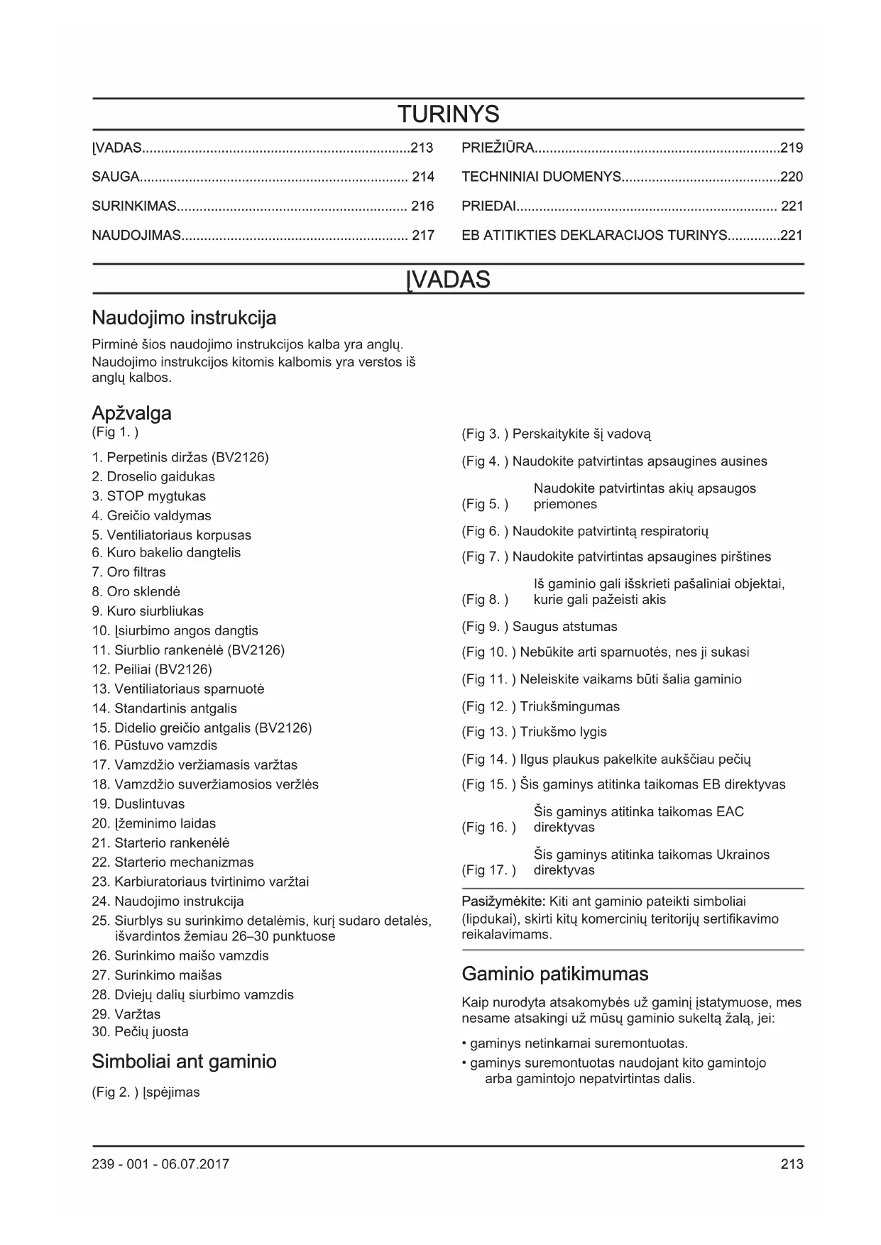 Simboliai ant gaminio (Fig 2. ) Įspėjimas (Fig 3. ) Perskaitykite šį vadovą (Fig 4. ) Naudokite patvirtintas apsaugines ausines (Fig 5. ) Naudokite patvirtintas akių apsaugos priemones (Fig 6. ) Naudokite patvirtintą respiratorių (Fig 7. ) Naudokite patvirtintas apsaugines pirštines (Fig 8. ) Iš gaminio gali išskrieti pašaliniai objektai, kurie gali pažeisti akis (Fig 9. ) Saugus atstumas (Fig 10. ) Nebūkite arti sparnuotės, nes ji sukasi (Fig 11. ) Neleiskite vaikams būti šalia gaminio (Fig 12. ) Triukšmingumas (Fig 13. ) Triukšmo lygis (Fig 14. ) Ilgus plaukus pakelkite aukščiau pečių (Fig 15. ) Šis gaminys atitinka taikomas EB direktyvas (Fig 16. ) Šis gaminys atitinka taikomas EAC direktyvas (Fig 17. ) Šis gaminys atitinka taikomas Ukrainos direktyvas Pasižymėkite: Kiti ant gaminio pateikti simboliai (lipdukai), skirti kitų komercinių teritorijų sertifikavimo reikalavimams. Gaminio patikimumas Kaip nurodyta atsakomybės už gaminį įstatymuose, mes nesame atsakingi už mūsų gaminio sukeltą žalą, jei: