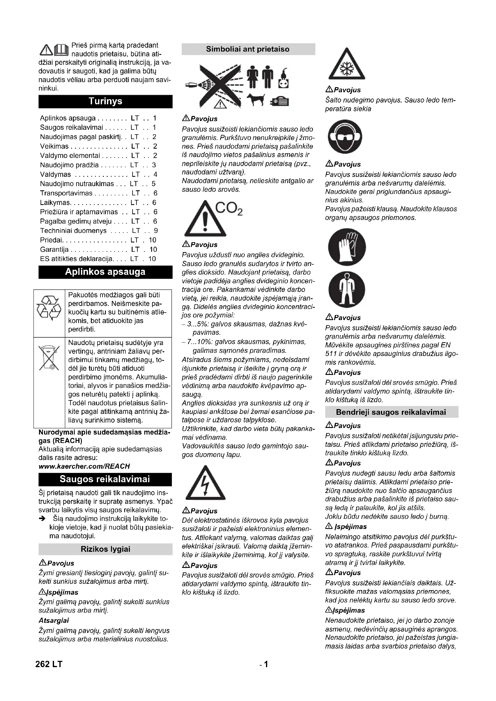 • sausas ir neužterštas alyva, o prie kompresoriaus turi būti prijungtas aušintuvas ir atskyriklis Suslėgto oro poreikis Triukšmo lygis Triukšmo lygis 270 LT- 10 Gerai priglundantys, nerasojantys apsaugi- niai akiniai, dalys-Nr.: 6.321-208.0 Nuo šalčio saugančios pirštinės su slydimą mažinančiu profiliu, III kategorija pagal EN 511, dalys-Nr.: 6.321-210.0 Klausos organų apsauga su galvos lanke- liu, dalys-Nr.: 6.321-207.0 Apvalusis srovės antgalis, trumpas Dalys-Nr.: 4.321-236.0 Apvalusis srovės antgalis, ilgas Dalys-Nr.: 4.321-234.0 Plokščiasis srovės antgalis, trumpas Dalys-Nr.: 4.321-237.0 Plokščiasis srovės antgalis, ilgas, yra pa- kuotėje Dalys-Nr.: 4.321-235.0 Apvalusis srovės antgalis, lenktas Dalys-Nr.: 4.321-249.0 Plokščiasis srovės antgalis, lenktas Dalys-Nr.: 4.321-250.0 Kodavimo įrenginys Dalys-Nr.: 4.110-015.0 Antgalių ilgintuvas, 300 mm ilgio Dalys-Nr.: 5.760-001.0 Rankena Dalys-Nr.: 4.321-248.0 Darbinis apšvietimas Dalys-Nr.: 2.815-421.0 Kiekvienoje šalyje galioja mūsų įgaliotų pardavėjų nustatytos garantijos sąlygos. Galimus prietaiso gedimus garantijos galio- jimo laikotarpiu pašalinsime nemokamai, jei tokių gedimų priežastis buvo netinka- mos medžiagos ar gamybos defektai. Dėl garantinių gedimų šalinimo kreipkitės į savo pardavėją arba artimiausią klientų ap- tarnavimo tarnybą pateikdami pirkimą pa- tvirtinantį kasos kvitą. Šiuo pareiškiame, kad toliau aprašyto apa- rato brėžiniai ir konstrukcija bei mūsų į rin- ką išleistas modelis atitinka pagrindinius ES direktyvų saugumo ir sveikatos apsau- gos reikalavimus. Jei mašinos modelis kei- čiamas su mumis nepasitarus, ši deklaracija nebegalioja. Pasirašantys asmenys veikia pagal ben- drovės vadovų įgaliojimus. Dokumentacijos tvarkytojas: S. Reiser Alfred Kärcher SE & Co. KG Alfred-Kärcher-Straße 28-40 71364 Winnenden (Germany) Tel.: +49 7195 14-0 Fax: +49 7195 14-2212 Winnenden, 2021/02/01 Priedai Apsauginiai užtvarai Purškiamasis įrenginys Garantija ES atitikties deklaracija Gaminys: Sauso ledo purkštuvas Tipas: 1.574-xxx Specialios ES direktyvos: 2011/65/EU 2006/42/EB (+2009/127/EB) 2014/30/ES 2009/125/EG + 2009/1781 Taikomi darnieji standartai: EN 55014–1: 2017 + A11: 2020 EN 55014–2: 2015 EN 60204–1 EN 61000–3–2: 2014 EN 61000–3–3: 2013 EN IEC 63000: 2018 EN 62233: 2008 Taikomi nacionaliniai standartai: GS-STE-13 (remiantis) Chairman of the Board of Management Director Regulatory Affairs & Certification 271LT- 1 Перед першим застосуванням вашого пристрою прочитайте цю оригінальну інструкцію з експлуатації, після цього дійте відповідно неї та збережіть її для подальшого користування або для наступного власника. Інструкції із застосування компонентів (REACH) Актуальні відомості про компоненти наведені на веб-вузлі за адресою: www.kaercher.com/REACH Прилад повинен керуватися тільки людьми, які ознайомились і зрозуміли цей посібник користувача. Особливо потрібно бути уважними до всіх вказівок техніки безпеки. Цей посібник користувача потрібно зберігати так, щоб він постійно був поряд з користувачем.