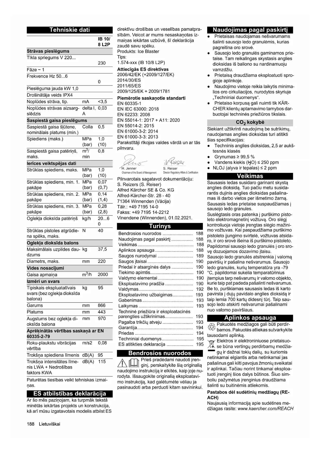 kydami platų varžto jungės šešiakampį. Įveržimo momentas: 80 Nm. Garantija Kiekvienoje šalyje galioja mūsų įgaliotų pardavėjų nustatytos garantijos sąlygos. Galimus įrenginio gedimus garantijos galio- jimo laikotarpiu pašalinsime nemokamai, jei tokių gedimų priežastis buvo netinkamos medžiagos ar gamybos defektai. Dėl ga- rantinių gedimų šalinimo kreipkitės į savo pardavėją arba artimiausią klientų aptarna- vimo tarnybą pateikdami pirkimą patvirti- nantį kasos kvitą. (Adresą rasite kitoje pusėje) Priedas ABS liekamojo slėgio vožtuvas Užsakymo numeris 2.574-006.0 Būtina, kai naudojami anglies dioksido bali- onai su liekamojo slėgio vožtuvu. Triktis Šalinimas Šviečia purškimo pistoleto trikčių rodmuo Prieš įjungdami nespauskite purškimo pistoleto įjungimo svirtelės. Pašalinkite purškimo pistoleto įjungimo svirtelės fiksatorių. Mirksi purškimo pistoleto trikčių rodmuo Patikrinkite, ar purškimo pistoleto valdymo linija prijungta prie prietaiso. Patikrinkite, ar nepažeista purškimo žarnos valdymo linija. Šviečia suslėgtojo oro tieki- mo trikčių rodmuo Padidinkite oro slėgį. Mirksi suslėgtojo oro tiekimo trikčių rodmuo Patikrinkite, ar neužsikimšo išmetimo žarna. Anglies dioksido balionas yra per karštas, todėl turi per aukštą slėgį. Prietaisą su anglies dioksido balionu pastatykite vėsesnėje vietoje arba apsaugokite nuo tiesioginių saulės spindulių. Trikčių rodytuvas Granulių generavimo įtaisas šviečia Leiskite prietaisui atitirpti. Patikrinkite ir, jei reikia, pakeiskite anglies dioksido filtrą . Po to atkurkite pradinius nustatymus. Jei triktis kartojasi, pakeiskite anglies dioksido balioną. Šviečia granulių dozavimo trikčių rodmuo Išjunkite ir vėl įjunkite įrenginį. Jei trikties rodytuvas nesiliauja švietęs, kreipkitės į klientų aptarnavimo tarnybą. Mirksi granulių dozavimo trik- čių rodmuo Dozavimo varikliui leiskite atvėsti. Prietaisą pastatykite taip, kad oras į jį galėtų tekėti iš apačios. Jei reikia, susisiekite su klientų aptarnavimo tarnyba. Nešviečia maitinimo šaltinio kontrolinė lemputė Įkiškite tinklo kištuką į kištukinę dėžutę. Patikrinkite užsakovo įrengtą maitinimą šaltinį. Suslėgtojo oro kontrolinė lemputė nešviečia Prie prietaiso prijunkite suslėgtojo oro žarną. Atidarykite vietoje įrengtoje suslėgtojo oro tiekimo sistemoje esantį uždarymo vožtuvą. Prietaisas neveikia Patikrinkite kontrolines lemputes ir trikčių indikatorius. Atkurkite pradinius nustatymus. Mažas valymo efektyvumas Programos jungiklį pasukite į aukštesnį lygį. Padidinkite srovės slėgį. Patikrinkite anglies dioksido baliono pripildymo lygį. Nenaudokite pakaitinto anglies dioksido baliono. Saugokite anglies dioksido balioną nuo šilumos spindulių. Jei anglies dioksido temperatūra yra aukštesnė nei 31 °C, granulių gamybos efektyvu- mas smarkiai sumažėja. Leiskite purškimo žarnai ir purškimo pistoletui atitirpti, kad pašalintumėte visus užsikimšimus. Tada padidinkite srovės slėgį. Per maža granulių dozė Programos jungiklį pasukite į aukštesnį lygį. Pakeiskite anglies dioksido filtrą tarp anglies dioksido baliono ir prietaiso. Pasikartojantys sauso ledo srauto tiekimo pertr ūkiai Programos jungiklį pasukite į žemesnį lygį arba padidinkite srauto slėgį. Jeigu purškimo antgalis užblokuotas: a Nedelsdami uždarykite anglies dioksido talpyklą. b Palaukite bent 30 minučių, kol prietaisas atauš. c Padidinkite srovės slėgį. dNorėdami pašalinti granulių likučius, įjunkite prietaisą pirmiau uždarę anglies dioksido talpyklą.Українська 195 Techniniai duomenys Gamintojas pasilieka teisę atlikti techninius pakeitimus. ES atitikties deklaracija Pareiškiame, kad toliau aprašyto aparato brėžiniai ir konstrukcija bei mūsų į rinką iš- leistas modelis atitinka pagrindinius ES di- rektyvų saugumo ir sveikatos apsaugos reikalavimus. Jeigu įrenginiui atliekamas su mumis nesuderintas keitimas, ši deklaraci- ja netenka savo galios. Gaminys: Valymo aparatas sausojo ledo granulėmis Tipas: 1.574-xxx (IB 10/8 L2P) Atitinkamos ES direktyvos 2006/42/EB (+2009/127/EB) 2014/30/ES 2011/65/ES 2009/125/EG + 2009/1781 Taikomi darnieji standartai EN 60335-1 EN IEC 63000: 2018 EN 62233: 2008 EN 55014-1: 2017 + A11: 2020 EN 55014-2: 2015 EN 61000-3-2: 2014 EN 61000-3-3: 2013 Pasirašantys asmenys veikia pagal ben- drovės vadovų įgaliojimus. Dokumentacijos tvarkytojas: S. Reiser Alfred Kärcher SE & Co. KG Alfred-Kärcher-Str. 28 - 40 71364 Vinendenas, Vokietija Tel.: +49 7195 14-0 Faks.: +49 7195 14-2212 Vinendenas, 2021 m. vasario 1 d.