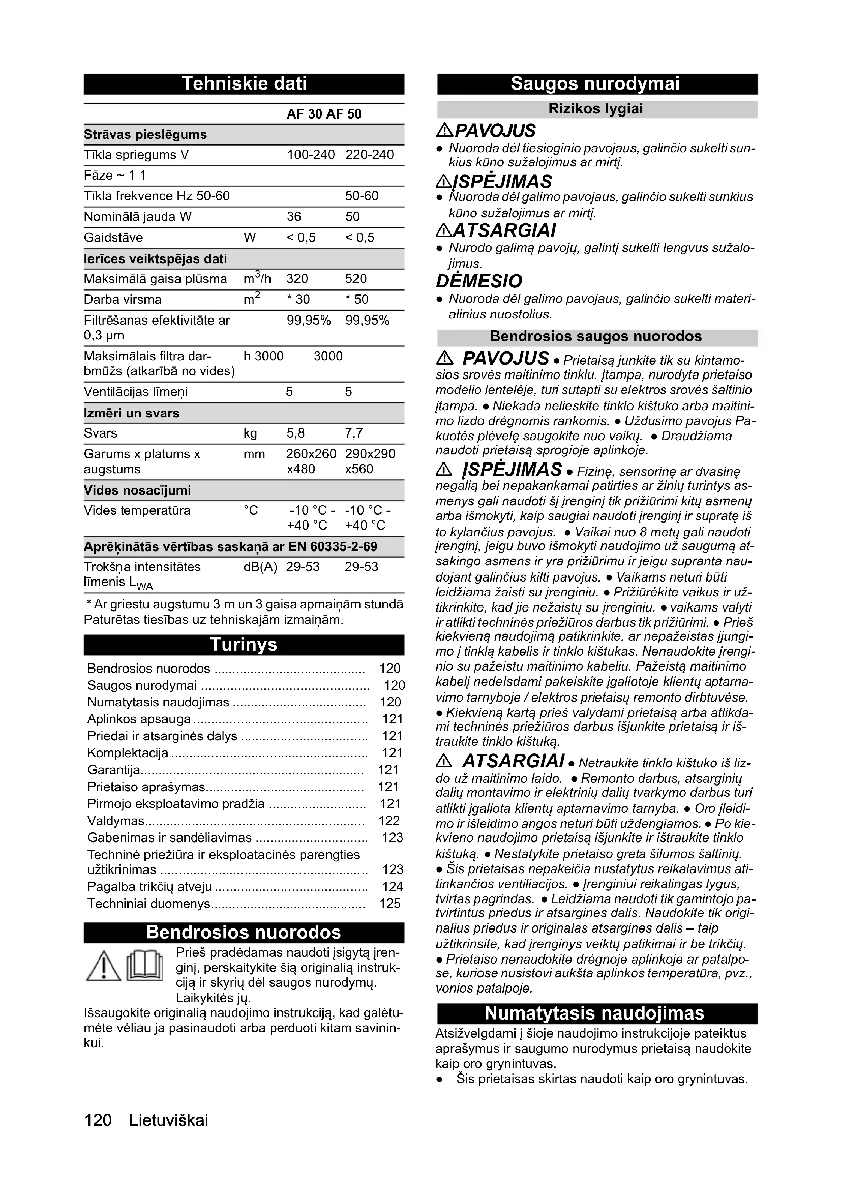 - Ar griestu augstumu 3 m un 3 gaisa apmaiņām stundā Paturētas tiesības uz tehniskajām izmaiņām. Turinys Bendrosios nuorodos Prieš pradėdamas naudoti įsigytą įren- ginį, perskaitykite šią originalią instruk- ciją ir skyrių dėl saugos nurodymų. Laikykitės jų. Išsaugokite originalią naudojimo instrukciją, kad galėtu- mėte vėliau ja pasinaudoti arba perduoti kitam savinin- kui. Saugos nurodymai Rizikos lygiai PAVOJUS ● Nuoroda dėl tiesioginio pavojaus, galinčio sukelti sun- kius kūno sužalojimus ar mirtį. 몇 ĮSPĖJIMAS ● Nuoroda dėl galimo pavojaus, galinčio sukelti sunkius kūno sužalojimus ar mirtį. 몇 ATSARGIAI ● Nurodo galimą pavojų, galintį sukelti lengvus sužalo- jimus. DĖMESIO ● Nuoroda dėl galimo pavojaus, galinčio sukelti materi- alinius nuostolius. Bendrosios saugos nuorodos PAVOJUS ● Prietaisą junkite tik su kintamo- sios srovės maitinimo tinklu. Įtampa, nurodyta prietaiso modelio lentelėje, turi sutapti su elektros srovės šaltinio įtampa. ● Niekada nelieskite tinklo kištuko arba maitini- mo lizdo drėgnomis rankomis. ● Uždusimo pavojus Pa- kuotės plėvelę saugokite nuo vaikų. ● Draudžiama naudoti prietaisą sprogioje aplinkoje. 몇 ĮSPĖJIMAS ● Fizinę, sensorinę ar dvasinę negalią bei nepakankamai patirties ar žinių turintys as- menys gali naudoti šį įrenginį tik prižiūrimi kitų asmenų arba išmokyti, kaip saugiai naudoti įrenginį ir supratę iš to kylančius pavojus. ● Vaikai nuo 8 metų gali naudoti įrenginį, jeigu buvo išmokyti naudojimo už saugumą at- sakingo asmens ir yra prižiūrimu ir jeigu supranta nau- dojant galinčius kilti pavojus. ● Vaikams neturi būti leidžiama žaisti su įrenginiu. ● Prižiūrėkite vaikus ir už- tikrinkite, kad jie nežaistų su įrenginiu. ● vaikams valyti ir atlikti techninės priežiūros darbus tik prižiūrimi. ● Prieš kiekvieną naudojimą patikrinkite, ar nepažeistas įjungi- mo į tinklą kabelis ir tinklo kištukas. Nenaudokite įrengi- nio su pažeistu maitinimo kabeliu. Pažeistą ma itinimo kabelį nede lsdami pakeiskite įgaliotoje klientų aptarna- vimo tarnyboje / elektros prietaisų remonto dirbtuvėse. ● Kiekvieną kartą prieš valydami prietaisą arba atlikda- mi techninės priežiūros darbus išjunkite prietaisą ir iš- traukite tinklo kištuką. 몇 ATSARGIAI ● Netraukite tinklo kištuko iš liz- do už maitinimo laido. ● Remonto darbus, atsarginių dalių montavimo ir elektrinių dalių tvarkymo darbus turi atlikti įgaliota klientų aptarnavimo tarnyba. ● Oro įleidi- mo ir išleidimo angos neturi būti uždengiamos. ● Po kie- kvieno naudojimo prietaisą išjunkite ir ištraukite tinklo kištuką. ● Nestatykite prietaiso greta šilumos šaltinių. ● Šis prietaisas nepakeičia nustatytus reikalavimus ati- tinkančios ventiliacijos. ● Įrenginiui reikalingas lygus, tvirtas pagrindas. ● Leidžiama naudoti tik gamintojo pa- tvirtintus priedus ir atsargines dalis. Naudokite tik origi- nalius priedus ir originalas atsargines dalis – taip užtikrinsite, kad įrenginys veiktų patikimai ir be trikčių. ● Prietaiso nenaudokite drėgnoje aplinkoje ar patalpo- se, kuriose nusistovi aukšta aplinkos temperatūra, pvz., vonios patalpoje. Numatytasis naudojimas Atsižvelgdami į šioje naudojimo instrukcijoje pateiktus aprašymus ir saugumo nurodymus prietaisą naudokite kaip oro grynintuvas. ● Šis prietaisas skirtas naudoti kaip oro grynintuvas. AF 30 AF 50 Strāvas pieslēgums Tīkla spriegums V 100-240 220-240 Fāze ~ 1 1 Tīkla frekvence Hz 50-60 50-60 Nominālā jauda W