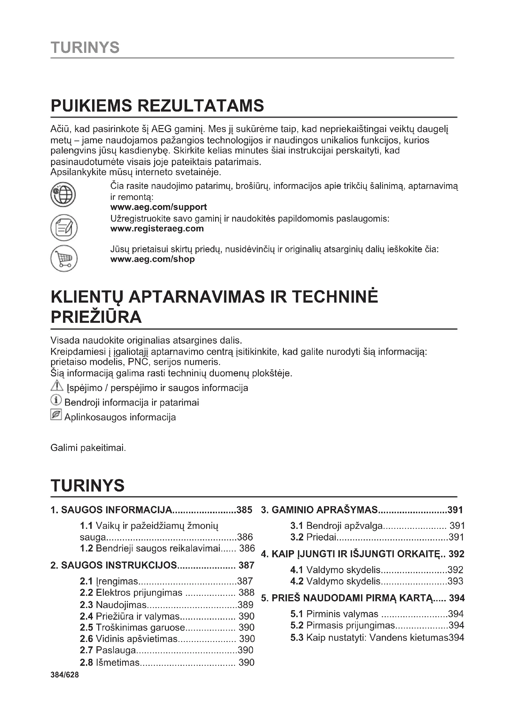 Ačiū, kad pasirinkote šį AEG gaminį. Mes jį sukūrėme taip, kad nepriekaištingai veiktų daugelį metų – jame naudojamos pažangios technologijos ir naudingos unikalios funkcijos, kurios palengvins jūsų kasdienybę. Skirkite kelias minutes šiai instrukcijai perskaityti, kad pasinaudotumėte visais joje pateiktais patarimais. Apsilankykite mūsų interneto svetainėje. Čia rasite naudojimo patarimų, brošiūrų, informacijos apie trikčių šalinimą, aptarnavimą ir remontą: www.aeg.com/support Užregistruokite savo gaminį ir naudokitės papildomomis paslaugomis: www.registeraeg.com Jūsų prietaisui skirtų priedų, nusidėvinčių ir originalių atsarginių dalių ieškokite čia: www.aeg.com/shop