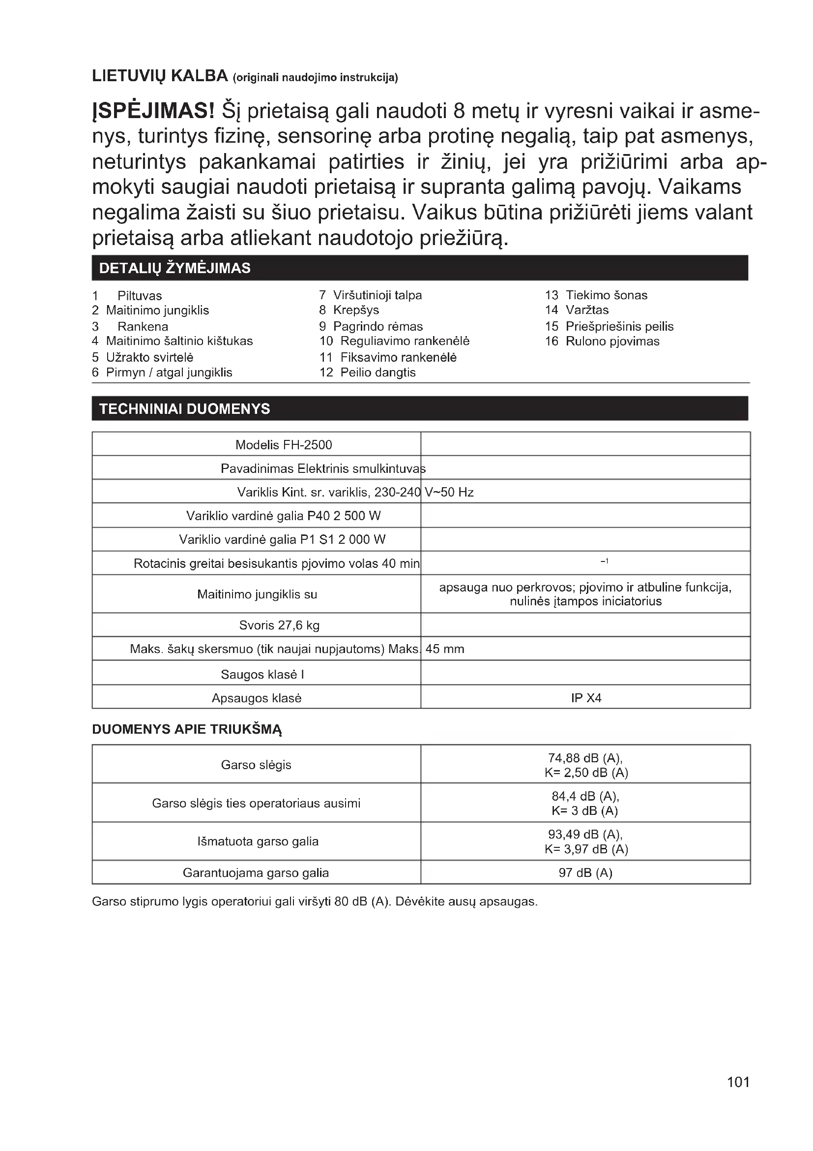 1 Piltuvas 2 Maitinimo jungiklis 3 Rankena 4 Maitinimo šaltinio kištukas 5 Užrakto svirtelė 6 Pirmyn / atgal jungiklis 7 Viršutinioji talpa 8 Krepšys 9 Pagrindo rėmas 10 Reguliavimo rankenėlė 11 Fiksavimo rankenėlė 12 Peilio dangtis 13 Tiekimo šonas 14 Varžtas 15 Priešpriešinis peilis 16 Rulono pjovimas TECHNINIAI DUOMENYS Modelis FH-2500 Pavadinimas Elektrinis smulkintuvas Variklis Kint. sr. variklis, 230-240 V~50 Hz Variklio vardinė galia P40 2 500 W Variklio vardinė galia P1 S1 2 000 W Rotacinis greitai besisukantis pjovimo volas 40 min