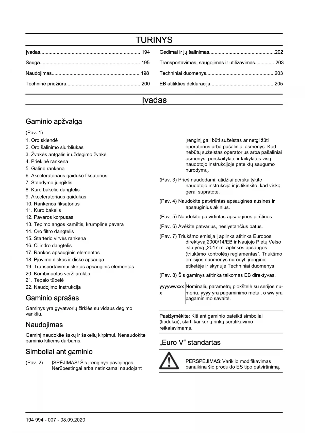 Nominalių parametrų plokštelė su serijos nu- meriu. yyyy yra pagaminimo metai, o ww yra pagaminimo savaitė. Pasižymėkite: Kiti ant gaminio pateikti simboliai (lipdukai), skirti kai kurių rinkų sertifikavimo reikalavimams. „Euro V“ standartas PERSPĖJIMAS: Variklio modifikavimas panaikina šio produkto ES tipo patvirtinimą. 194 994 - 007 - 08.09.2020Sauga Saugos ženklų reikšmės Įspėjimai, perspėjimai ir pastabos yra skirtos atkreipti dėmesį į ypač svarbias vadovo dalis. PERSPĖJIMAS: Naudojamas, kai naudotojui ar šalia esantiems asmenims kyla mirtino arba sunkaus sužeidimo pavojus arba, jei nesilaikoma vadove pateiktų nurodymų. PASTABA: Naudojamas, kai kyla pavojus sugadinti gaminį, kitas medžiagas arba padaryti žalą aplinkai, jei nesilaikoma vadove pateiktų nurodymų. Pasižymėkite: Naudojamas papildomai informacijai apie konkrečią situaciją pateikti. Bendrieji saugos nurodymai PERSPĖJIMAS: Prieš naudodami gaminį, perskaitykite toliau esančius įspėjimus.