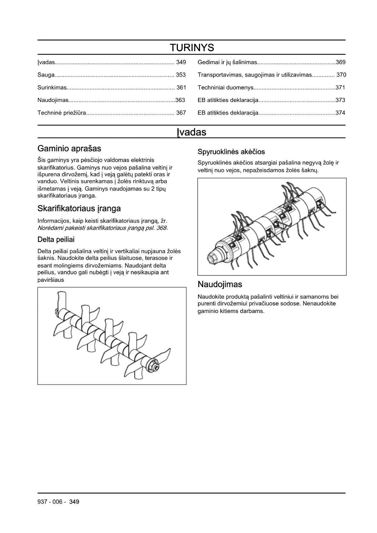 - EB atitikties deklaracija Įvadas Gaminio aprašas Šis gaminys yra pėsčiojo valdomas elektrinis skarifikatorius. Gaminys nuo vejos pašalina veltinį ir išpurena dirvožemį, kad į veją galėtų patekti oras ir vanduo. Veltinis surenkamas į žolės rinktuvą arba išmetamas į veją. Gaminys naudojamas su 2 tipų skarifikatoriaus įranga. Skarifikatoriaus įranga Informacijos, kaip keisti skarifikatoriaus įrangą, žr. Norėdami pakeisti skarifikatoriaus įrangą psl. 368 p. 374