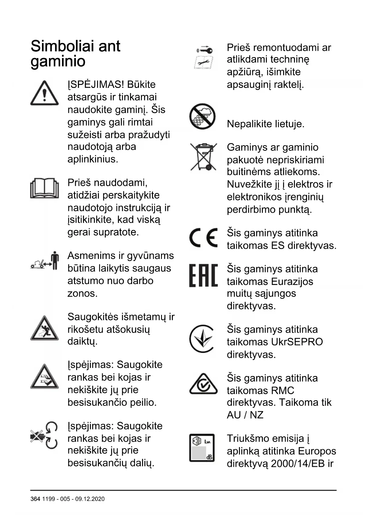 1199 - 005 - 09.12.2020 363Simboliai ant gaminio ĮSPĖJIMAS! Būkite atsargūs ir tinkamai naudokite gaminį. Šis gaminys gali rimtai sužeisti arba pražudyti naudotoją arba aplinkinius. Prieš naudodami, atidžiai perskaitykite naudotojo instrukciją ir įsitikinkite, kad viską gerai supratote. Asmenims ir gyvūnams būtina laikytis saugaus atstumo nuo darbo zonos. Saugokitės išmetamų ir rikošetu atšokusių daiktų. Įspėjimas: Saugokite rankas bei kojas ir nekiškite jų prie besisukančio peilio. Įspėjimas: Saugokite rankas bei kojas ir nekiškite jų prie besisukančių dalių. Prieš remontuodami ar atlikdami techninę apžiūrą, išimkite apsauginį raktelį. Nepalikite lietuje. Gaminys ar gaminio pakuotė nepriskiriami buitinėms atliekoms. Nuvežkite jį į elektros ir elektronikos įrenginių perdirbimo punktą. Šis gaminys atitinka taikomas ES direktyvas. Šis gaminys atitinka taikomas Eurazijos muitų sąjungos direktyvas. Šis gaminys atitinka taikomas UkrSEPRO direktyvas. Šis gaminys atitinka taikomas RMC direktyvas. Taikoma tik AU / NZ Triukšmo emisija į aplinką atitinka Europos direktyvą 2000/14/EB ir 364 1199 - 005 - 09.12.2020Naujojo Pietų Velso įstatymą „2017 m. aplinkos apsaugos (triukšmo kontrolės) reglamentas“. Triukšmo emisijos duomenys nurodyti įrenginio etiketėje ir skyriuje Techniniai duomenys. Gaminys apsaugotas nuo lašėjimo. Pradėkite procedūrą: nuspauskite ĮJUNGIMO / IŠJUNGIMO mygtuką, atlaisvinkite apsaugą nuo netyčinio paleidimo, nuspauskite variklio stab- dymo rankeną. Norėdami sustabdyti, atleiskite variklio stabdymo rankeną. Lėtai Greitai Nuskaitomas kodas Pasižymėkite: Kiti ant gaminio esantys simboliai (lipdukai) yra naudojami pagal kai kurių rinkų sertifikavimo reikalavimus. Etiketė ant gaminio Saugokite rankas bei kojas ir nekiškite jų prie besisukančių peilių. Atsakomybė už gaminį Kaip nurodyta atsakomybės už gaminį įstatymuose, mes nesame atsakingi už mūsų gaminio sukeltą žalą, jei: