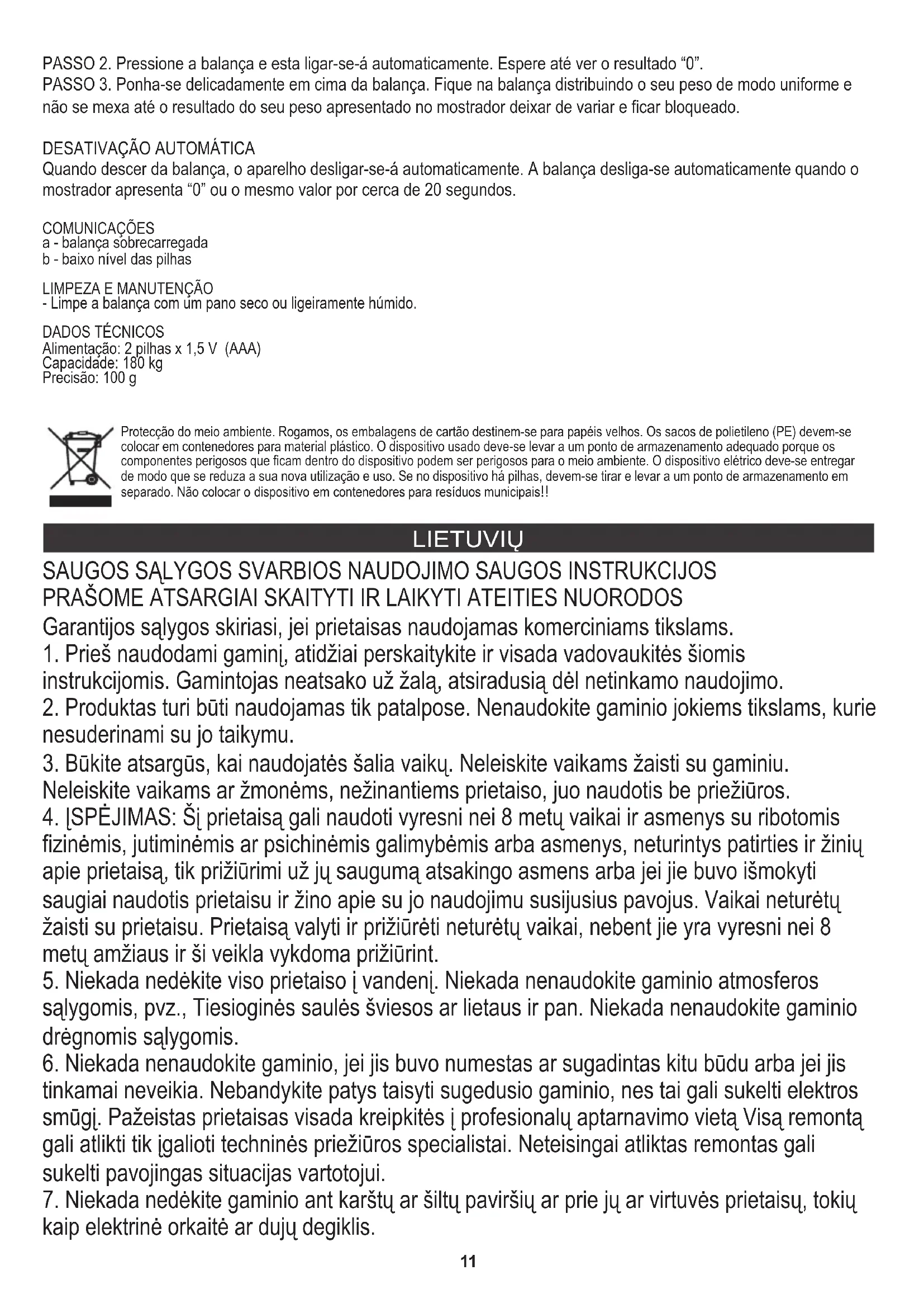 - Valykite švelniai sausu arba lengvai drėgnu skudurėliu. Apkrova: 180 kg Tikslumas: 100 g Maitinimas: 2 tipo baterija x 1,5 V (AAA) Rūpinantis aplinka. Kartono pakuotes atiduoti į makulatūrą. Polietileno (PE) maišelius mesti į plastikui skirtą konteinerį. Susidėvėjusį prietaisą atiduoti į atitinkamą atliekų surinkimo vietą, nes prietaise esančios pavojingos medžiagos gali kelti grėsmę aplinkai. Elektrinį prietaisą atiduoti tokį, kad nebūtų galima jo pakartotinai naudoti ir panaudoti. Jeigu prietaise yra baterijos, būtina jas išimti ir atskirai atiduoti į atliekų surinkimo vietą. Nemesti prietaiso į buitinių atliekų konteinerį!13 LATVIEŠU LŪDZU, RŪPĪGI IZLASIET UN UZGLABĀT TURPMĀKO ATSAUCI Garantijas nosacījumi ir atšķirīgi, ja ierīci izmanto komerciāliem mērķiem.