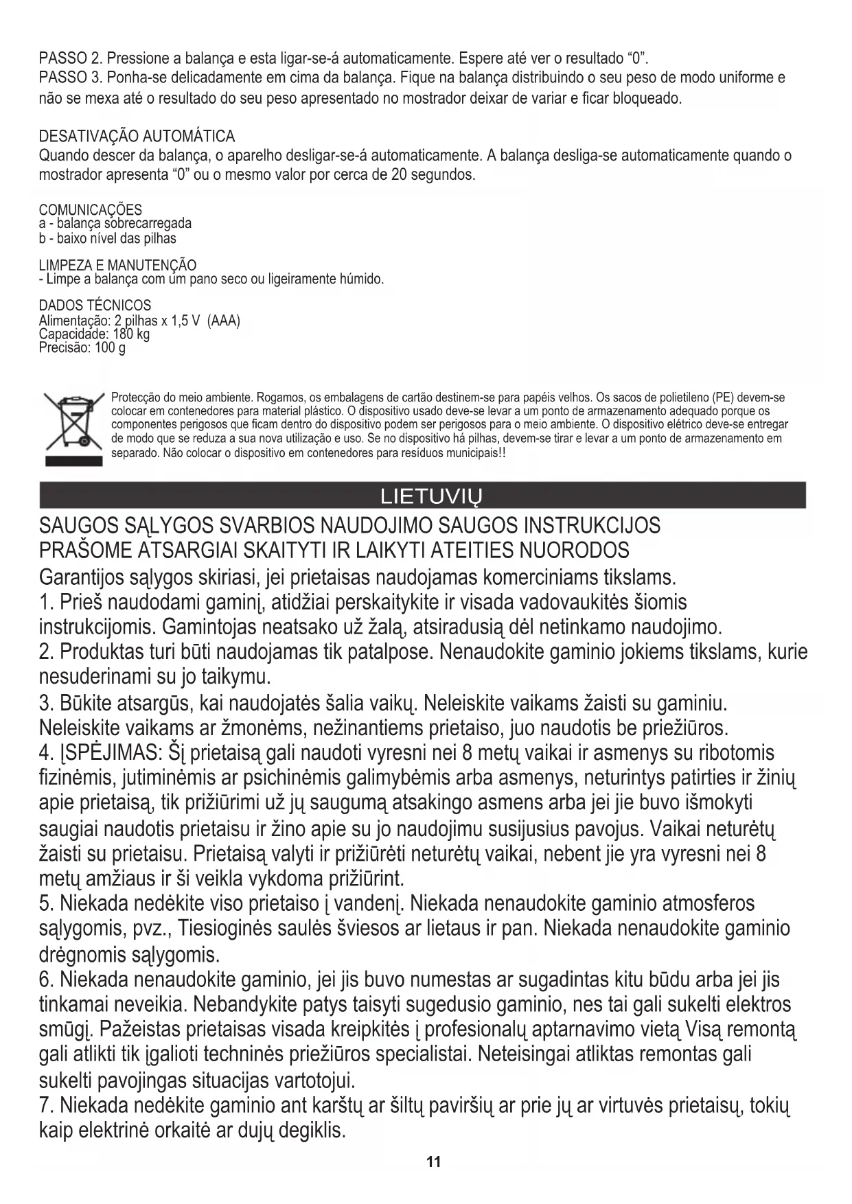 Kai nulipsite nuo svarstyklių, įrenginys automatiškai išsijungs. Svarstyklės automatiškai išsijungia, kai ekrane yra rodoma "0.0" arba tas pats svorio skaitymas per apie 20 sekundžių. Nuimkite baterijos kameros dangtį, esantį svarstyklių apačioje. Išimkite sunaudotą bateriją. Įdėkite naują, tinkamos rūšies bateriją. Uždarykite baterijos kameros dangtį. PRANEŠIMAI a - per didelė svarstyklių apkrova Maitinimas: 2 tipo baterija x 1,5 V (AAA) b - žemas baterijos prikrovimo lygis Tikslumas: 100 g - Valykite švelniai sausu arba lengvai drėgnu skudurėliu. Apkrova: 180 kg TECHNINIAI DUOMENYS