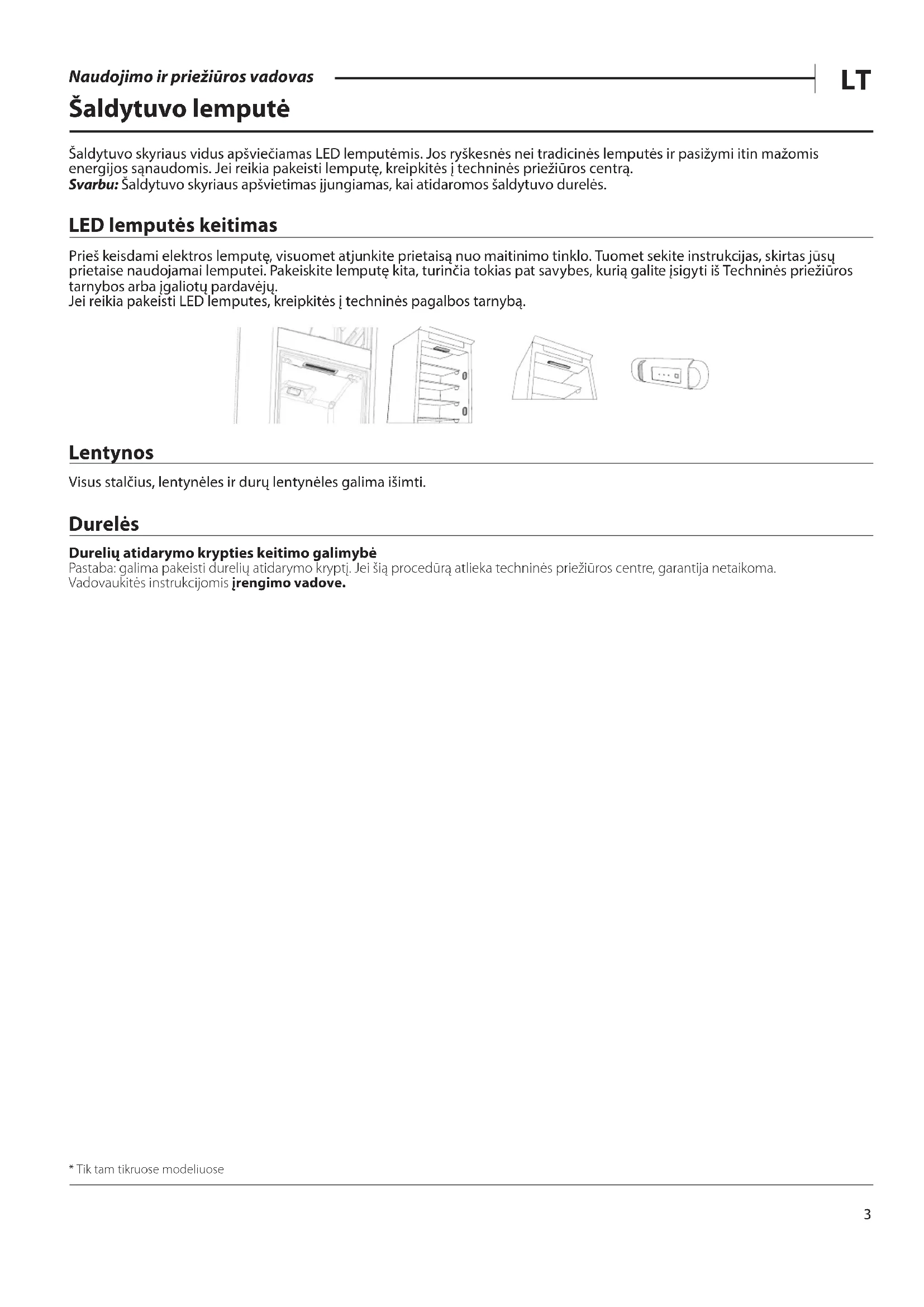 Naudojimo ir priežiūros vadovas Šaldytuvo lemputė Šaldytuvo skyriaus vidus apšviečiamas LED lemputėmis. Jos ryškesnės nei tradicinės lemputės ir pasižymi itin mažomis energijos sąnaudomis. Jei reikia pakeisti lemputę, kreipkitės į techninės priežiūros centrą. Svarbu: Šaldytuvo skyriaus apšvietimas įjungiamas, kai atidaromos šaldytuvo durelės. LED lemputės keitimas Prieš keisdami elektros lemputę, visuomet atjunkite prietaisą nuo maitinimo tinklo. Tuomet sekite instrukcijas, skirtas jūsų prietaise naudojamai lemputei. Pakeiskite lemputę kita, turinčia tokias pat savybes, kurią galite įsigyti iš Techninės priežiūros tarnybos arba įgaliotų pardavėjų. Jei reikia pakeisti LED lemputes, kreipkitės į techninės pagalbos tarnybą. Lentynos Visus stalčius, lentynėles ir durų lentynėles galima išimti. Durelės Durelių atidarymo krypties keitimo galimybė Pastaba: galima pakeisti durelių atidarymo kryptį. Jei šią procedūrą atlieka techninės priežiūros centre, garantija netaikoma. Vadovaukitės instrukcijomis įrengimo vadove.* Tik tam tikruose modeliuose4 Naudojimo ir priežiūros vadovas Kaip naudoti prietaisą Naudojimas pirmą kartą Įrengę, prieš prijungdami prietaisą prie maitinimo, palaukite bent dvi valandas. Prijunkite prietaisą prie elektros tinklo ir jis pradės veikti automatiškai. Tinkamiausios maisto laikymo temperatūros yra iš anksto nustatytos gamykloje. Įjungę prietaisą, turite palaukti 4–6 valandas, kol bus pasiekta tinkama įprastai pripildyto prietaiso laikymo temperatūra. Antibakterinį, nuo kvapų saugantį ltrą įdėkite į ventiliatorių, kaip parodyta ant ltro pakuotės (jei yra). Jei pasigirsta garsinis signalas, vadinasi, buvo suaktyvintas temperatūros signalas: paspauskite mygtuką, kad išjungtumėte garsinį signalą. Šaldytuvo skyrius ir maisto laikymas Šaldytuvo skyrius skirtas šviežiam maistui ir gėrimams laikyti. Šaldytuvo skyrius visiškai atšyla automatiškai. Nuolat pasirodantys vandens lašai vidinėje šaldytuvo skyriaus galinės sienos pusėje yra automatinio atitirpinimo požymis. Atitirpęs vanduo nukreipiamas į angą, paskui teka į talpą, iš kurios išgaruoja. Pastaba: Aplinkos temperatūra, dažnas durų atidarinėjimas ir prietaiso vieta gali turėti įtakos vidinei šių dviejų skyrių temperatūrai. Temperatūrą reguliuokite atsižvelgdami į šiuos veiksnius. Esant labai drėgnoms ir šiltoms sąlygoms, šaldytuvo skyriuose (ypač ant stiklinių lentynų) gali susidaryti kondensacija. Tokiu atveju rekomenduojama uždaryti talpyklas su skysčiais (pvz., perpildytus puodus), suvynioti maistą, turintį didelį vandens kiekį (pvz., daržoves) ir įjungti ventiliatorių, jei jis yra. Visus stalčius, lentynėles ir durų lentynėles galima išimti. Daugiasrautis oro paskirstymas Daugiasrautis oro paskirstymas padeda tolygiai paskirstyti šaltą orą skyriuje ir geriau apsaugoti maistą. Maistą galite laikyti bet kurioje prietaiso lentynėlėje. Atkreipkite dėmesį, kad nebūtų uždengtos oro tiekimo ventiliatorių angos ir oras galėtų laisvai judėti. Kaip laikyti šviežią maistą ir gėrimus Maisto produktus, kurie išskiria daug etileno dujų (obuolius, abrikosus, kriaušes, persikus, avokadus, gas, slyvas, mėlynes, melionus, pupeles) arba yra jautrūs šioms dujoms, pavyzdžiui, vaisiai, daržovės ir salotos, visada reikia laikyti atskirai arba suvynioti, kad juos išlaikytumėte kuo ilgiau; pavyzdžiui, pomidorų nelaikykite kartu su kiviais ar kopūstais. Maisto produktų nelaikykite per arti vienų kitų, kad tarp jų galėtų tinkamai cirkuliuoti oras. Maistui laikyti naudokite perdirbamo plastiko, metalo, aliuminio ir stiklo indelius bei maistinę plėvelę. Jei šaldytuve ketinate laikyti nedidelį maisto produktų kiekį, rekomenduojame naudoti lentynas virš vaisių ir daržovių stalčiaus, nes tai šalčiausia skyriaus vieta. Skysčius ir maisto produktus, kurie gali skleisti stiprius kvapus arba būti jais paveikti, laikykite uždaruose indeliuose arba uždenkite. Kad buteliai neišvirstų, galite pasinaudoti butelių laikikliu (tik tam tikruose modeliuose).