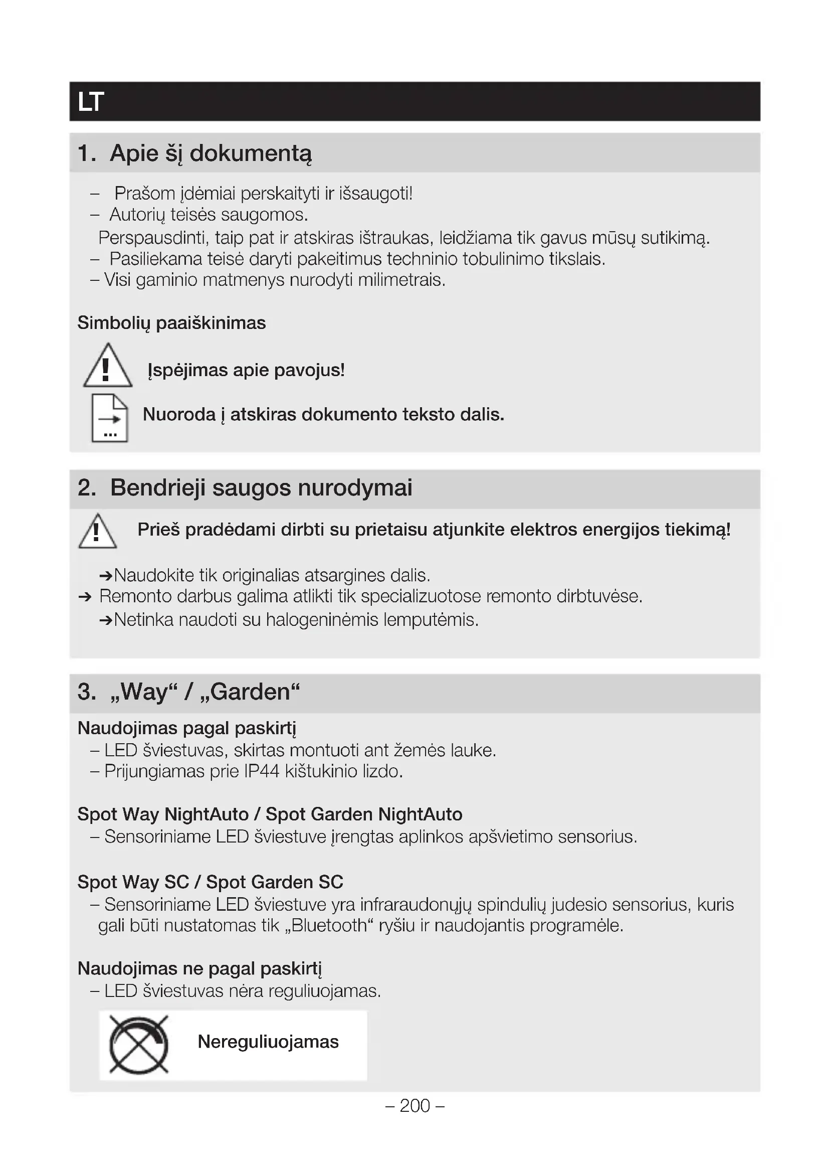 Naudojimas pagal paskirtį – LED šviestuvas, skirtas montuoti ant žemės lauke. – Prijungiamas prie IP44 kištukinio lizdo. Spot Way NightAuto/Spot Garden NightAuto – Sensoriniame LED šviestuve įrengtas aplinkos apšvietimo sensorius. Spot Way SC/Spot Garden SC – Sensoriniame LED šviestuve yra infraraudonųjų spindulių judesio sensorius, kuris gali būti nustatomas tik „Bluetooth“ ryšiu ir naudojantis programėle. Naudojimas ne pagal paskirtį – LED šviestuvas nėra reguliuojamas. Nereguliuojamas– 201 – „Spot Way“ tiekiamas komplektas (3.1 Pav.) – Šviestuvas su kolona, grindų plokštele ir jungiamuoju kabeliu su kištuku. – 3 Varžtai – 3 Mūrvinės „Spot Garden“ tiekiamas komplektas (3.2 Pav.) – Šviestuvas su jungiamuoju kabeliu su kištuku. – Smaigas – Du varžtai „Spot Way“ gaminio matmenys (3.3 Pav.) „Spot Garden“ gaminio matmenys (3.4 Pav.) Gaminio apžvalga (3.5 3.10 Pav.) A Šviestuvo korpusas B Judesio sensorius (tik „Spot Way/Garden SC“) C Aplinkos apšvietimo sensorius (tik „Spot Way/Garden NightAuto“) D Prieblandos lygio nustatymas (tik „Spot Way/Garden NightAuto“) E Kolona su grindų plokštele (tik „Spot Way“) F Smaigas (tik „Spot Garden“) G Jungiamasis kabelis su kištuku „Spot Way/Garden SC“ jautrumo zona (3.11 3.16 Pav.) Šviesos intensyvumo pasiskirstymas (3.17 Pav.)