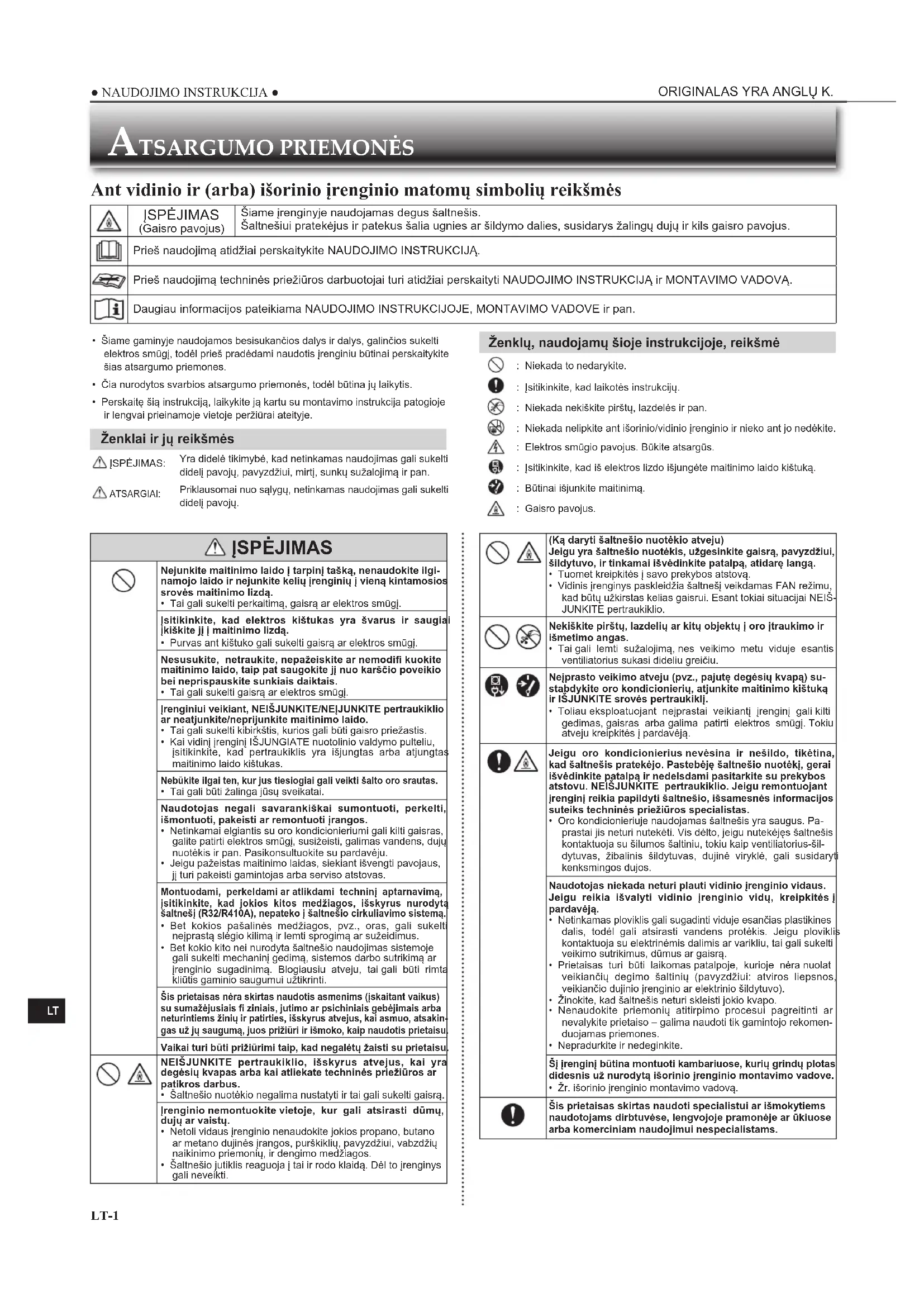 | A | ISPÉJIMAS (Gaisro pavojus) | Šiame jrenginyje naudiojamas degus šaltnešis. Šaltnešiui pratekějus ir patekus šalia ugnies ar šildymo dalies, susidarys Žalingú duju ir kils gaisro pavojus. |